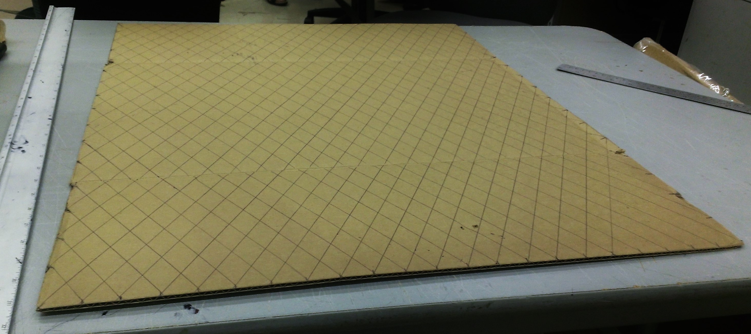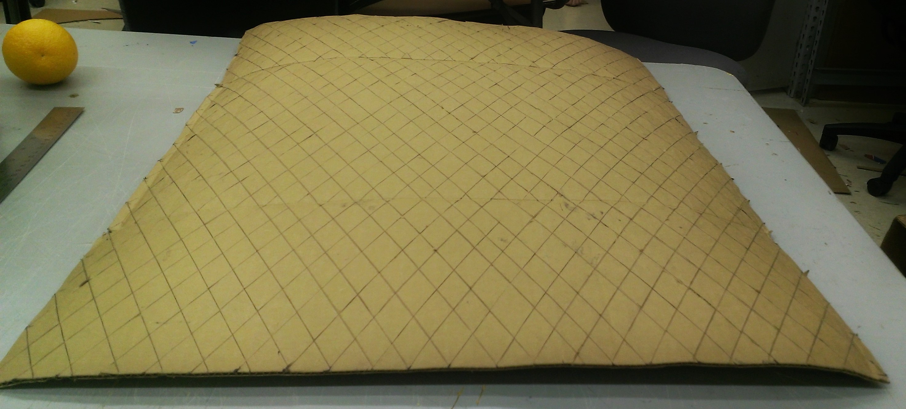 The quilting effect is pretty cool and, though time-intensive, straightforward. To match the angles of the equilateral triangles in the base, I used 60o angles for my quilting, in opposite directions, measured from the edge of the sheet. Once I drew out a grid of evenly spaced lines at the 60o angles, I scored the cardboard along each line.