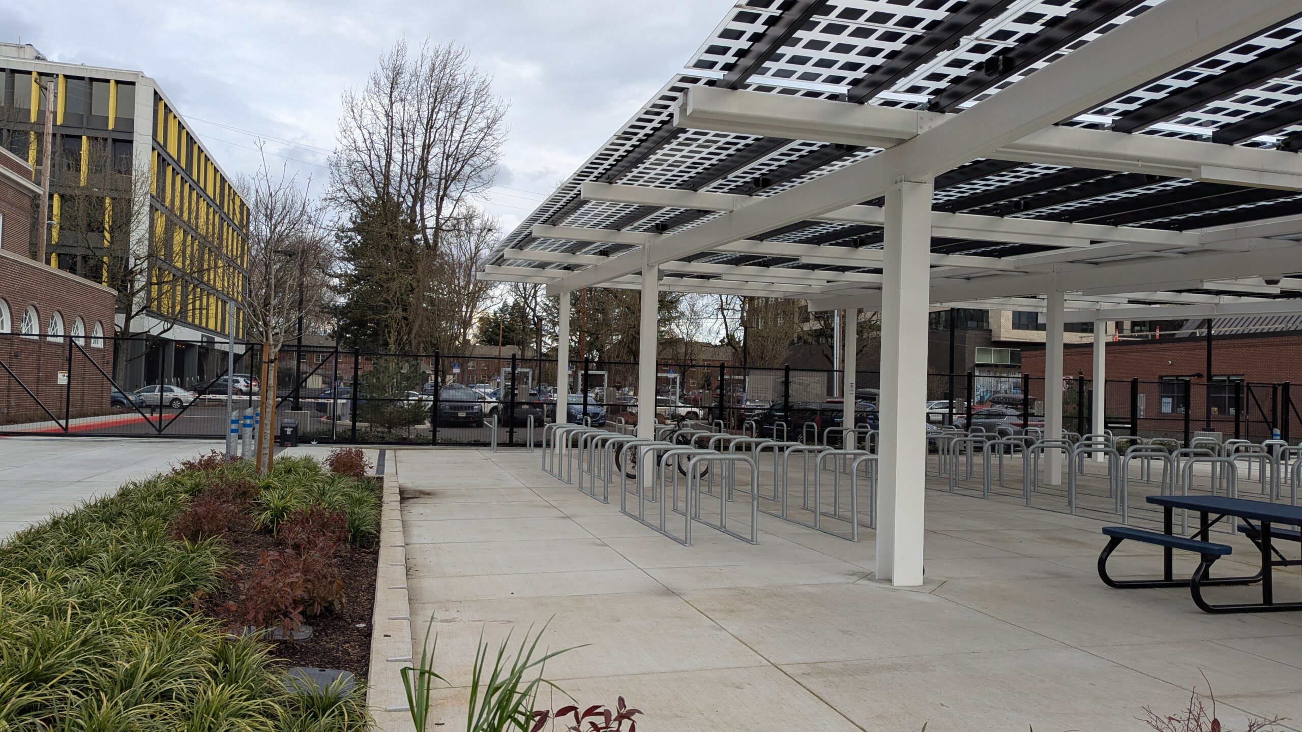 The automotive program now features a continuous frontage along the south edge of the CTE courtyard, with roll-up doors and covered outdoor workspace in every bay.Translucent solar photovoltaic panels offer weather protection to the bike parking and outdoor classroom spaces at the east end of the CTE courtyard.Covered bike parking in the CTE courtyard.Photovoltaic bike pavilion in the CTE courtyard.The south façade of the new north CTE & classroom building features a cascading brise soliel of solar photovoltaic panels, along with large canopies to form covered outdoor workspace.The brise soleil maintains views out to the courtyard and shades south-facing windows from intense summer sun, while capturing solar heat from lower winter sun. The central commons building was last to be erected, celebrated here with the “topping out” steel beam prepared for placement along the roof of the eastern edge facing the CTE courtyard. The east façade of the commons building features banners highlighting the variety of CTE programs. Canopies here cover the loading dock and trash bins, a reminder that the CTE courtyard is a highly functional, working space.View across the automotive program canopies to the north building, where the Construction, Math Tech, and Manufacturing shops each have dedicated outdoor workspace. View across the CTE courtyard and bike parking canopy to the new north building and the historic foundry building.