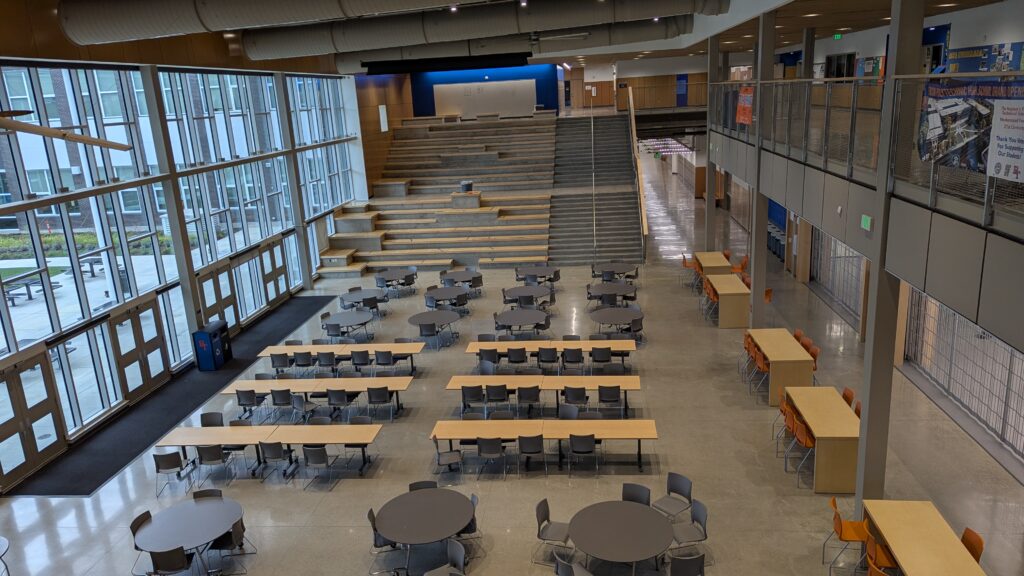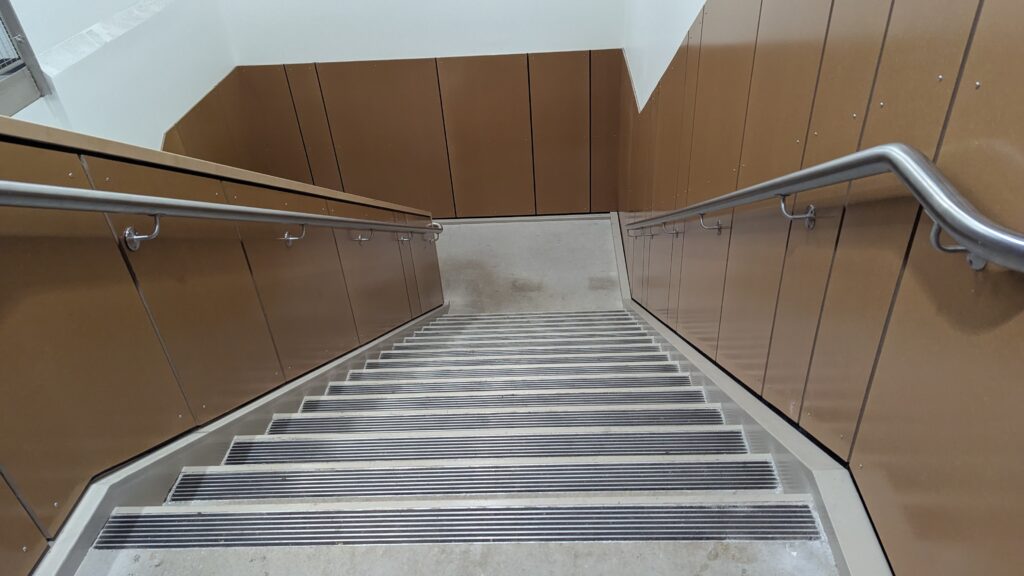 Learning stair and student commons.The main learning stair in the central commons features the salvaged main gym floor with the center court logo.A smaller learning stair rises at the east end of the south building, at its transition to the 1991 radio building.The learning stairs are predominantly concrete with accents in stainless steel and maple matching the salvaged gym floors.Seating risers in the south building learning stair also feature sections of salvaged gym floor.The smaller double-height space in the south building aligns with its connection across the CTE courtyard to the foundry building.MDF wainscoting wraps down the new stair wells.Exposed structure with limited MEP systems provides a tall flex space at the west end of the south building’s upper level. A graphical map of Portland screens the glazed entry to the new media center. This had been done with glass block in the previous, postmodern media center building.The new media center is arranged around a large open space with views out to NE Irving St.
