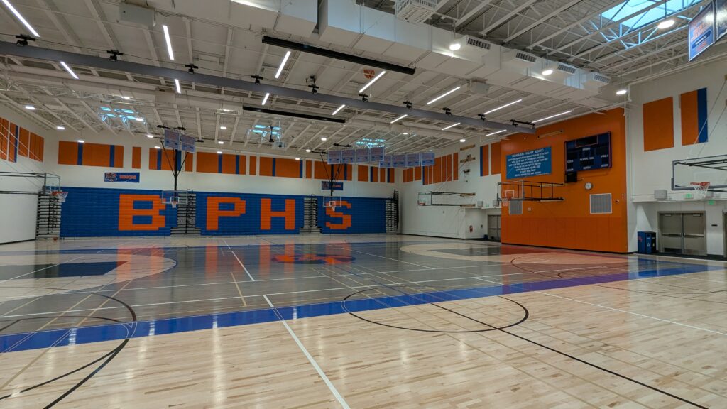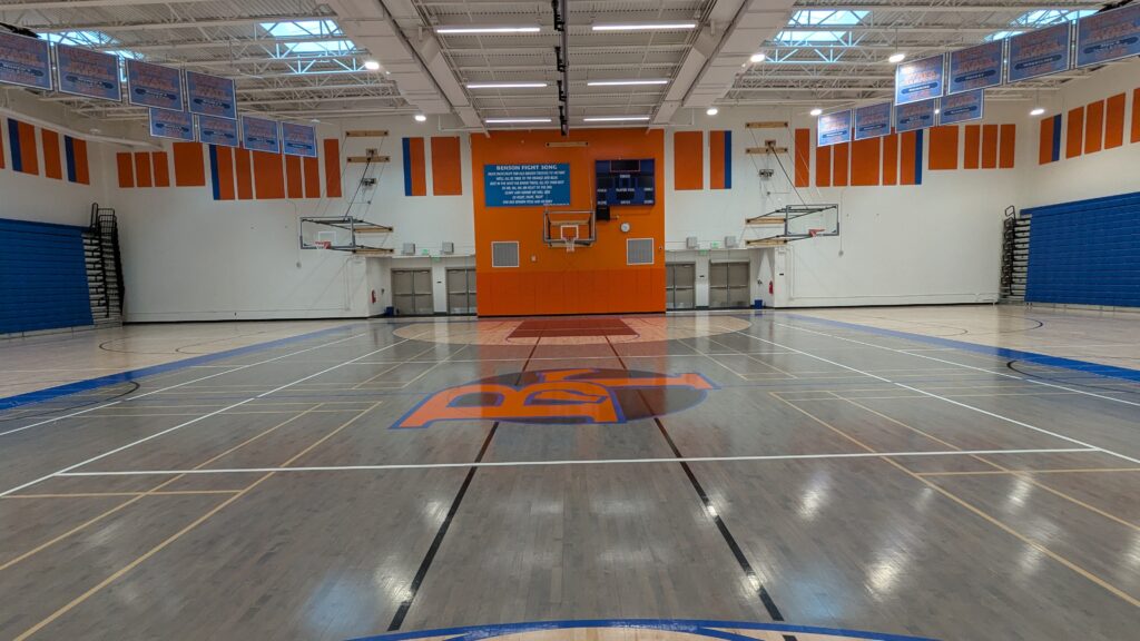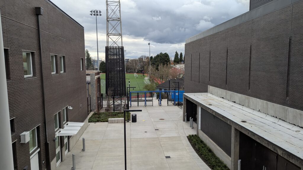 View south across the auxiliary gym to the Portland Tennis Center.The auxiliary gym (formerly “old” gym) retains its original form and character, with new finishes including a new maple floor.Five large mechanical ducts are threaded into the roof trusses between the skylights to bring modern heating, cooling, and ventilation into the space.Unlike the auditorium, the historic gym is of unreinforced masonry construction and required seismic bracing along the perimeter walls. New steel columns along each window jamb are painted white and blend in with the exposed original roof trusses.View across the auxiliary gym from the running track entry.View across the auxiliary gym to the 1916 administraion building.New railings line the perimeter of the track, which was overlaid with a concrete slab and new running surface as part of the seismic retrofit. The banked corners didn’t make it back, but a mix of new and salvaged gym floor wainscoting recall the original finishes.View of the historic main entry through a restored multi-lite arched steel window along the running track.The historic stair west of the gym remains with its view out to the main entry courtyard.A new stair opposite the historic stair brings the west end of the gym building into compliance with current code. It features and exposed concrete shear wall and other elements of the seismic upgrade, similar to the opposite back of house stair in the auditorium building.The main gym retains the original roof trusses and girders, with new acoustical metal deck, MEP systems, and a significantly enlarged mechanical penthouse.Large skylights, acoustical roof decking, and white paint with bold accents dramatically transform the 1964 gym.The finished main gymnasium in spring 2025.The main gym floor features a custom dark stain to define the central court.The new enclosure connecting the upper levels of the main administration and gymnasium buildings features a large glass wall recalling what was previously an open air view.