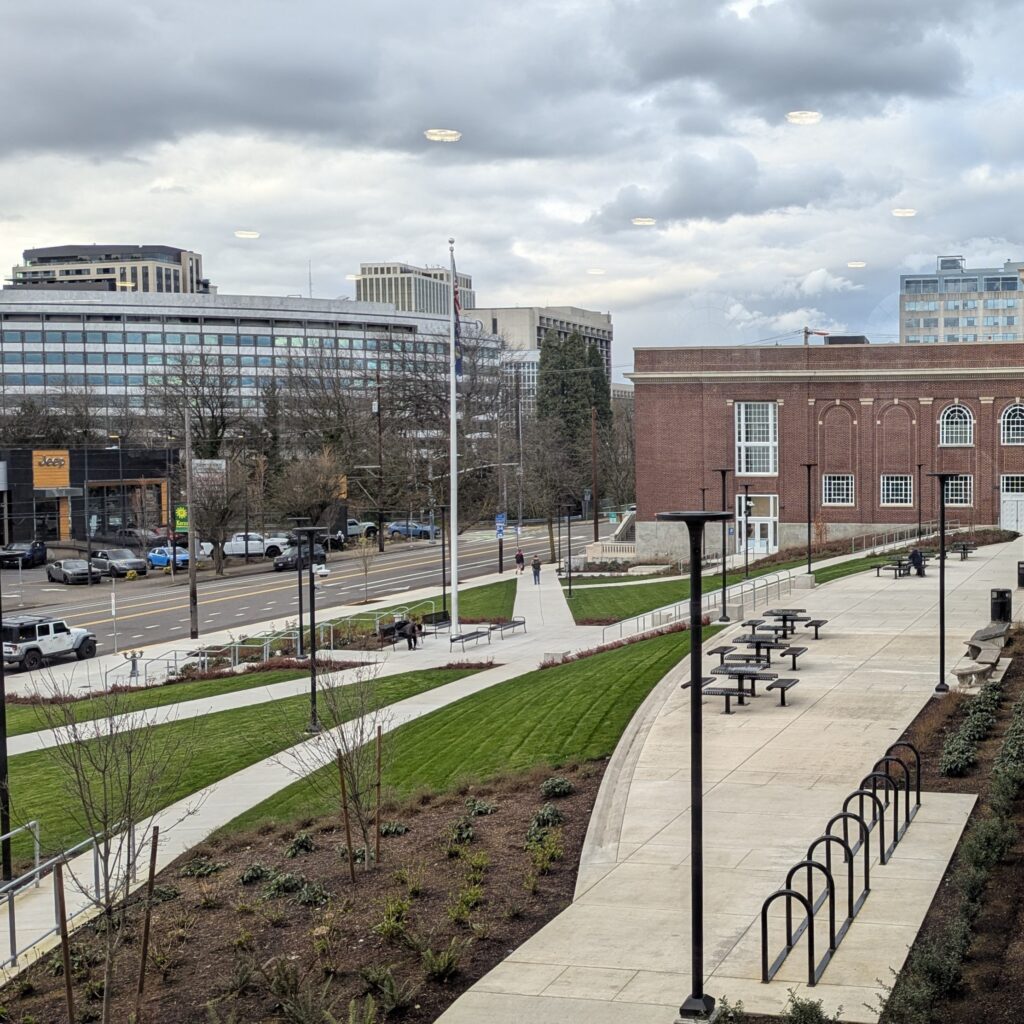 A broader porch at the level 1 elevation enables gathering outside the main entry, where the berm previously restricted usable space.Gently sloped lawns fill the spaces between the pathways, recalling the open design of the historic entry courtyard.Shrub and tree plantings now frame the central pathways and lawns, adding softness and depth to the entry sequence.At ground level, the courtyard retains its simple historic expression, receding from the surrounding architecture.Subtle depressions in the entry courtyard paving come alive in the rain as water conveyance gutters, a visual expression of civil engineering design.Steps line the south end of the entry courtyard for direct access to the gym entries. A glazed enclosure finally links the upper level of the gym directly to the interior of the main building.The west façade of the 1925 gym building features new windows in restored original openings at the lower level classrooms.Gently sloping ramps replaced the narrow stair from the south walkway to NE 12th Ave.The south walkway will reopen to public access along the former NE Glisan St. right of way, now with fully accessible ramps.Trees and smaller shrubs will offer more variety than the previous large shrubs along the perimeter of the site.The restored auxiliary gym south façade includes consistently infilled basement window openings and new egress stairs.Cast stone veneer reminiscent of the historic terra cotta now clearly defines the transitions between historic and contemporary facades around the campus.The radio tower has been structurally retrofitted and painted white, with confirmation that it is just under the height that would require the previous, FAA-mandated striped color scheme.The 1964 main gymnasium has long been despised for its incongruous setting against the historic campus buildings. However, its useful location and size warranted inclusion in the modernized campus. A new brick finish matches the new buildings on campus and integrates extensive structural and thermal improvements.The main gym seismic upgrade used a creative approach to strengthen the existing solid concrete walls instead of replacing them. Vertical steel strongbacks provide out-of-plane support halfway between each original column. Steel angles stitch the tilt-up panels together along the height of each column to create the behavior of a monolithic wall. A concrete base ties the tilt-up panels to the basement wall to complete the load path, and support the brick overcladding that integrates these improvements and exterior insulation into the final design. The south courtyard between the main gym and the south shop wing and radio tower now features a direct connection from the central commons to Buckman Park, as well as the gym and restrooms accessible from the exterior. Solar panels float above the restored south shop wing façade, continuing beyond the radio tower screen that will soon feature a painted identity sign facing Buckman Park.A new ramp and stairs link Buckman Park with the Benson Tech campus in a collaboration between PPS and PP&R.The south shop wing’s facade has been dramatically restored with the removal of 1960 window infills and reinstallation of windows in the original proportions.Two arched opening bays remained intact but had been filled with brick inside the arch. Arched “fan” windows from the courtyard were reworked to replicate the historic transoms in these bays with new fixed doors. Two similar arched bays once existed on the mirrored NE Irving St. façade, but were rectangularized in its 1958 renovation and remain in that configuration. Can you find them?The restored south wing façade maintains an alternating blend of new and historic buildings along the long campus perimeter.The original walls of the north and south shop wings are all that remain of the original buildings. However, much of the original building interiors, including their structure, had already been replaced during previous renovations.The steel frames of the new CTE & classroom buildings highlight the changes in construction technology since the original shop buildings were constructed of unreinforced masonry bearing walls in the early 20th centrury.The south two-story classroom & CTE building steps back from the historic façade, with its cascading solar brise soleil and a green roof that we’ll see later.Car parking has been consolidated into two small lots, buffering the CTE courtyard from NE 15th Ave. The single-story, fan-lite-lined mass that remains along the south of the foundry building reminds us of the condition what once lined the entire eastern courtyard, breaking to facilitate large roll-up doors and outdoor workspace at the new buildings beyond.