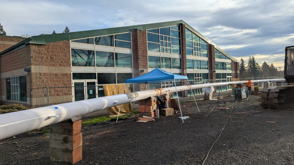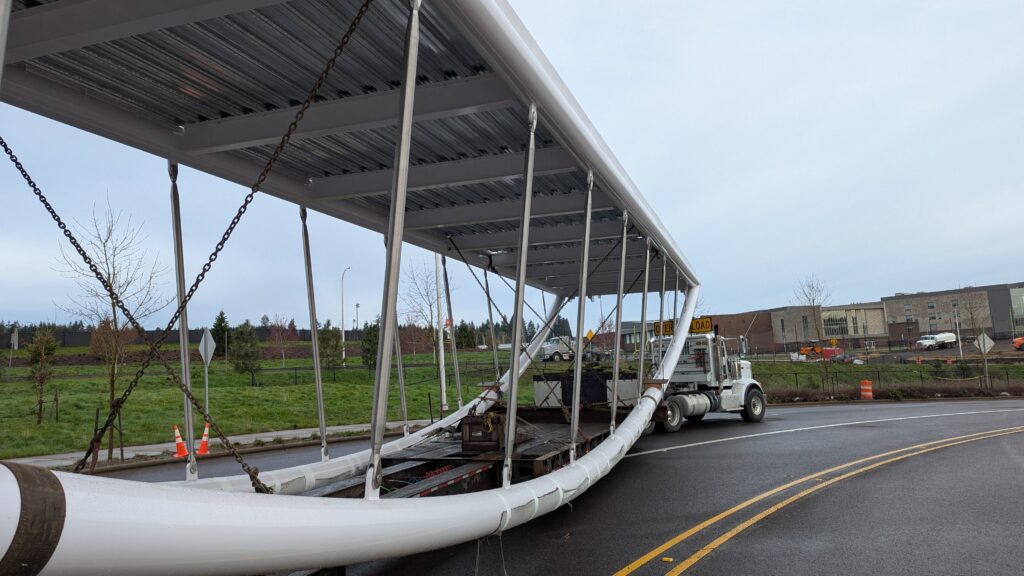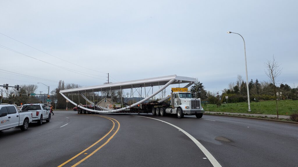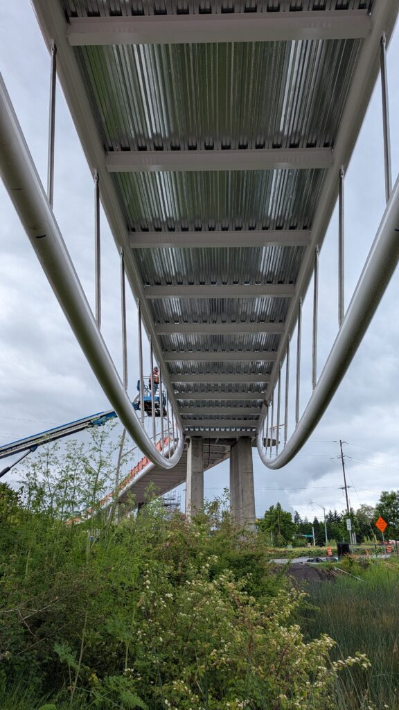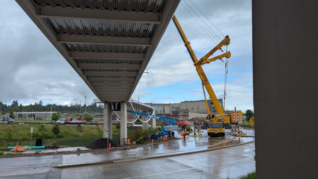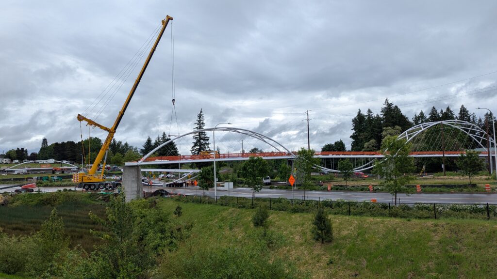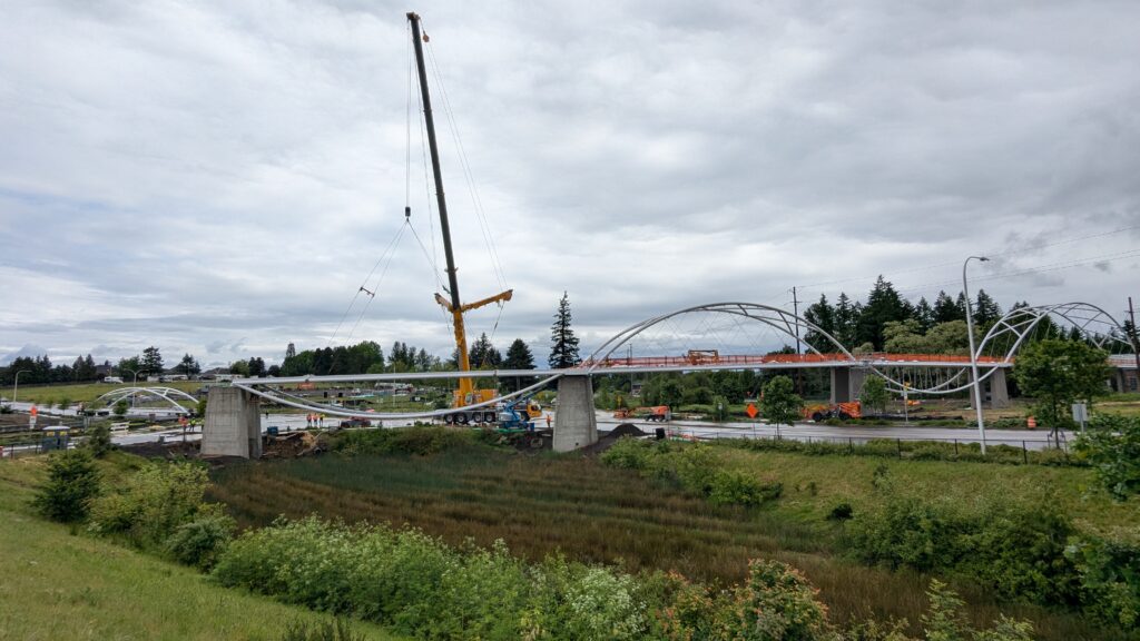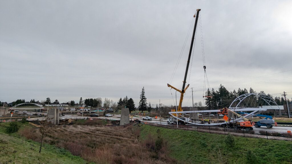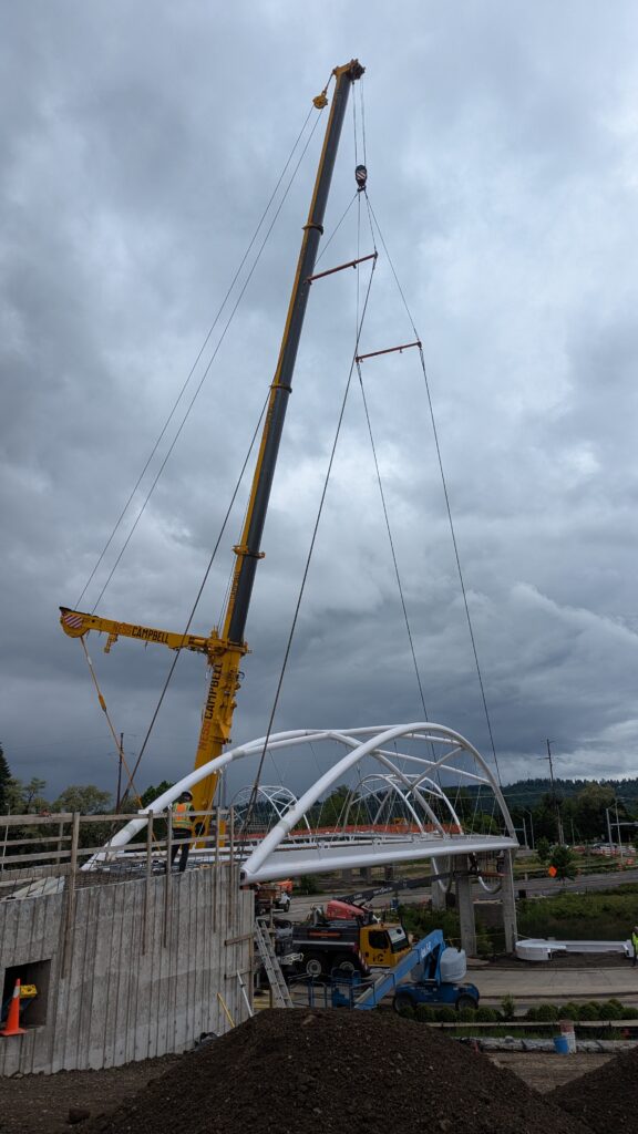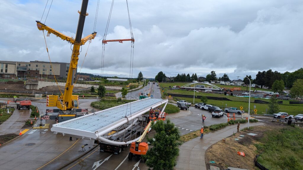 The main bridge span over Highway 99W was first to be installed, on March 8, 2025. Extensive planning went into the highway closure and detour to Elwert Rd, beginning during the bridge design and continuing through the work in collaboration with ODOT, Washington County, the City of Sherwood police department, and other local partners. While the plans called for a full weekend closure from 9pm Friday through 5am Monday, crews completed the work and reopened the highway in just 24 hours. Span 5 is the largest on the bridge with a 194-foot span and 39-foot height at the work points. All spans have their trusses tilted outward at a 5-degree angle, creating a unique form with apparent shape-shifting across viewing angles.