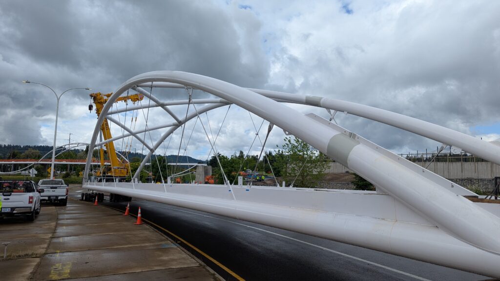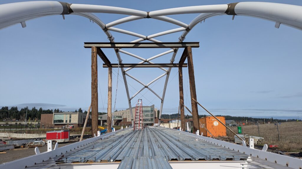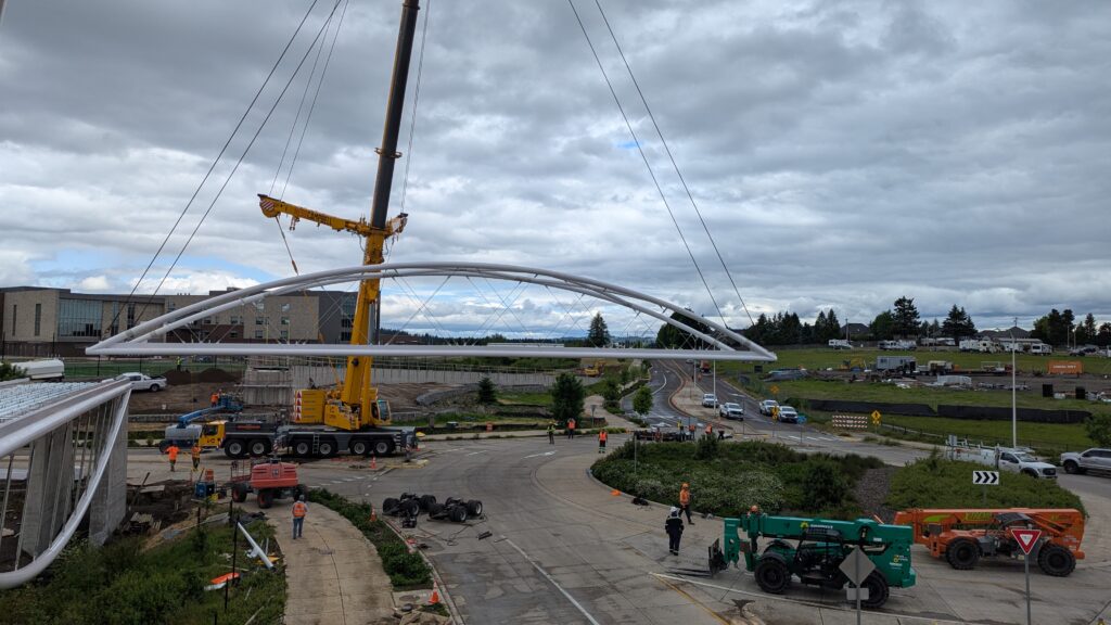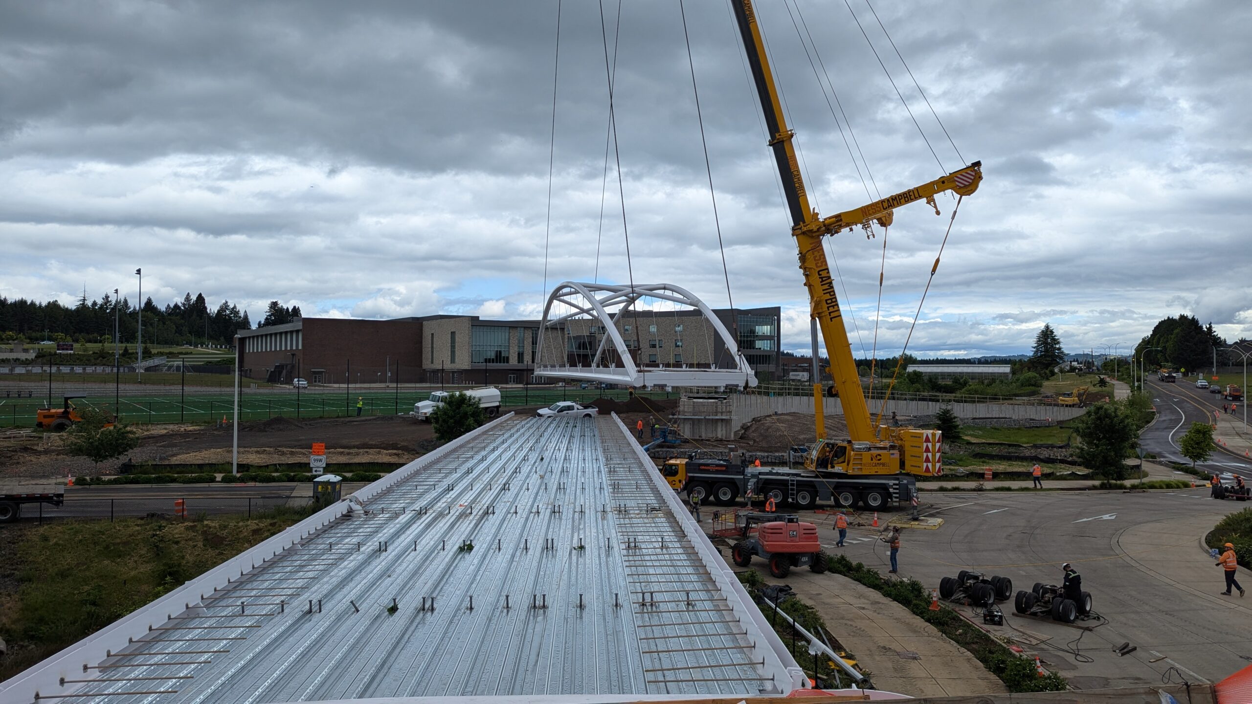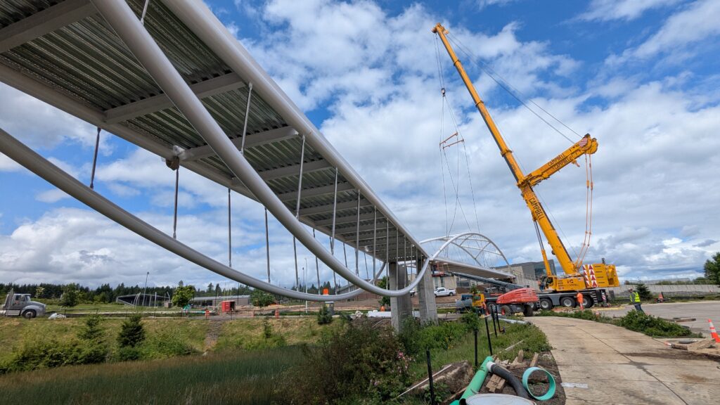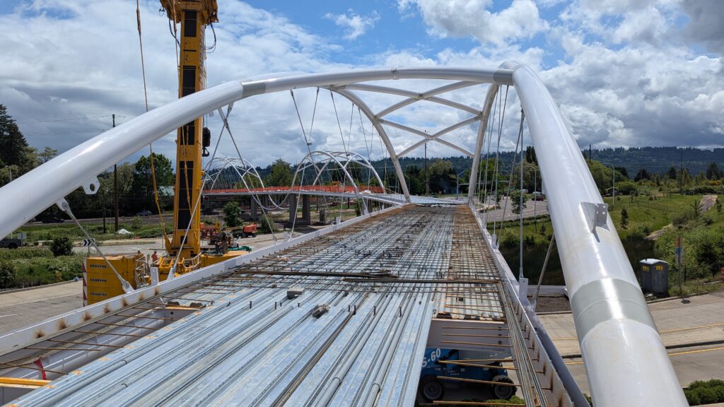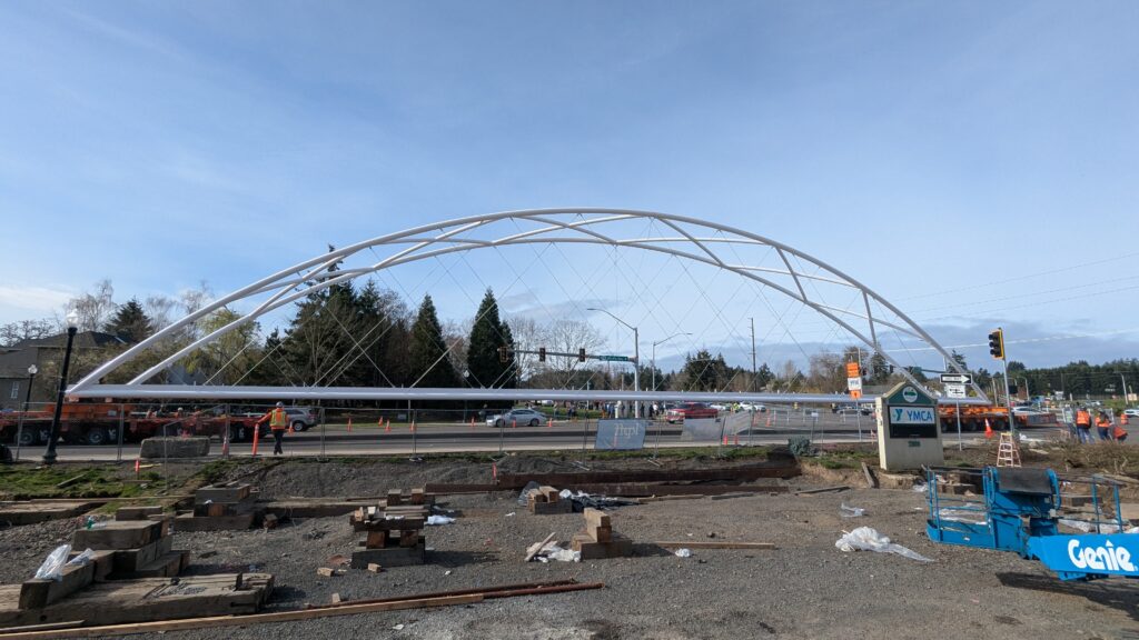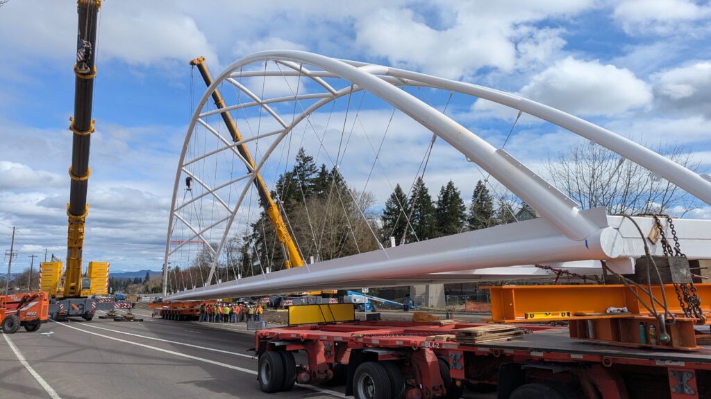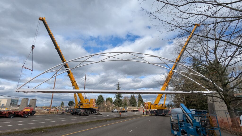 The first arch is welded together outside of the YMCA pool.Steel framing for the span 5 bridge deck is assembled along Sunset Blvd.The first arch for span 5 is lifted into place on a temporary shoring tower.The steel deck edge assembly features a smooth exterior fascia articulated by alternating diagonal connection plates for the tension rods and vertical railing connection plates.The bridge scale suddenly becomes apparent when the first arch is placed vertically, revealing that it’s taller and longer than the adjacent YMCA pool façade.A large mobile crane wraps up assembly of the steel cross bracing holding the two arches together on span 5.Metal form decking is installed on span 5, offering the first glimpse of the future on-bridge experience. Welders attach the curved diagonal cross bracing to the arches on span 5.Span 5 assembly nears completion in its temporary home in the future footprint of the east approach ramps. Architectural stainless steel tension rods are woven between each arch and the bridge deck in a uniform diagonal grid.As the stainless steel rods are tensioned, span 5 becomes a self-supporting truss spanning 194 feet and ready to move into its final position over Highway 99W.Final painting touch ups wrap up ahead of the span 5 erection.All five bridge spans feature a five-degree outward tilt to the trusses, creating a unique and dynamic form viewed in the round.The curved cross bracing between the arches enables a delicately slender arch proportion on span 5 and reflects the woven tension rod patterning.The first arch for span 3 is lifted into place, with crews carefully threading a conduit through the structure to conceal electrical and low voltage systems. Span 3 continues assembly in the same sequence as span 5, in the contractor’s staging yard on the Elk’s Lodge hill overlooking the project site.Span 3 was assembled on axis with the angled end of the north wing of Sherwood High School.Span 4 was fully assembled in Thompson Metal Fab’s shop in Vancouver, WA. All of the steel for the project was fabricated and painted here, with final assembly of spans 1, 3, and 5 completed in the field.