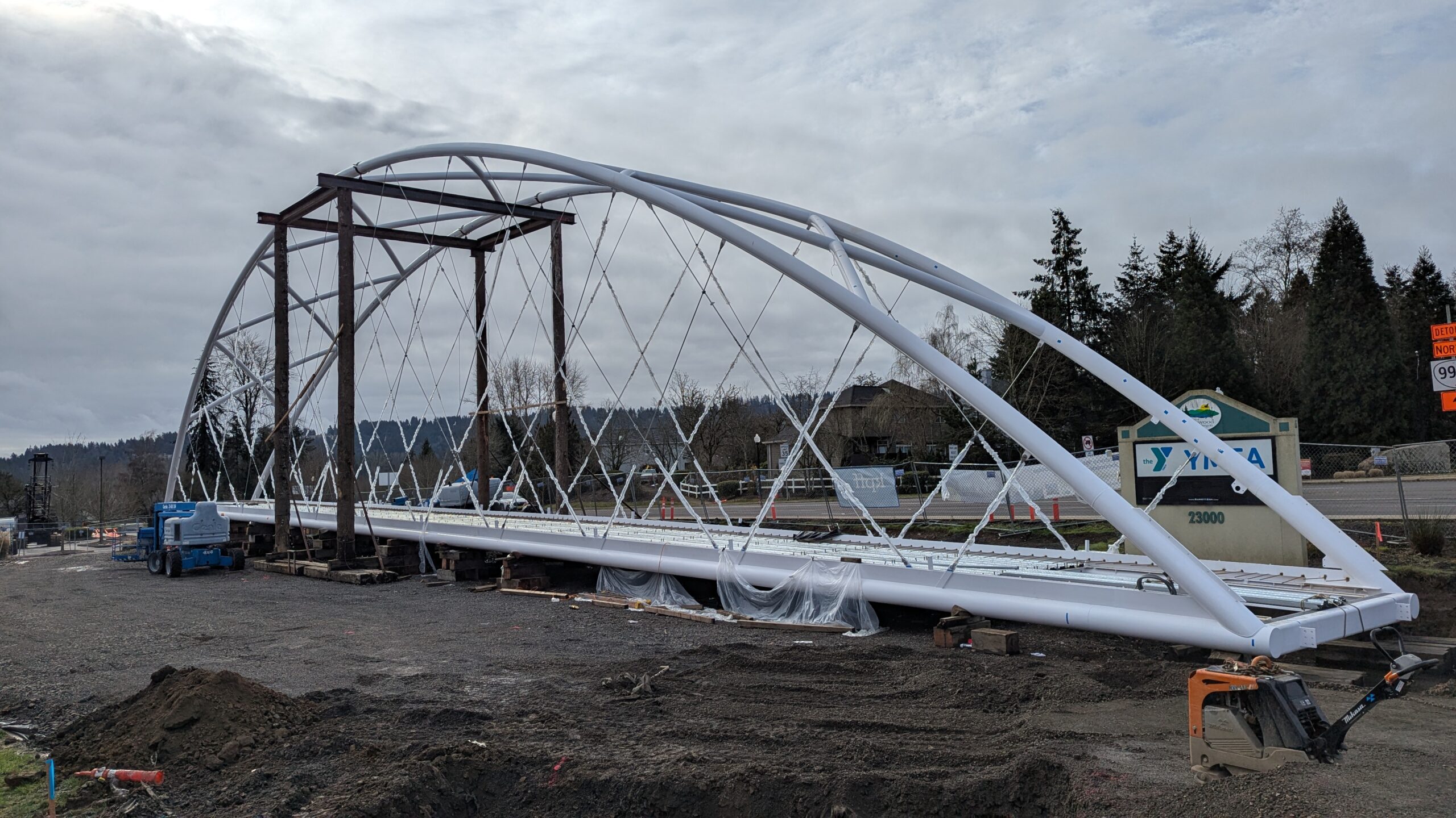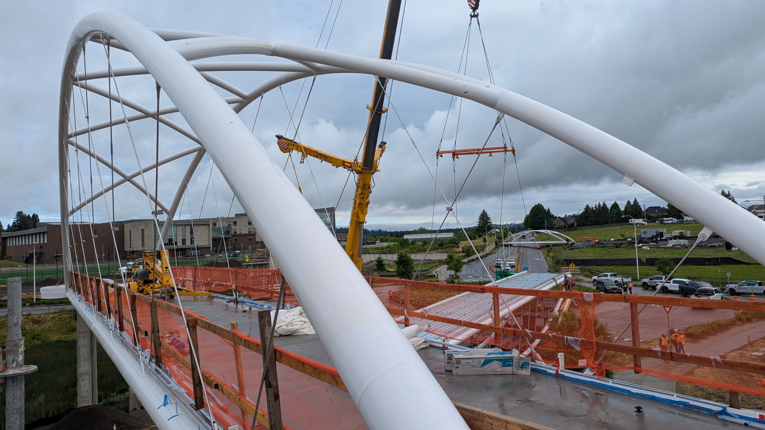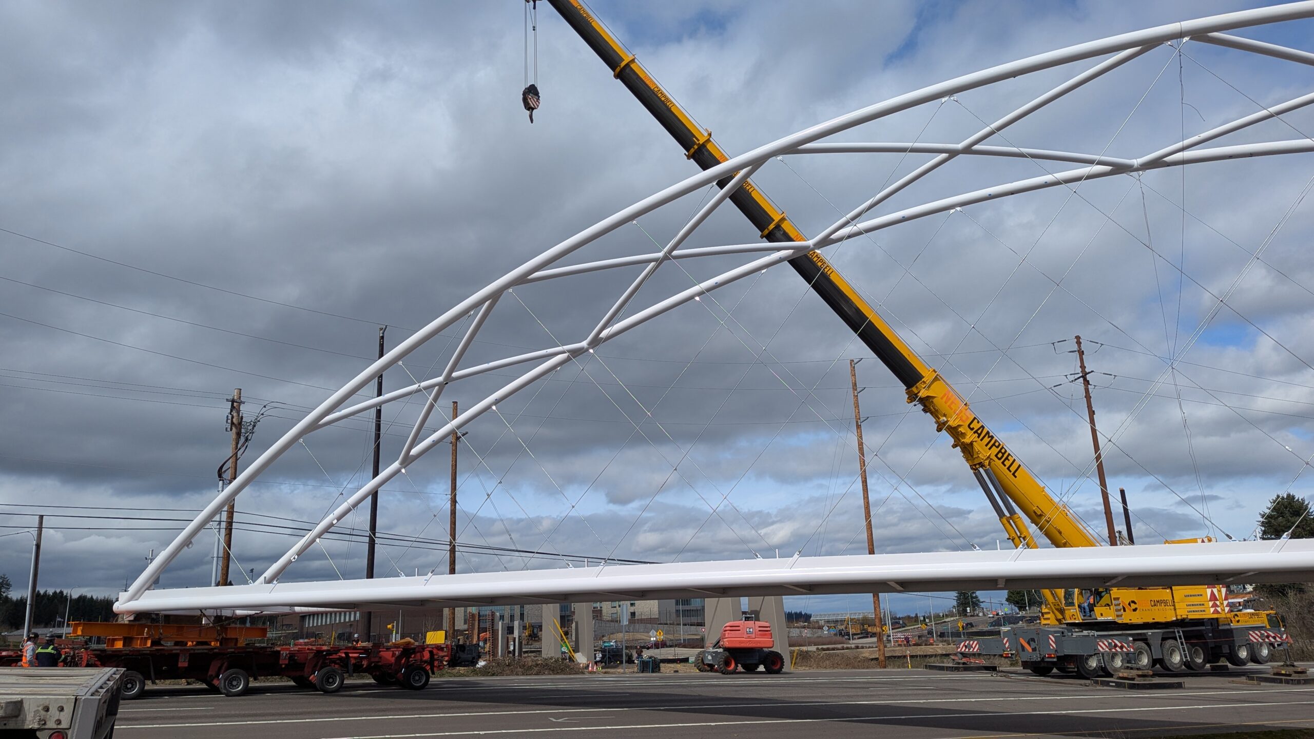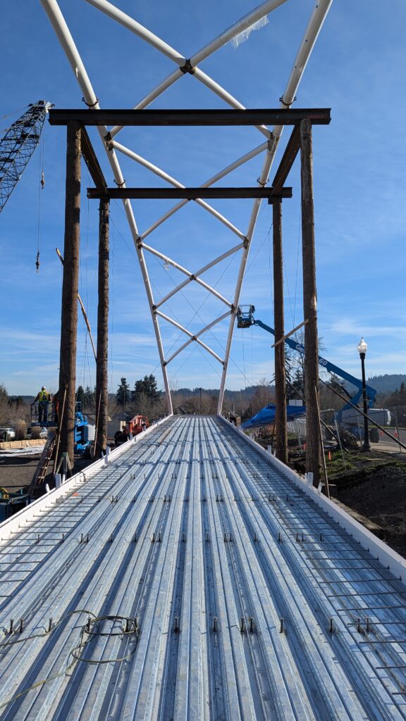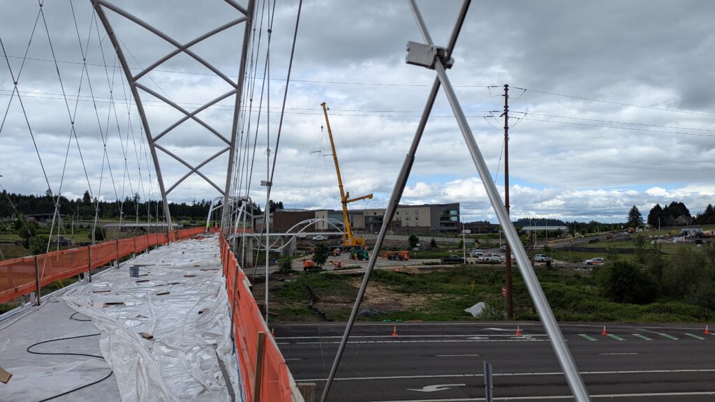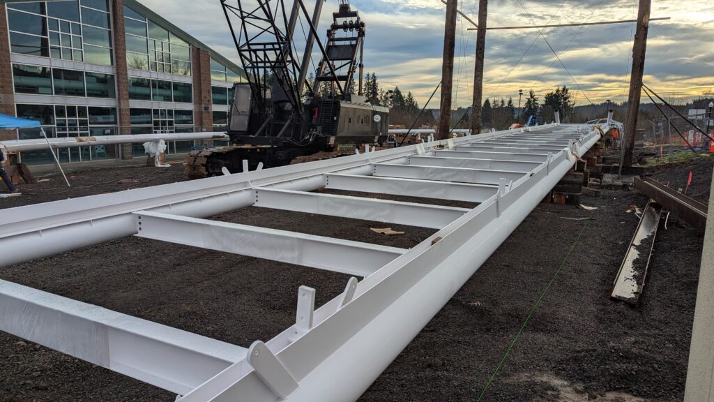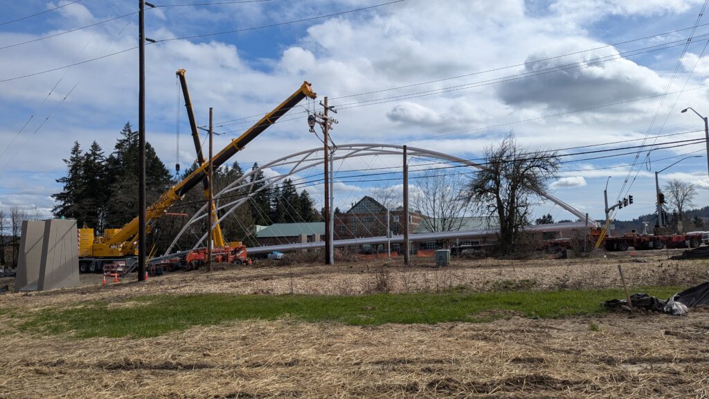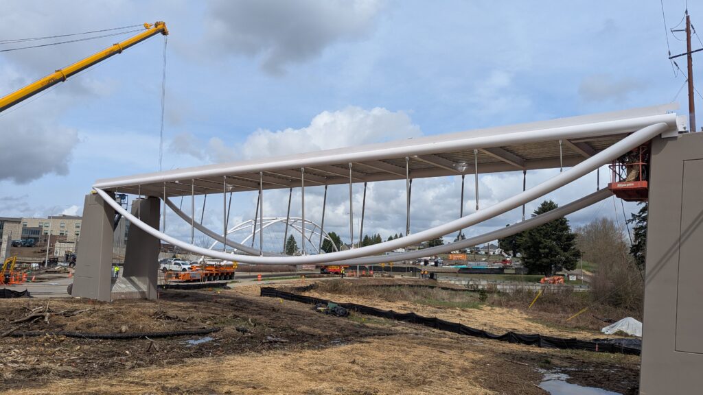 The first arch is welded together outside of the YMCA pool.Steel framing for the span 5 bridge deck is assembled along Sunset Blvd.The first arch for span 5 is lifted into place on a temporary shoring tower.The steel deck edge assembly features a smooth exterior fascia articulated by alternating diagonal connection plates for the tension rods and vertical railing connection plates.The bridge scale suddenly becomes apparent when the first arch is placed vertically, revealing that it’s taller and longer than the adjacent YMCA pool façade.A large mobile crane wraps up assembly of the steel cross bracing holding the two arches together on span 5.Metal form decking is installed on span 5, offering the first glimpse of the future on-bridge experience. Welders attach the curved diagonal cross bracing to the arches on span 5.Span 5 assembly nears completion in its temporary home in the future footprint of the east approach ramps. Architectural stainless steel tension rods are woven between each arch and the bridge deck in a uniform diagonal grid.As the stainless steel rods are tensioned, span 5 becomes a self-supporting truss spanning 194 feet and ready to move into its final position over Highway 99W.Final painting touch ups wrap up ahead of the span 5 erection.All five bridge spans feature a five-degree outward tilt to the trusses, creating a unique and dynamic form viewed in the round.The curved cross bracing between the arches enables a delicately slender arch proportion on span 5 and reflects the woven tension rod patterning.The first arch for span 3 is lifted into place, with crews carefully threading a conduit through the structure to conceal electrical and low voltage systems. Span 3 continues assembly in the same sequence as span 5, in the contractor’s staging yard on the Elk’s Lodge hill overlooking the project site.Span 3 was assembled on axis with the angled end of the north wing of Sherwood High School.Span 4 was fully assembled in Thompson Metal Fab’s shop in Vancouver, WA. All of the steel for the project was fabricated and painted here, with final assembly of spans 1, 3, and 5 completed in the field.