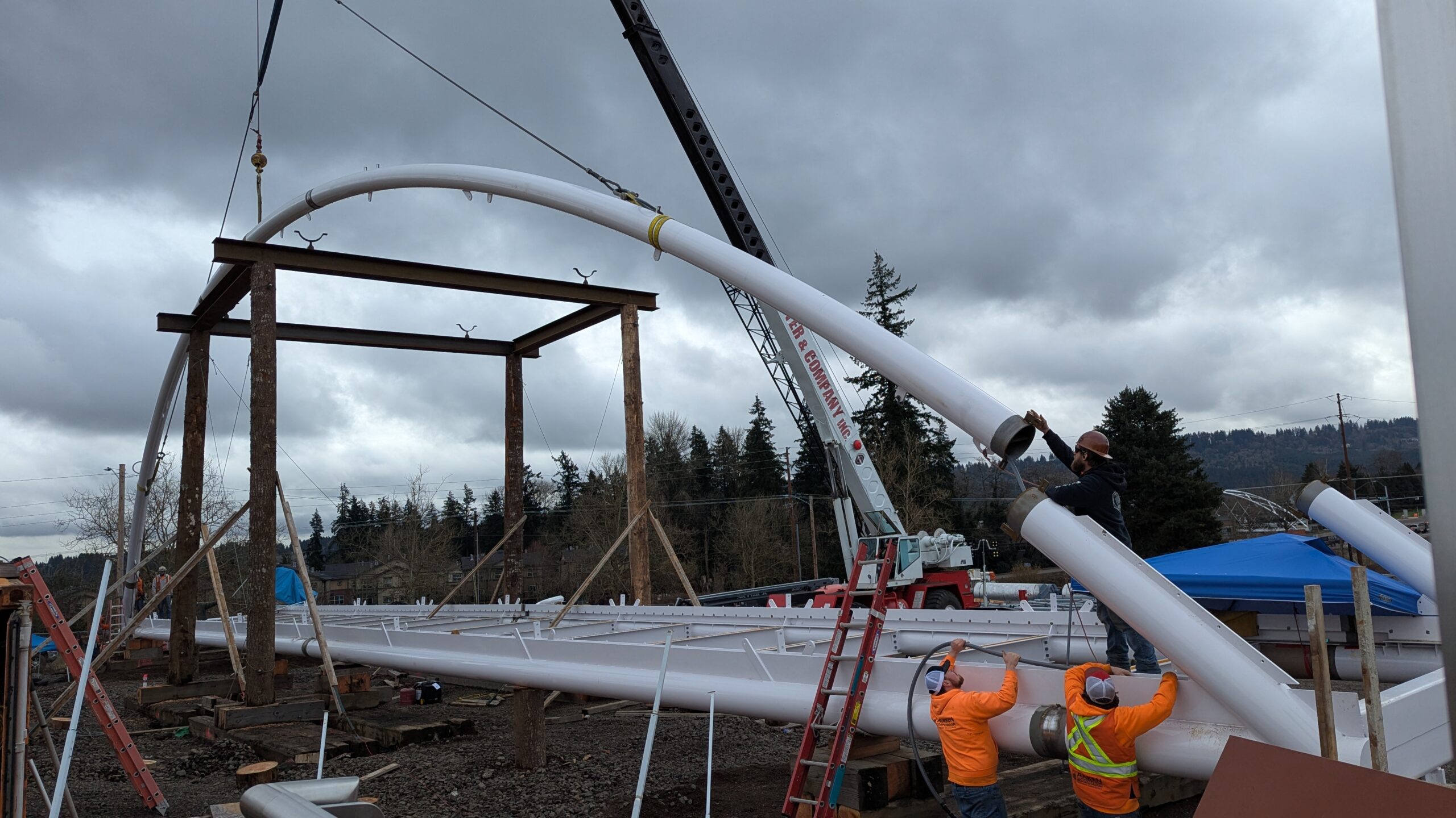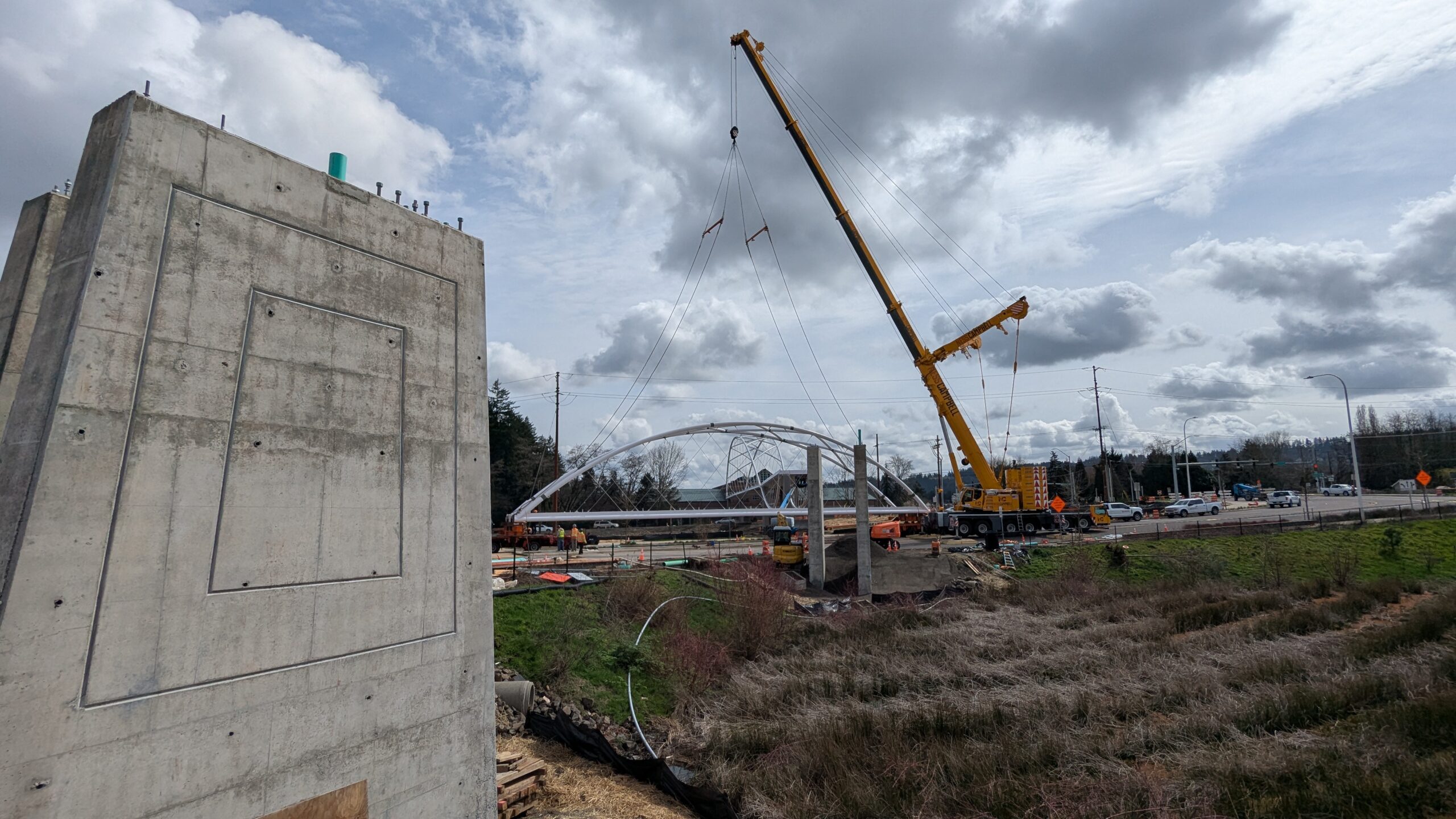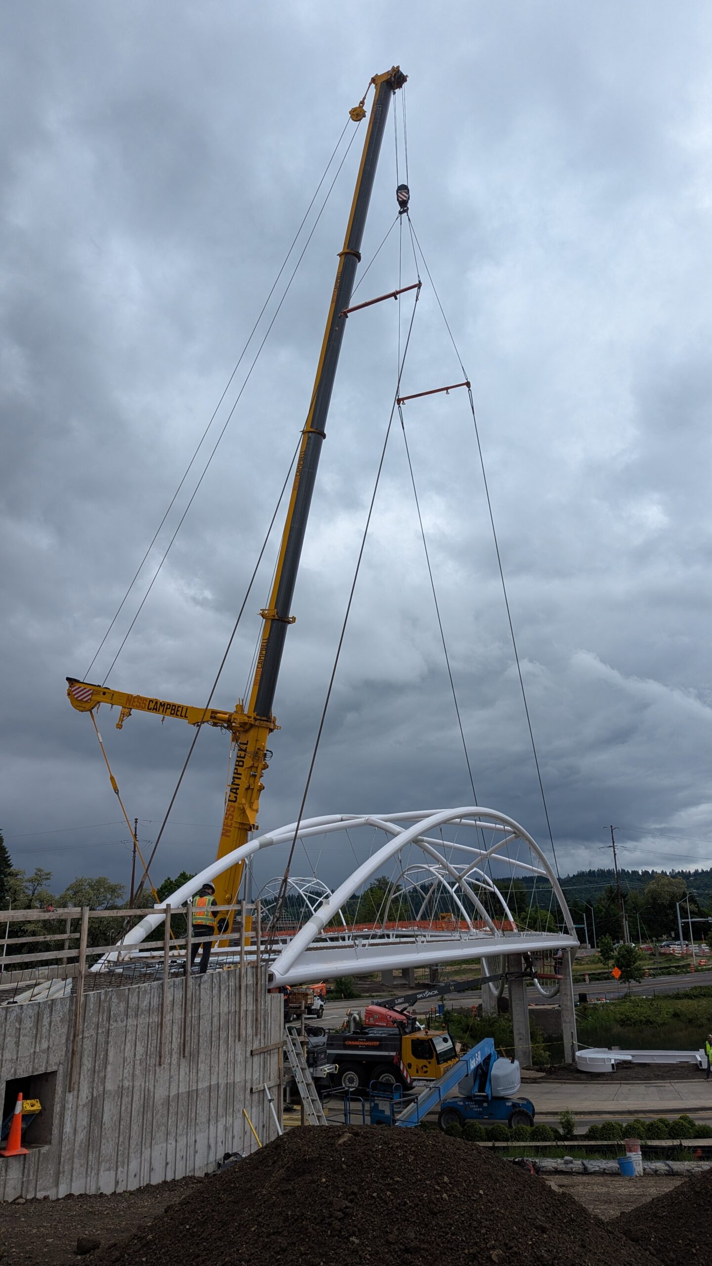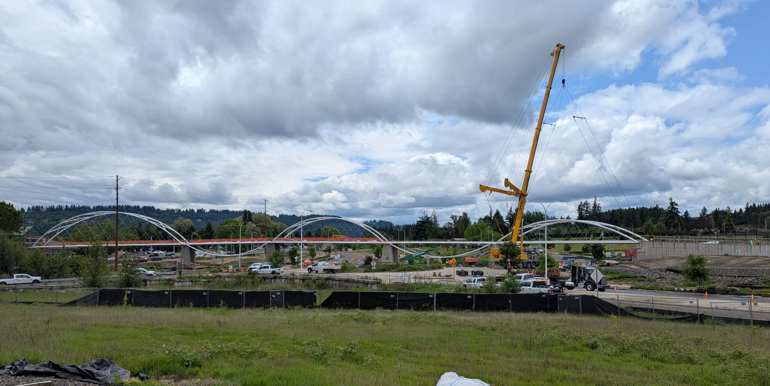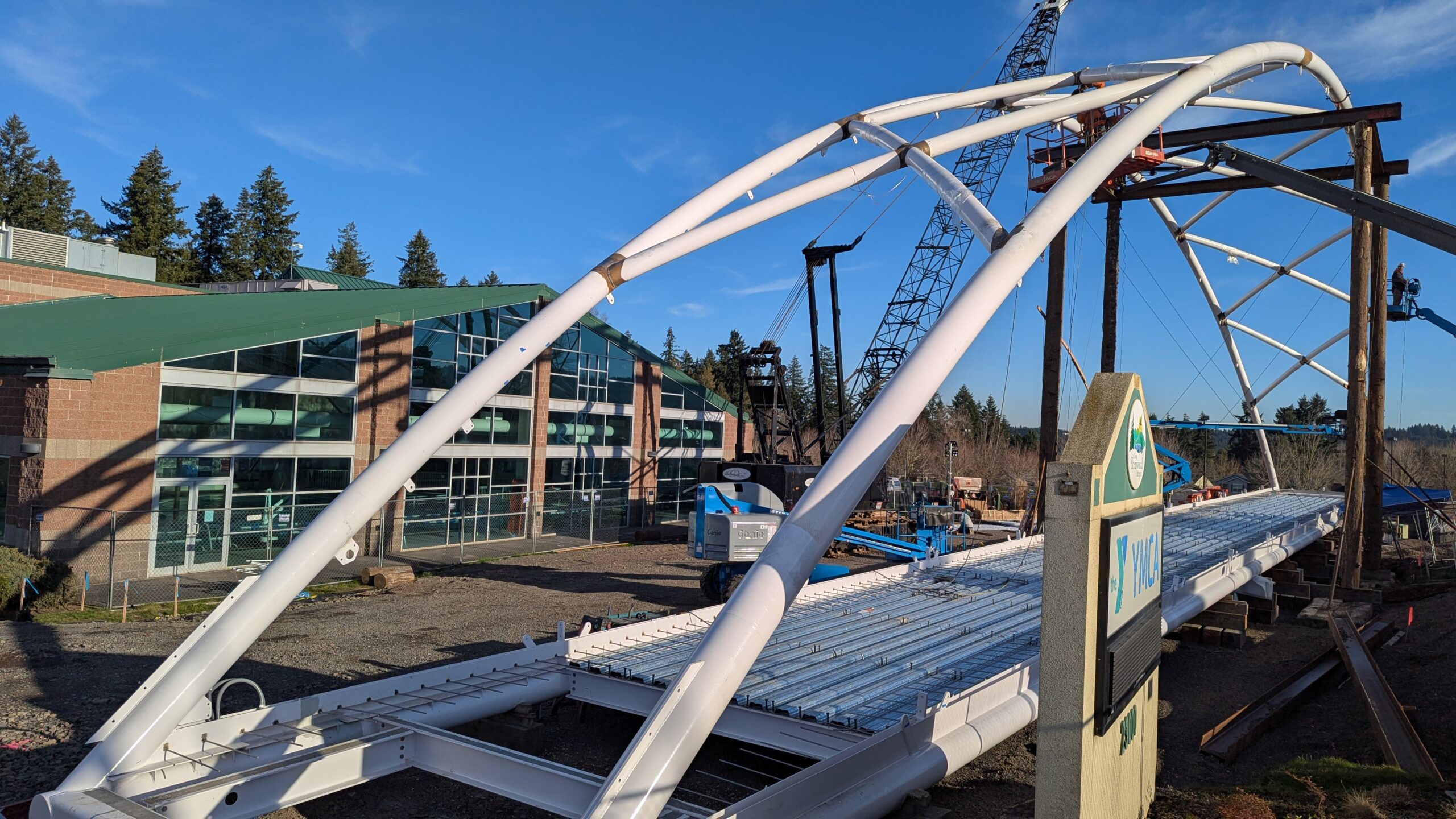 The first arch is welded together outside of the YMCA pool.Steel framing for the span 5 bridge deck is assembled along Sunset Blvd.The first arch for span 5 is lifted into place on a temporary shoring tower.The steel deck edge assembly features a smooth exterior fascia articulated by alternating diagonal connection plates for the tension rods and vertical railing connection plates.The bridge scale suddenly becomes apparent when the first arch is placed vertically, revealing that it’s taller and longer than the adjacent YMCA pool façade.A large mobile crane wraps up assembly of the steel cross bracing holding the two arches together on span 5.Metal form decking is installed on span 5, offering the first glimpse of the future on-bridge experience. Welders attach the curved diagonal cross bracing to the arches on span 5.Span 5 assembly nears completion in its temporary home in the future footprint of the east approach ramps. Architectural stainless steel tension rods are woven between each arch and the bridge deck in a uniform diagonal grid.As the stainless steel rods are tensioned, span 5 becomes a self-supporting truss spanning 194 feet and ready to move into its final position over Highway 99W.Final painting touch ups wrap up ahead of the span 5 erection.All five bridge spans feature a five-degree outward tilt to the trusses, creating a unique and dynamic form viewed in the round.The curved cross bracing between the arches enables a delicately slender arch proportion on span 5 and reflects the woven tension rod patterning.The first arch for span 3 is lifted into place, with crews carefully threading a conduit through the structure to conceal electrical and low voltage systems. Span 3 continues assembly in the same sequence as span 5, in the contractor’s staging yard on the Elk’s Lodge hill overlooking the project site.Span 3 was assembled on axis with the angled end of the north wing of Sherwood High School.Span 4 was fully assembled in Thompson Metal Fab’s shop in Vancouver, WA. All of the steel for the project was fabricated and painted here, with final assembly of spans 1, 3, and 5 completed in the field.