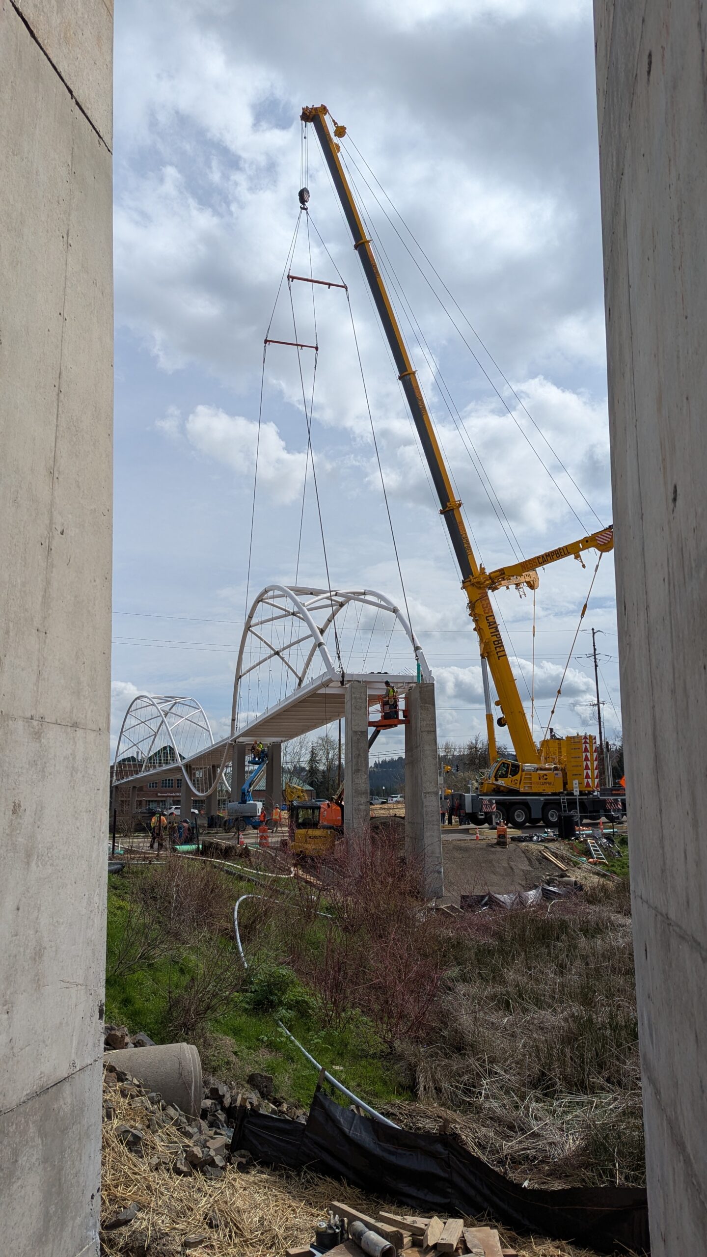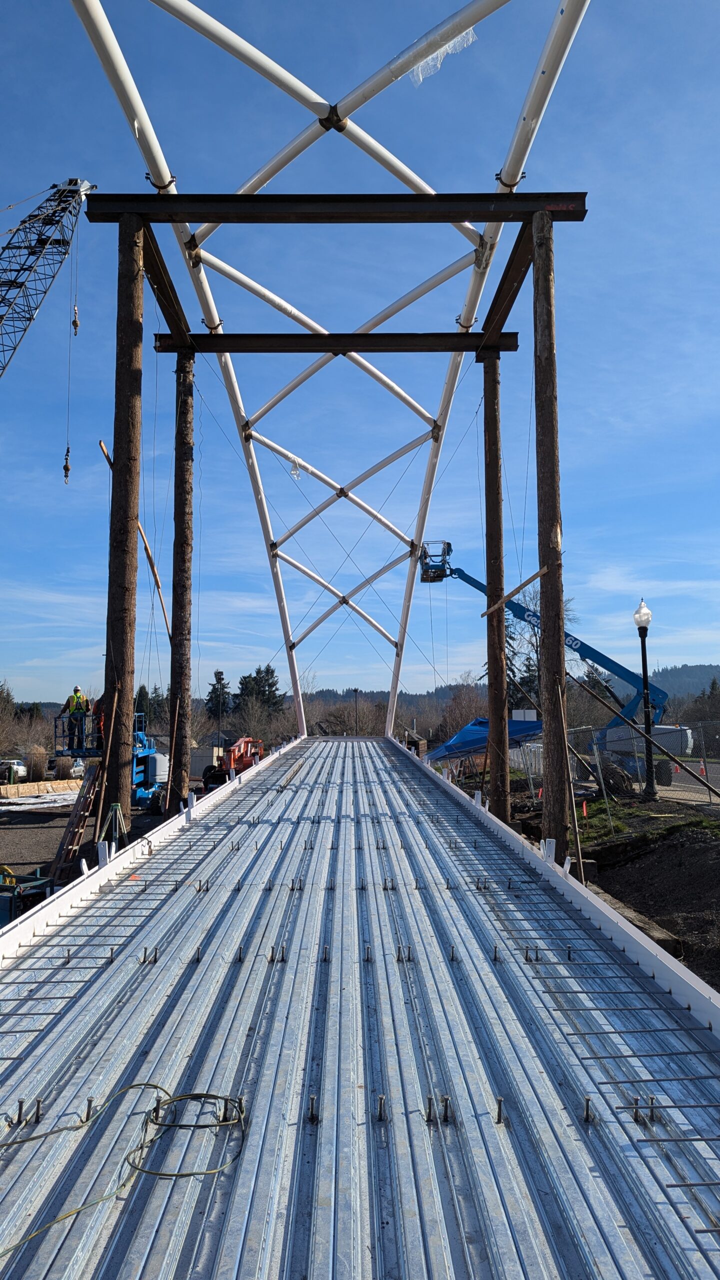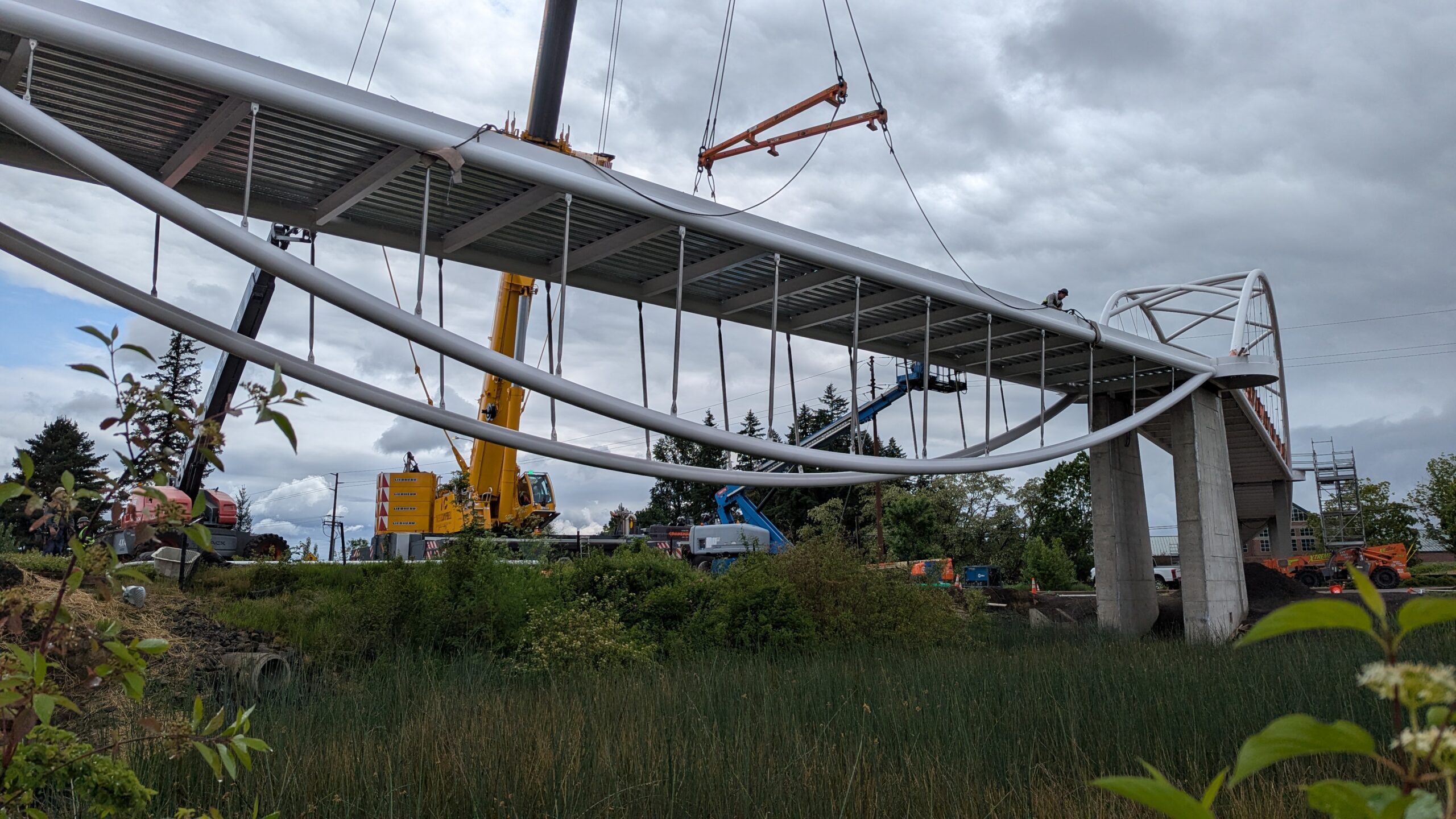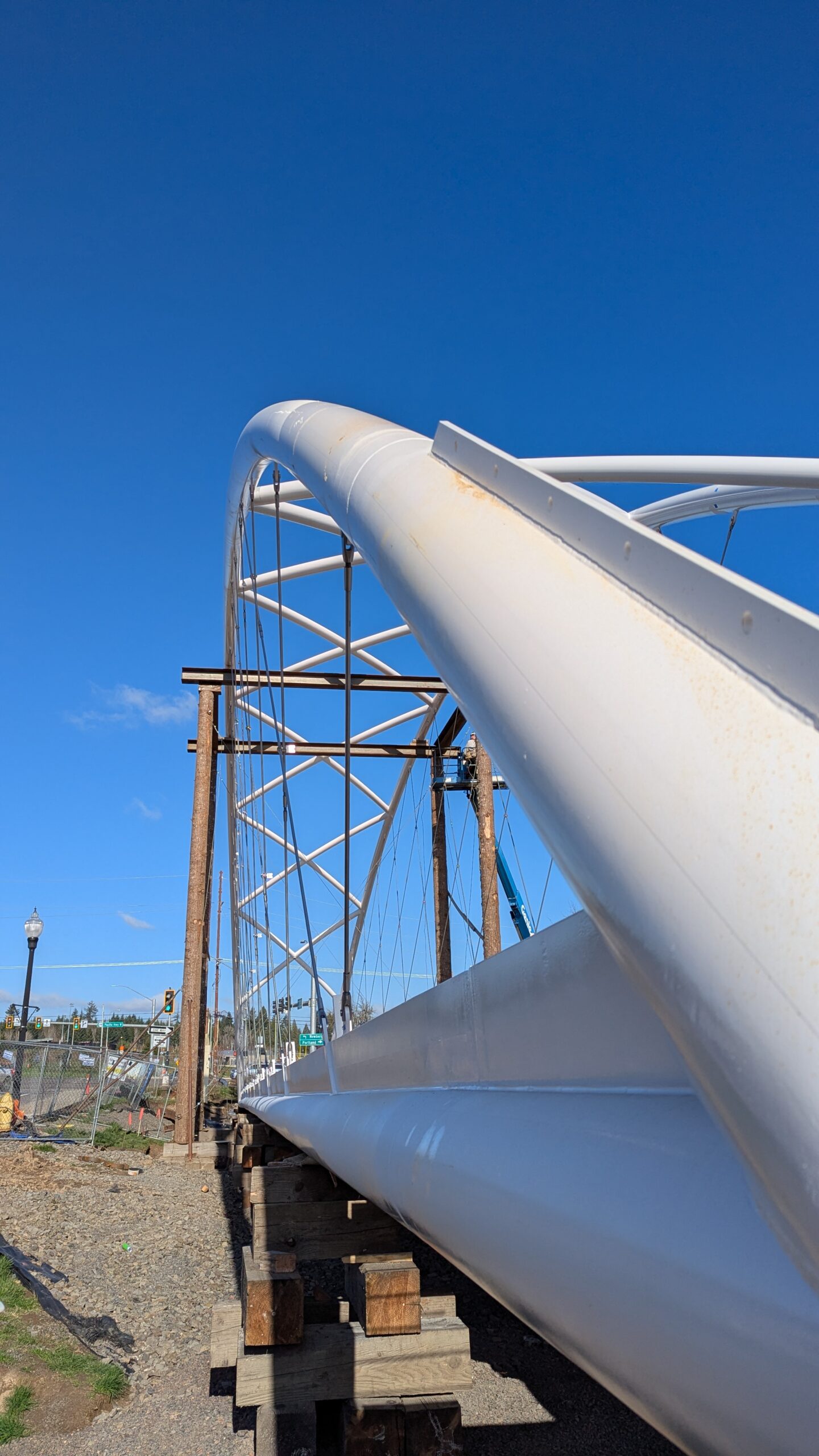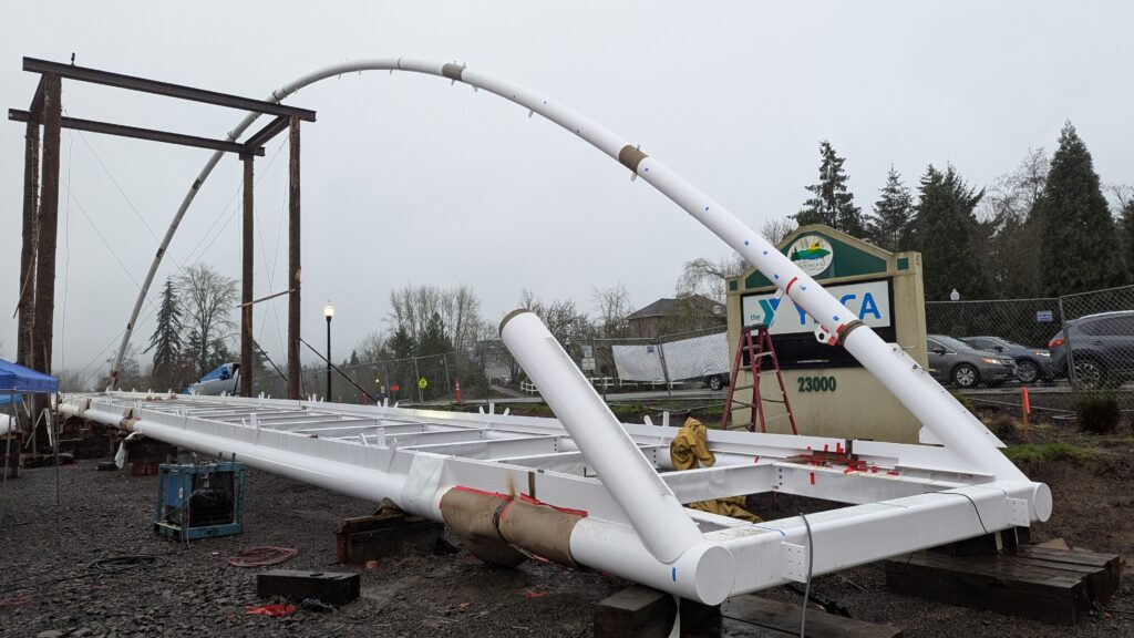 The first arch is welded together outside of the YMCA pool.Steel framing for the span 5 bridge deck is assembled along Sunset Blvd.The first arch for span 5 is lifted into place on a temporary shoring tower.The steel deck edge assembly features a smooth exterior fascia articulated by alternating diagonal connection plates for the tension rods and vertical railing connection plates.The bridge scale suddenly becomes apparent when the first arch is placed vertically, revealing that it’s taller and longer than the adjacent YMCA pool façade.A large mobile crane wraps up assembly of the steel cross bracing holding the two arches together on span 5.Metal form decking is installed on span 5, offering the first glimpse of the future on-bridge experience. Welders attach the curved diagonal cross bracing to the arches on span 5.Span 5 assembly nears completion in its temporary home in the future footprint of the east approach ramps. Architectural stainless steel tension rods are woven between each arch and the bridge deck in a uniform diagonal grid.As the stainless steel rods are tensioned, span 5 becomes a self-supporting truss spanning 194 feet and ready to move into its final position over Highway 99W.Final painting touch ups wrap up ahead of the span 5 erection.All five bridge spans feature a five-degree outward tilt to the trusses, creating a unique and dynamic form viewed in the round.The curved cross bracing between the arches enables a delicately slender arch proportion on span 5 and reflects the woven tension rod patterning.The first arch for span 3 is lifted into place, with crews carefully threading a conduit through the structure to conceal electrical and low voltage systems. Span 3 continues assembly in the same sequence as span 5, in the contractor’s staging yard on the Elk’s Lodge hill overlooking the project site.Span 3 was assembled on axis with the angled end of the north wing of Sherwood High School.Span 4 was fully assembled in Thompson Metal Fab’s shop in Vancouver, WA. All of the steel for the project was fabricated and painted here, with final assembly of spans 1, 3, and 5 completed in the field.