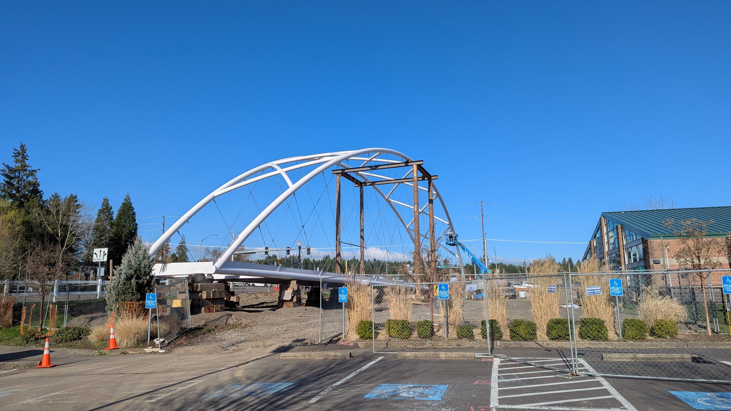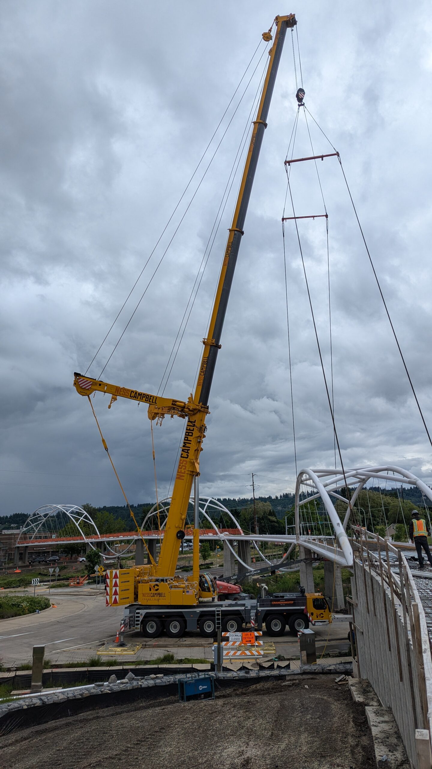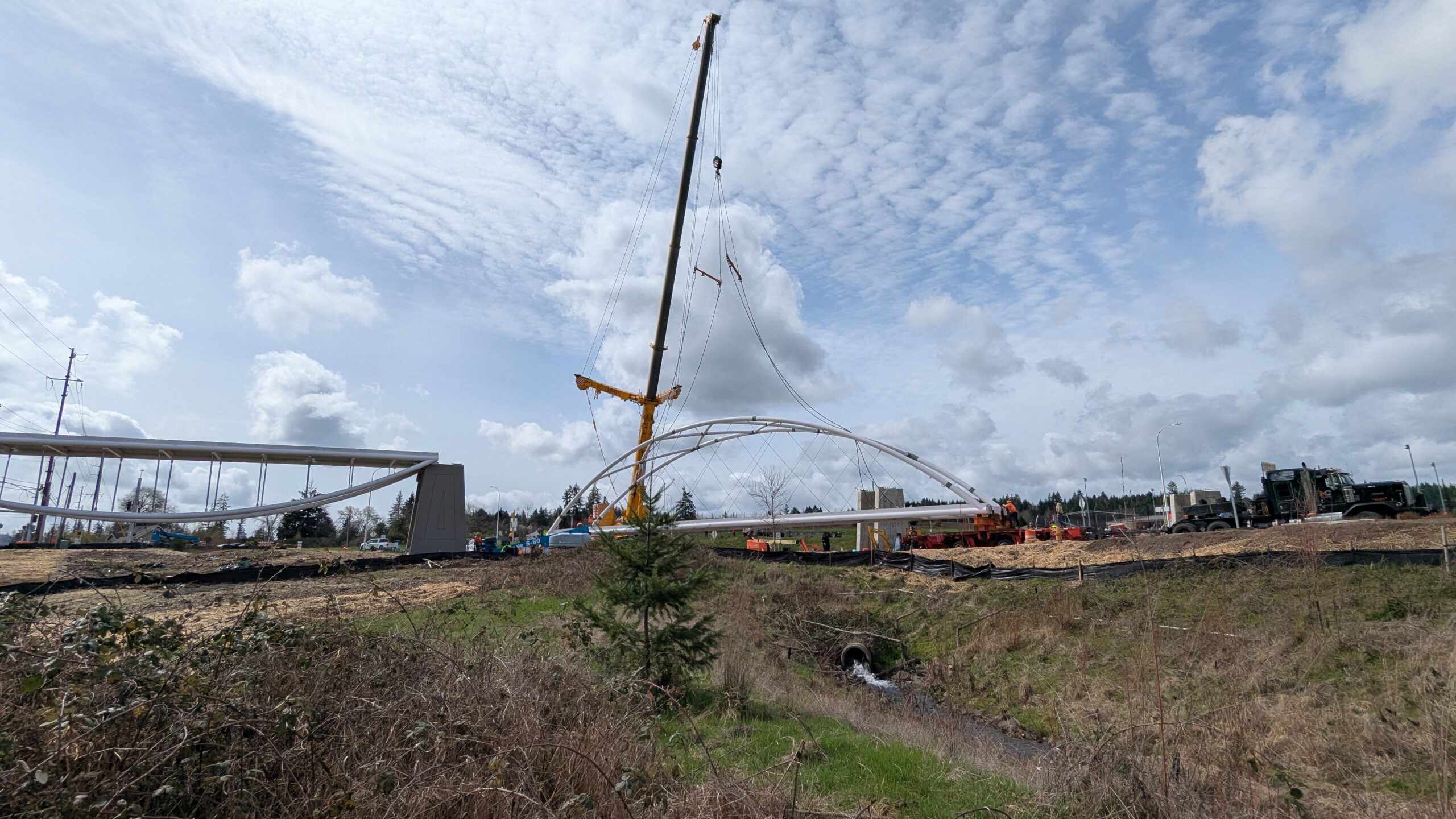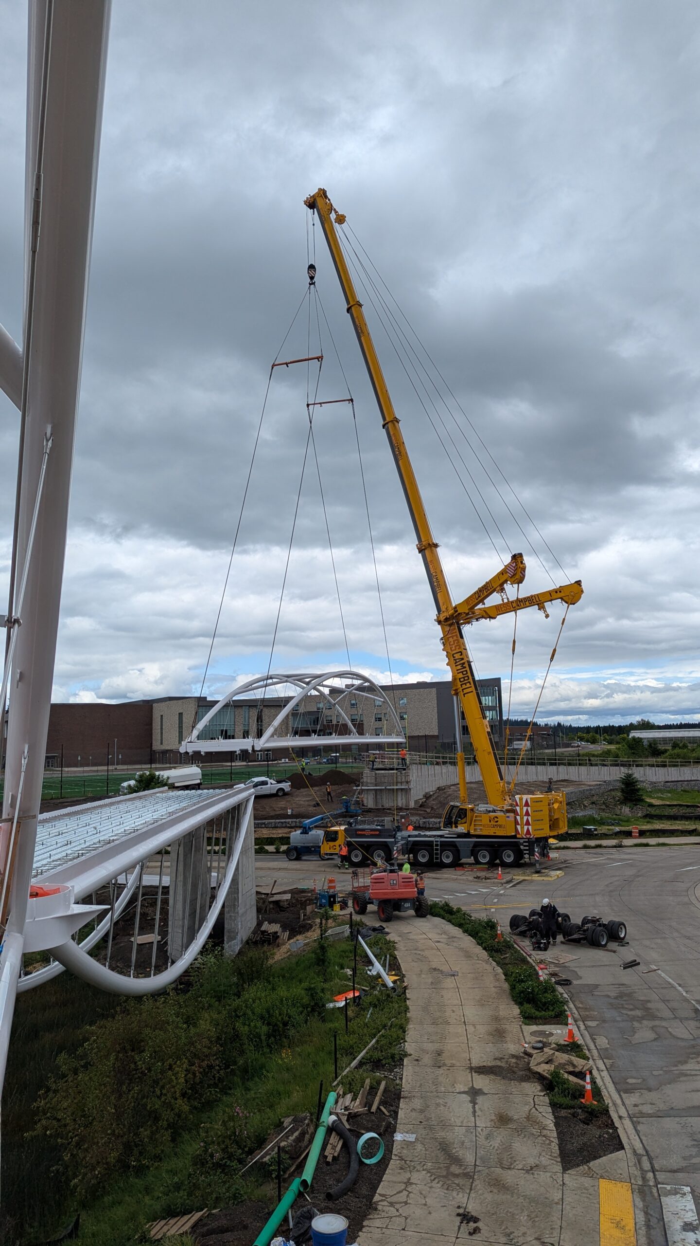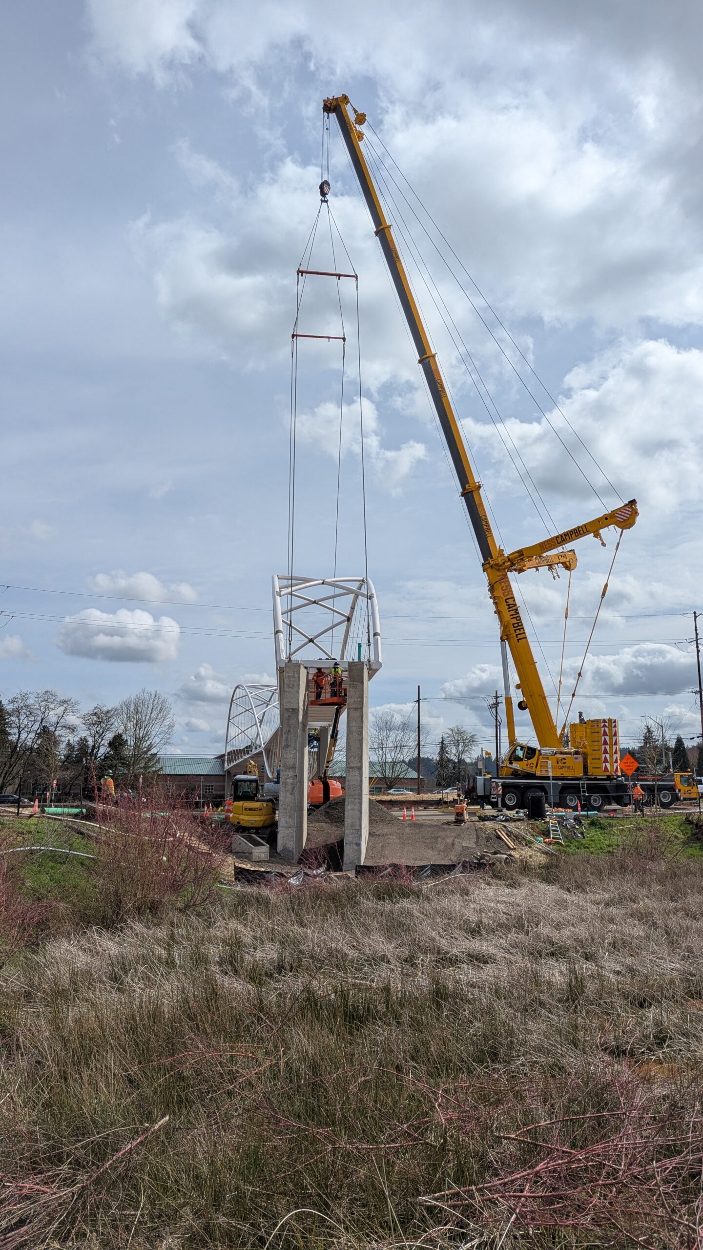The first arch is welded together outside of the YMCA pool.Steel framing for the span 5 bridge deck is assembled along Sunset Blvd.The first arch for span 5 is lifted into place on a temporary shoring tower.The steel deck edge assembly features a smooth exterior fascia articulated by alternating diagonal connection plates for the tension rods and vertical railing connection plates.The bridge scale suddenly becomes apparent when the first arch is placed vertically, revealing that it’s taller and longer than the adjacent YMCA pool façade.A large mobile crane wraps up assembly of the steel cross bracing holding the two arches together on span 5.Metal form decking is installed on span 5, offering the first glimpse of the future on-bridge experience. Welders attach the curved diagonal cross bracing to the arches on span 5.Span 5 assembly nears completion in its temporary home in the future footprint of the east approach ramps. Architectural stainless steel tension rods are woven between each arch and the bridge deck in a uniform diagonal grid.As the stainless steel rods are tensioned, span 5 becomes a self-supporting truss spanning 194 feet and ready to move into its final position over Highway 99W.Final painting touch ups wrap up ahead of the span 5 erection.All five bridge spans feature a five-degree outward tilt to the trusses, creating a unique and dynamic form viewed in the round.The curved cross bracing between the arches enables a delicately slender arch proportion on span 5 and reflects the woven tension rod patterning.The first arch for span 3 is lifted into place, with crews carefully threading a conduit through the structure to conceal electrical and low voltage systems. Span 3 continues assembly in the same sequence as span 5, in the contractor’s staging yard on the Elk’s Lodge hill overlooking the project site.Span 3 was assembled on axis with the angled end of the north wing of Sherwood High School.Span 4 was fully assembled in Thompson Metal Fab’s shop in Vancouver, WA. All of the steel for the project was fabricated and painted here, with final assembly of spans 1, 3, and 5 completed in the field.