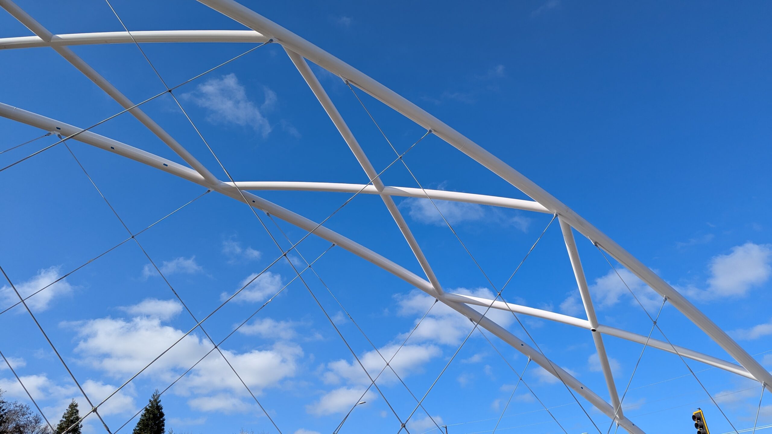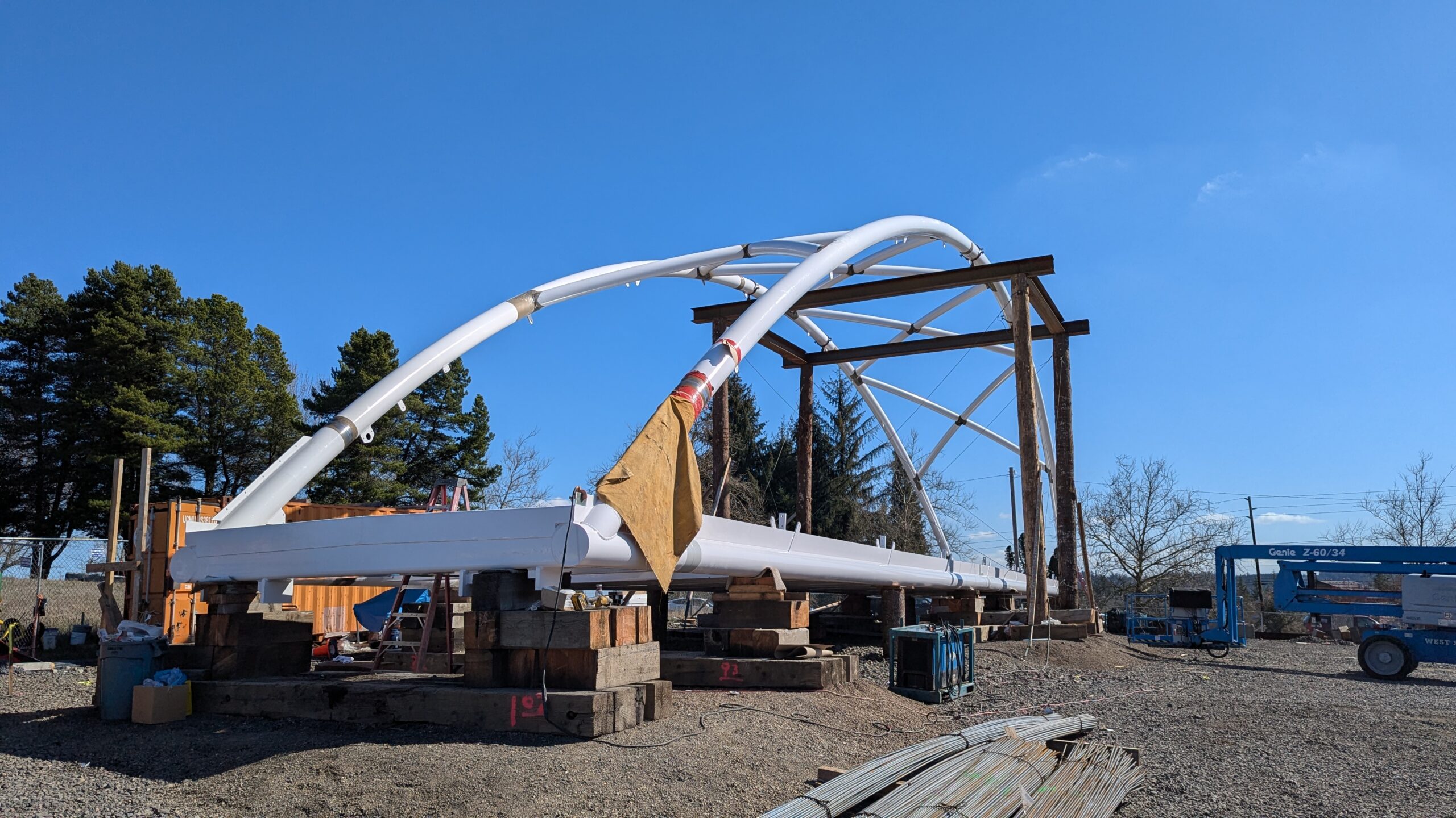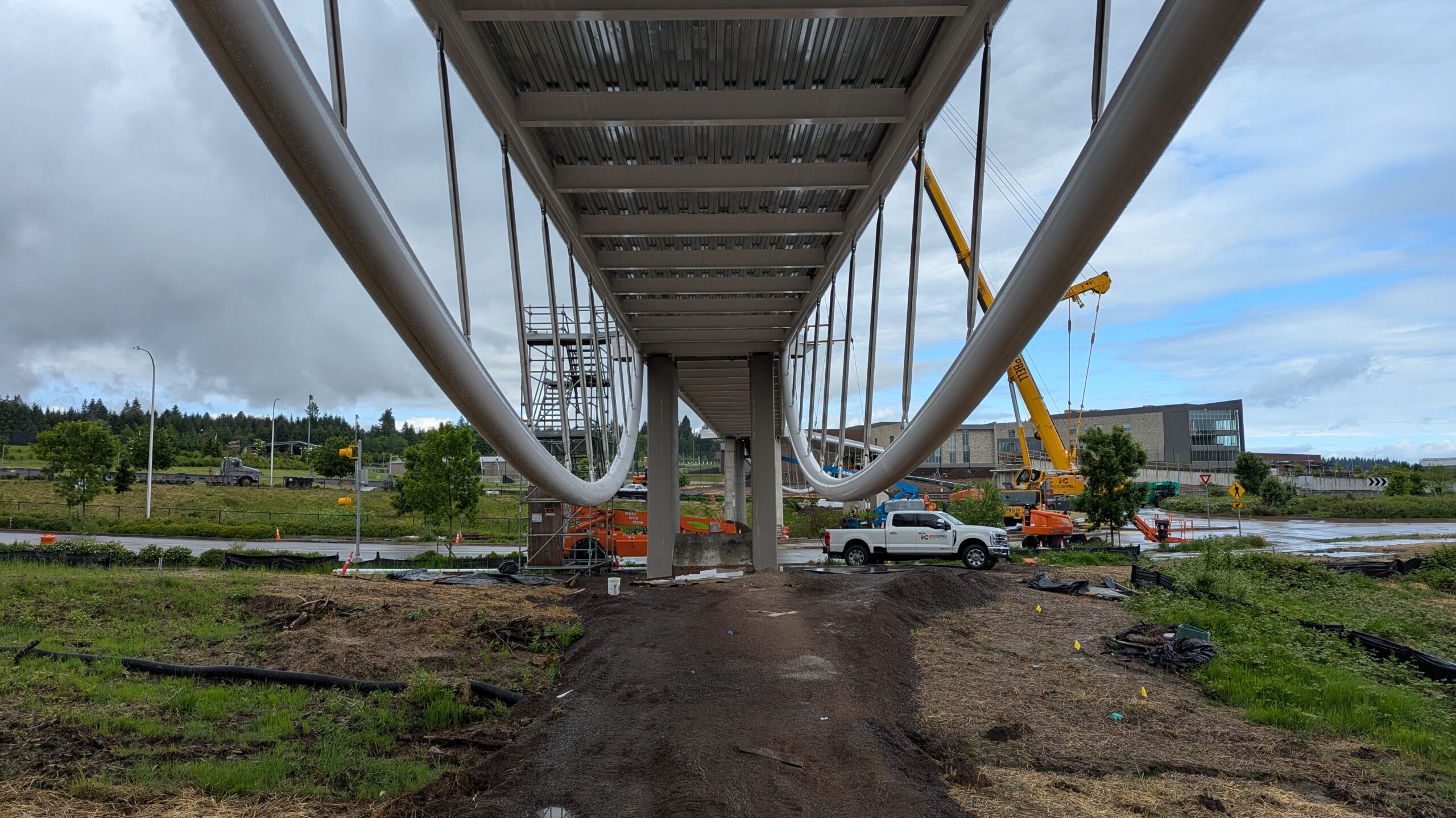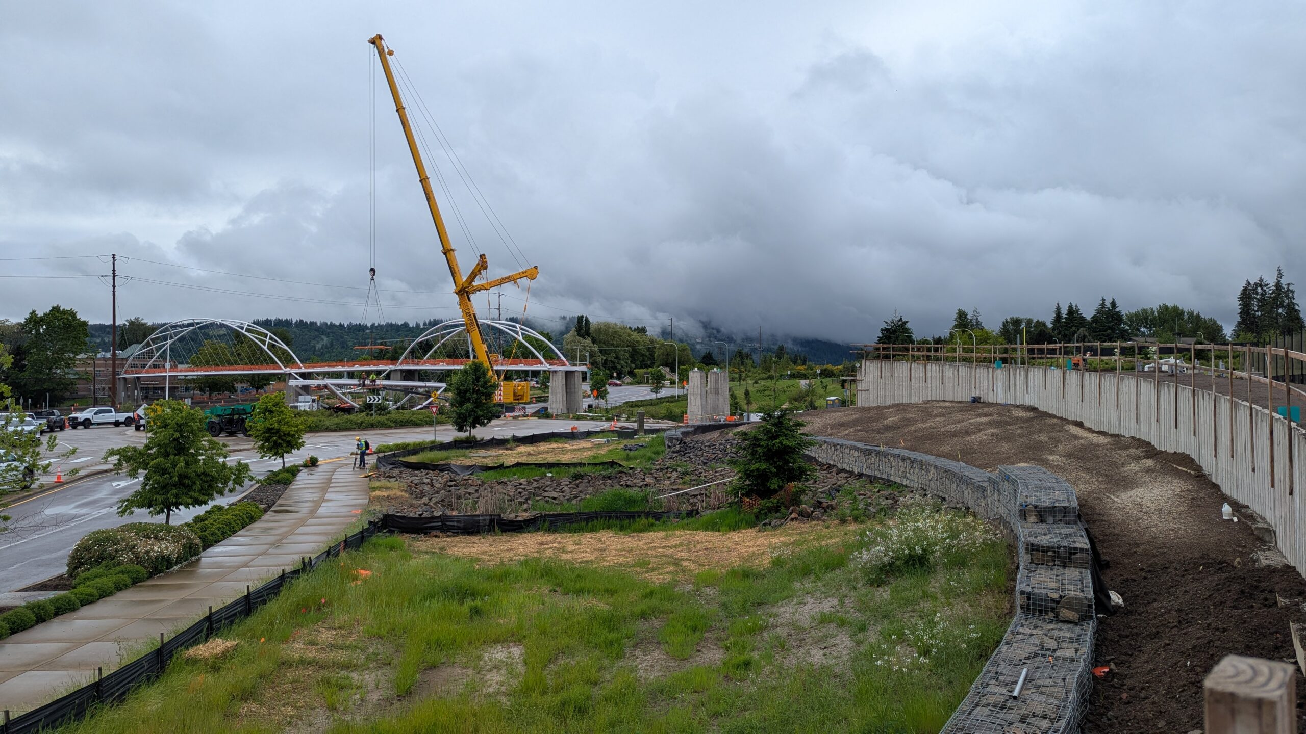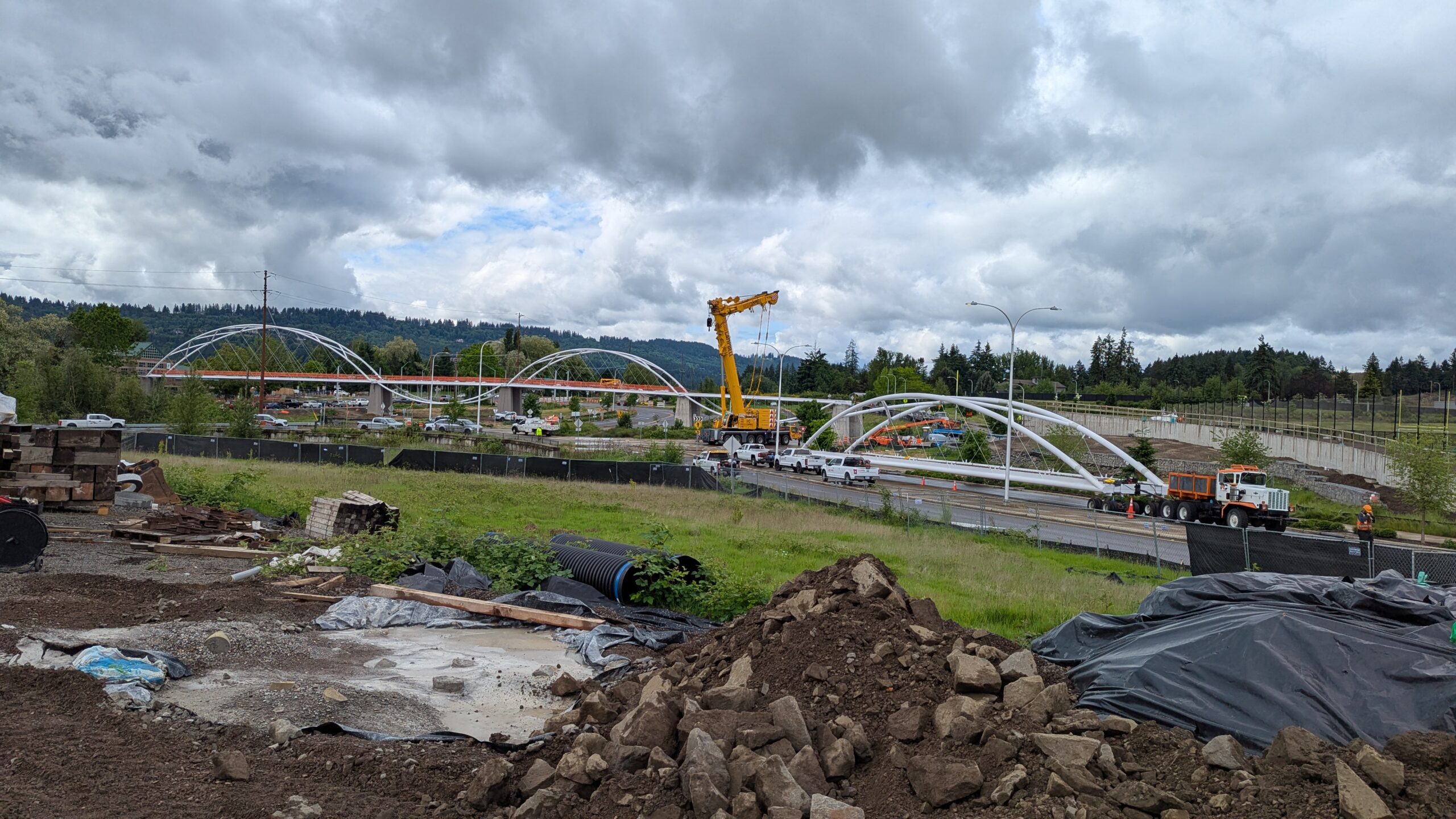 The first arch is welded together outside of the YMCA pool.Steel framing for the span 5 bridge deck is assembled along Sunset Blvd.The first arch for span 5 is lifted into place on a temporary shoring tower.The steel deck edge assembly features a smooth exterior fascia articulated by alternating diagonal connection plates for the tension rods and vertical railing connection plates.The bridge scale suddenly becomes apparent when the first arch is placed vertically, revealing that it’s taller and longer than the adjacent YMCA pool façade.A large mobile crane wraps up assembly of the steel cross bracing holding the two arches together on span 5.Metal form decking is installed on span 5, offering the first glimpse of the future on-bridge experience. Welders attach the curved diagonal cross bracing to the arches on span 5.Span 5 assembly nears completion in its temporary home in the future footprint of the east approach ramps. Architectural stainless steel tension rods are woven between each arch and the bridge deck in a uniform diagonal grid.As the stainless steel rods are tensioned, span 5 becomes a self-supporting truss spanning 194 feet and ready to move into its final position over Highway 99W.Final painting touch ups wrap up ahead of the span 5 erection.All five bridge spans feature a five-degree outward tilt to the trusses, creating a unique and dynamic form viewed in the round.The curved cross bracing between the arches enables a delicately slender arch proportion on span 5 and reflects the woven tension rod patterning.The first arch for span 3 is lifted into place, with crews carefully threading a conduit through the structure to conceal electrical and low voltage systems. Span 3 continues assembly in the same sequence as span 5, in the contractor’s staging yard on the Elk’s Lodge hill overlooking the project site.Span 3 was assembled on axis with the angled end of the north wing of Sherwood High School.Span 4 was fully assembled in Thompson Metal Fab’s shop in Vancouver, WA. All of the steel for the project was fabricated and painted here, with final assembly of spans 1, 3, and 5 completed in the field.