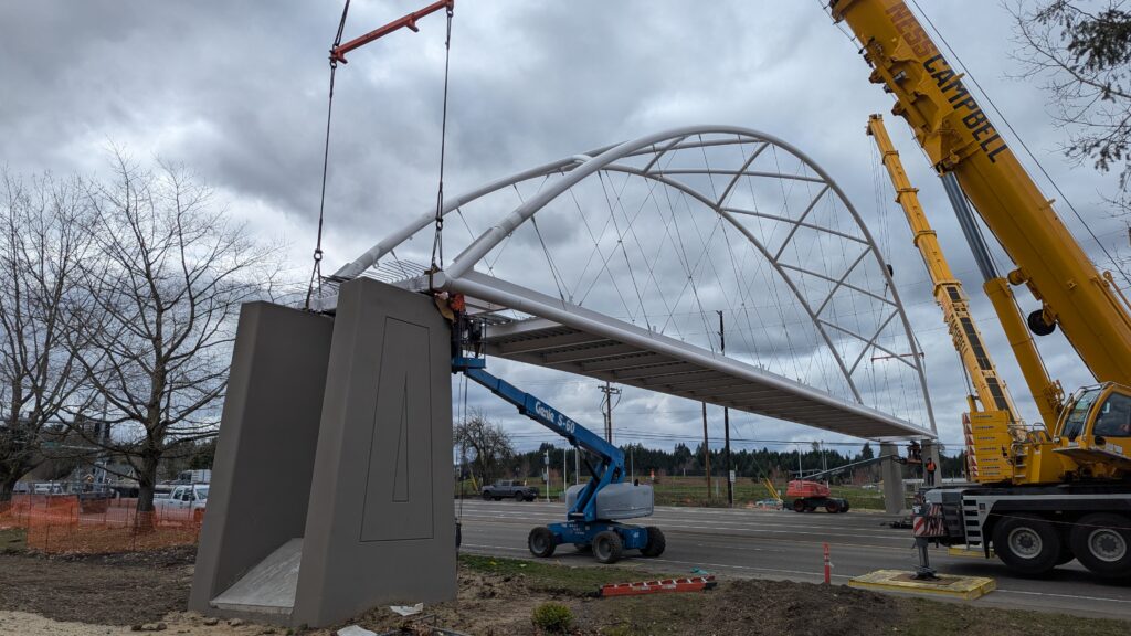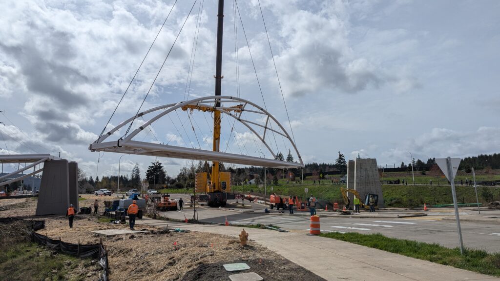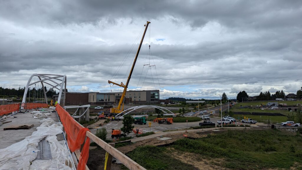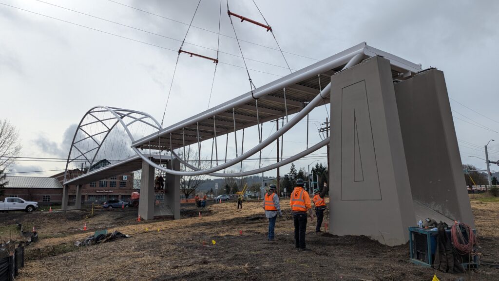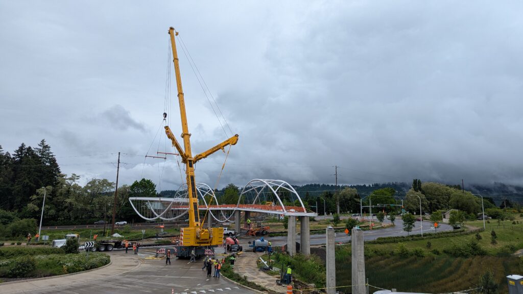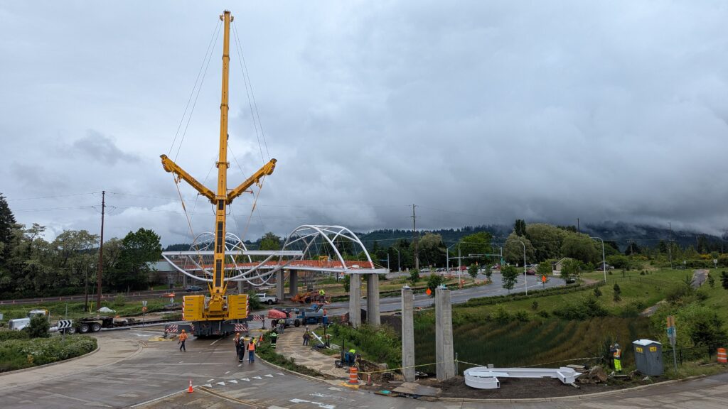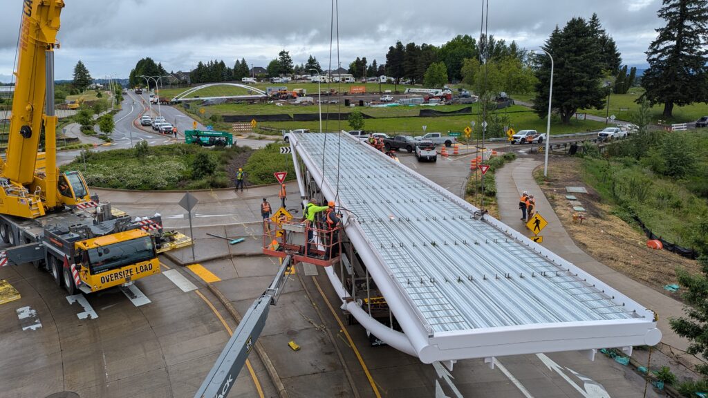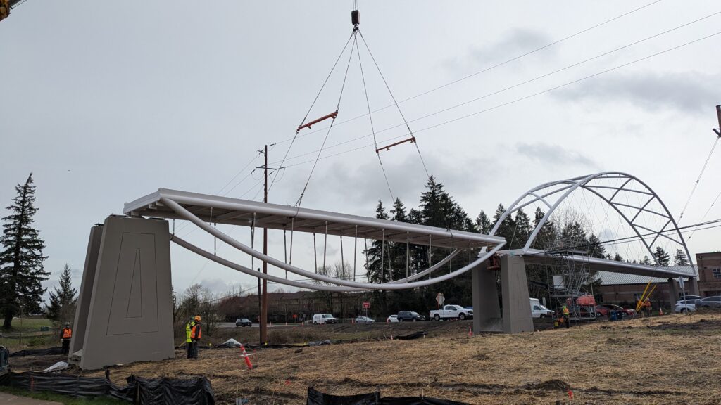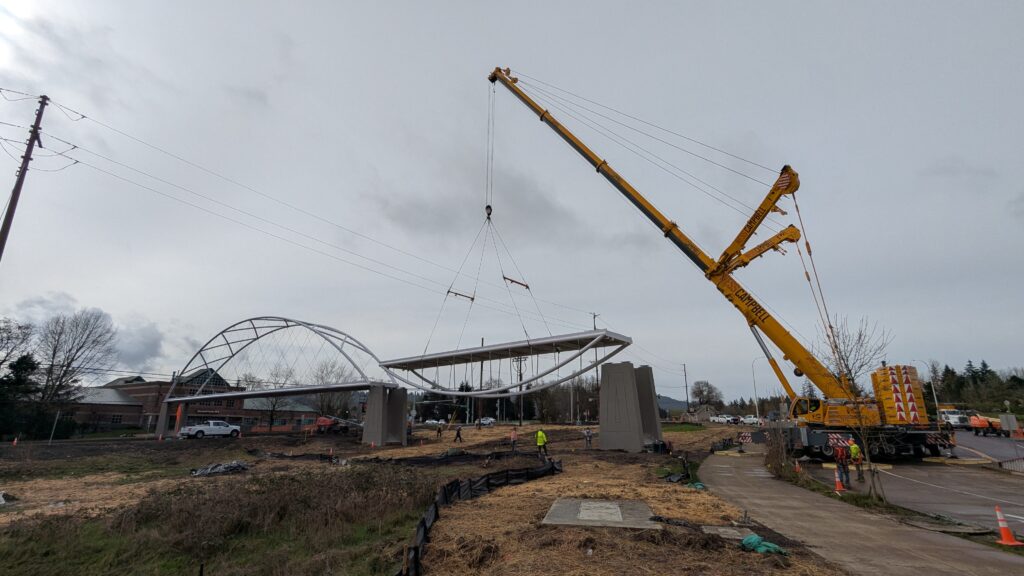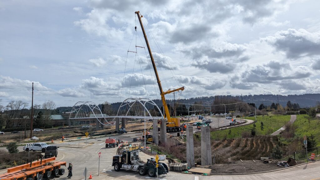 One year into construction, Sherwood’s Bicycle and Pedestrian Bridge over Highway 99W came to life in a matter of weeks when the bridge spans were installed this spring.