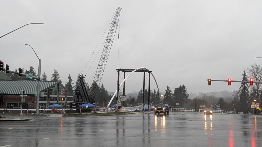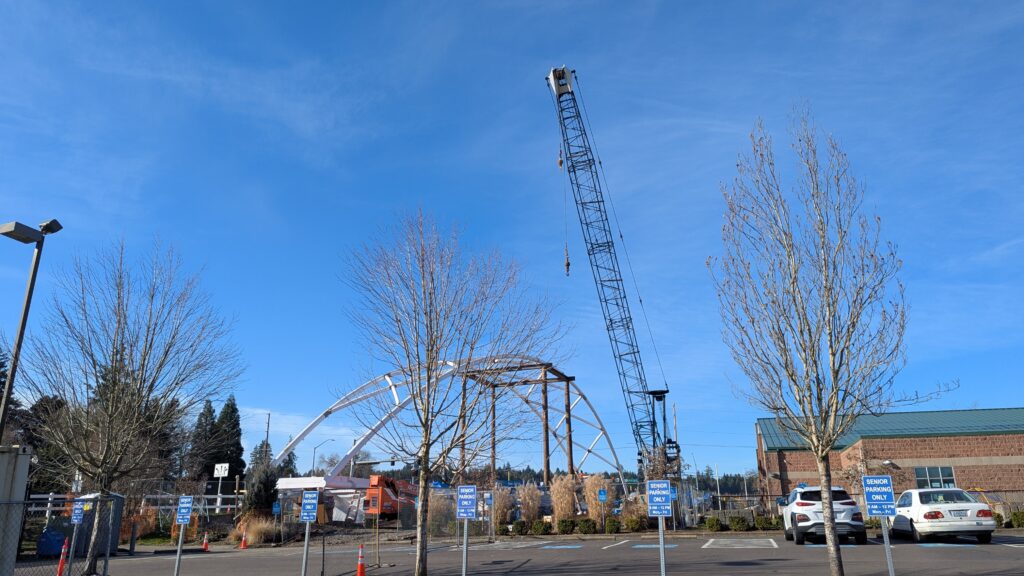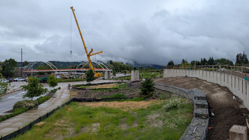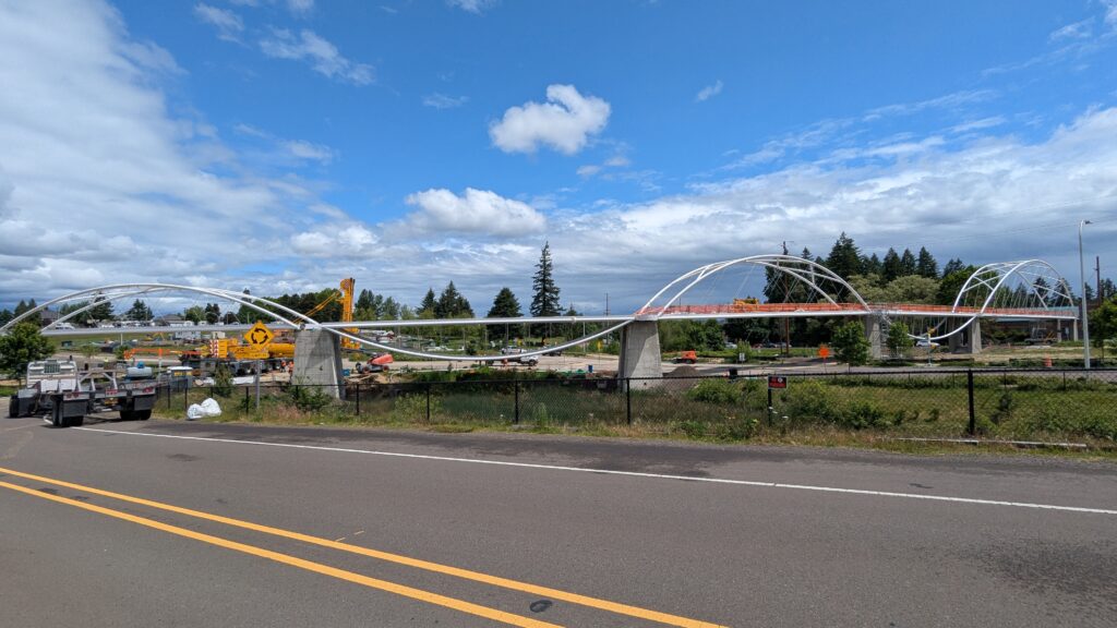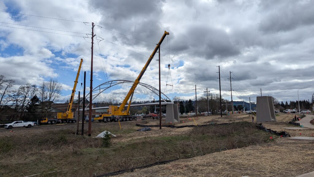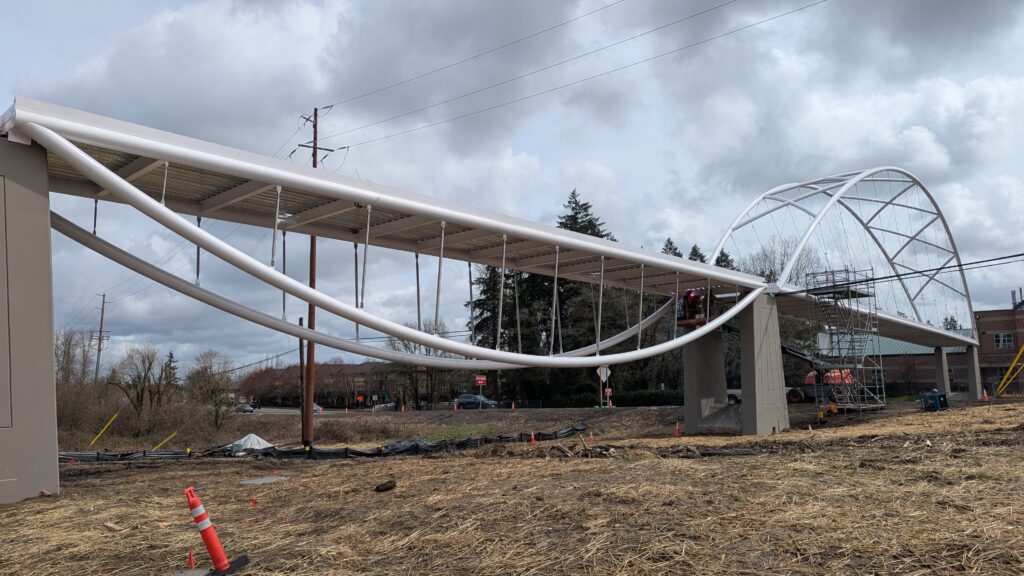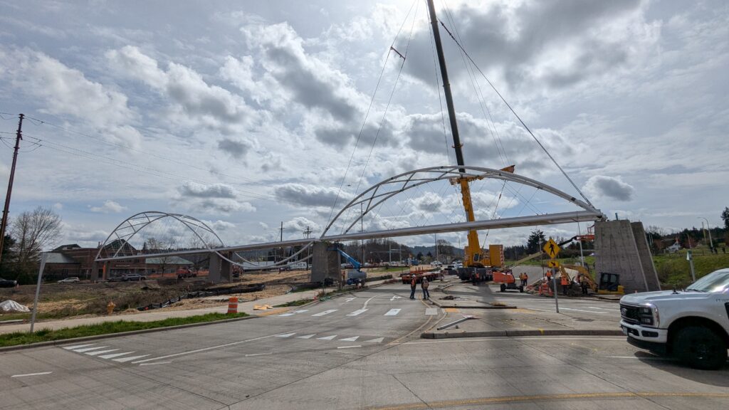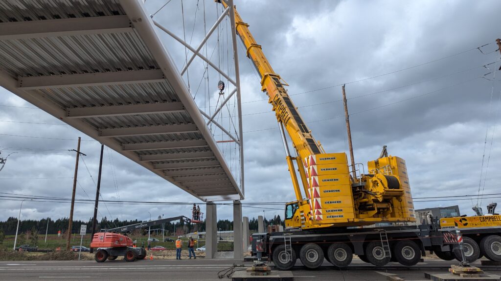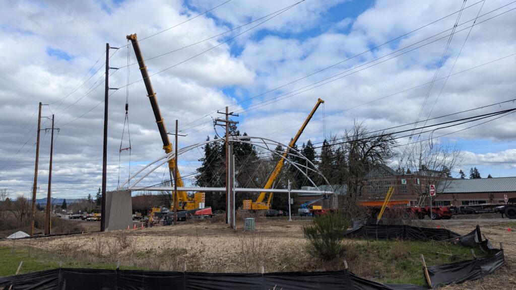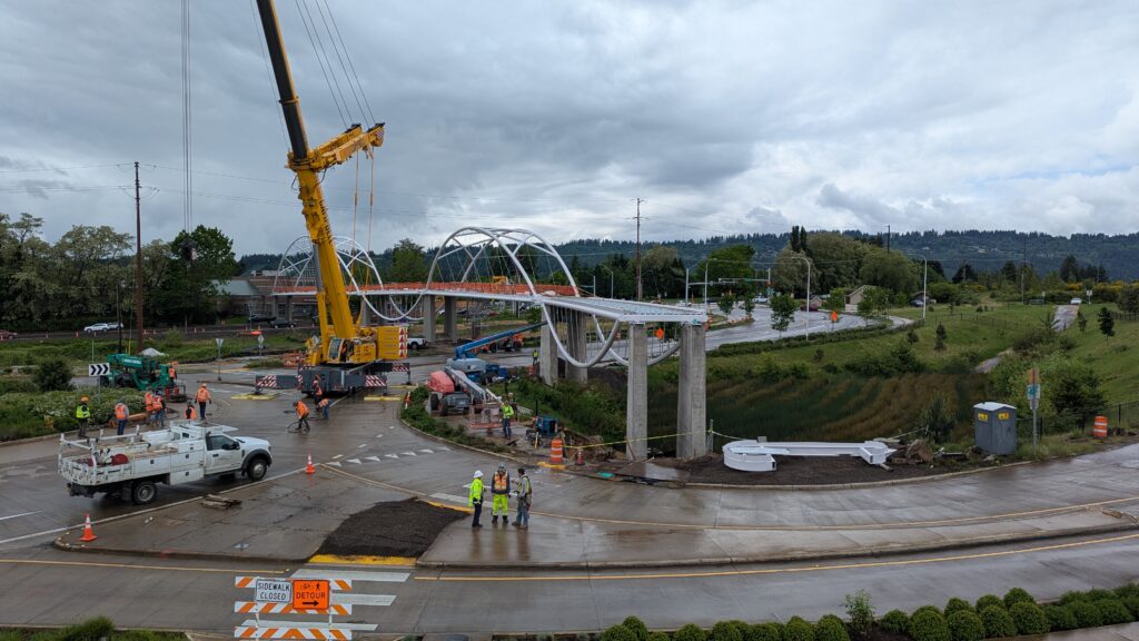 One year into construction, Sherwood’s Bicycle and Pedestrian Bridge over Highway 99W came to life in a matter of weeks when the bridge spans were installed this spring.