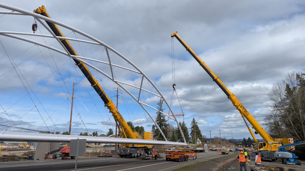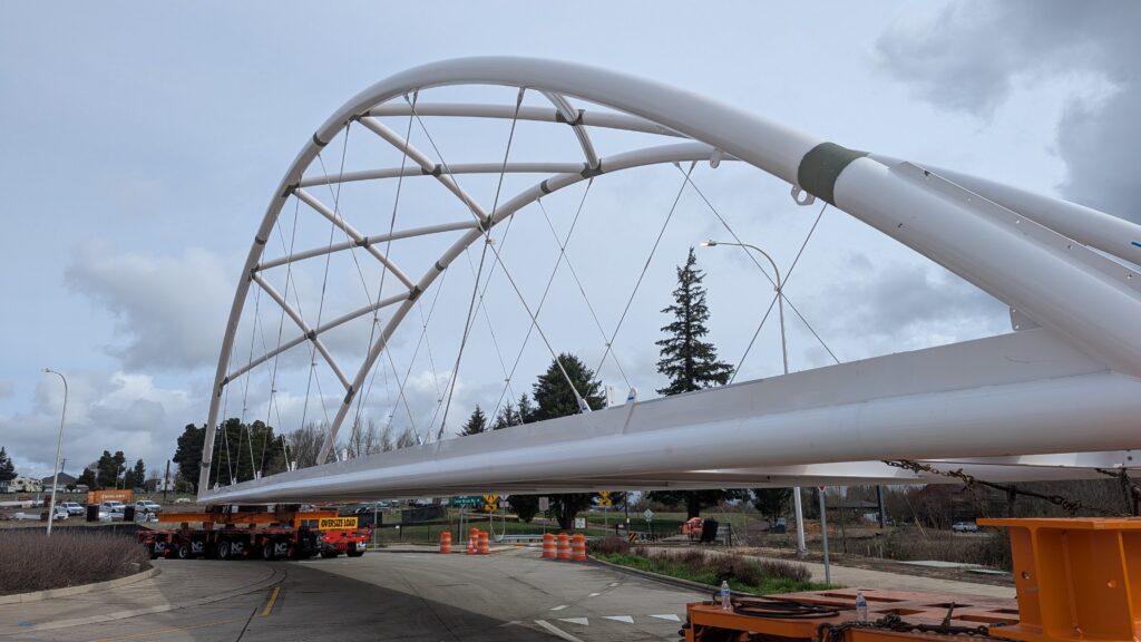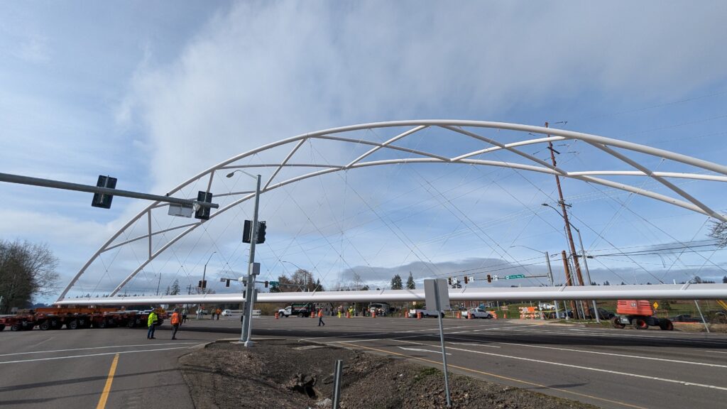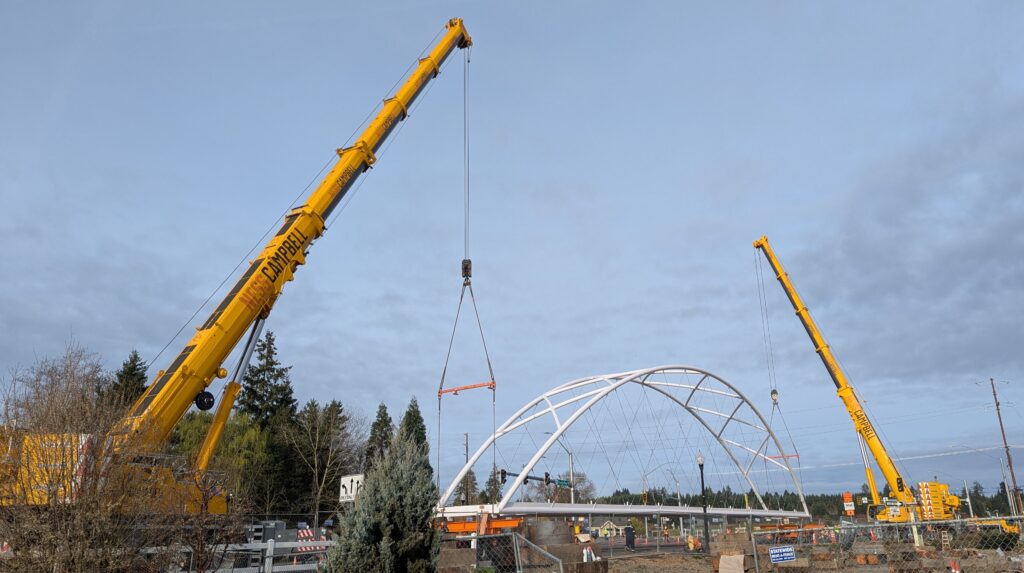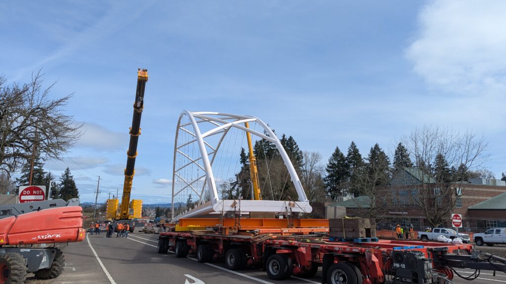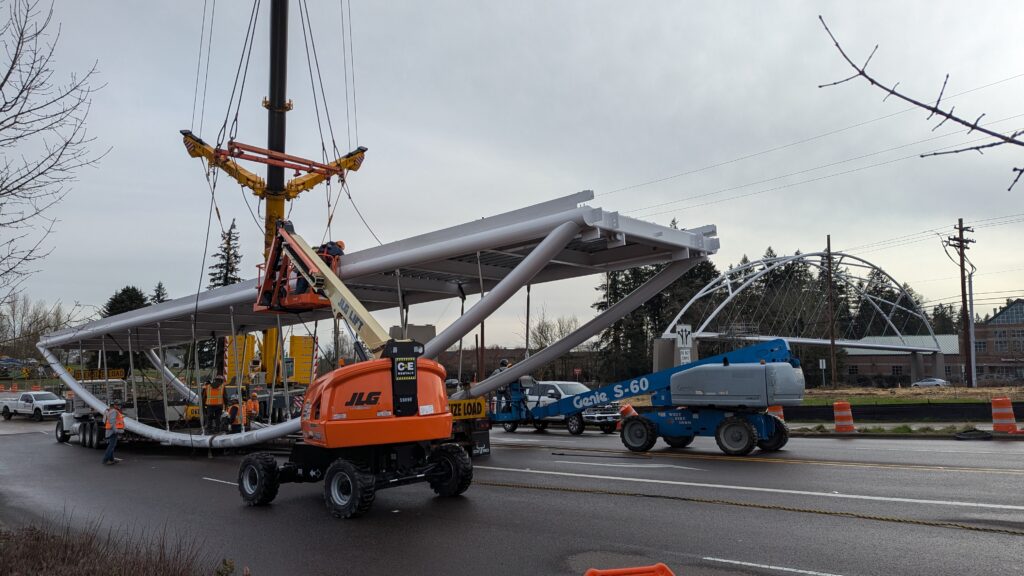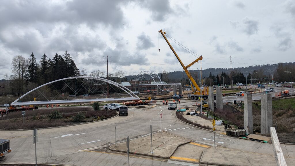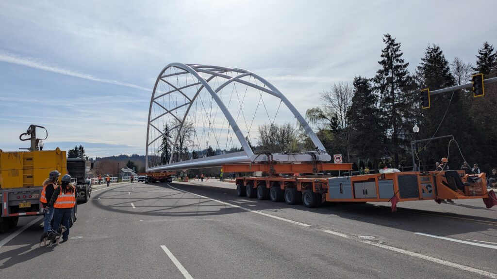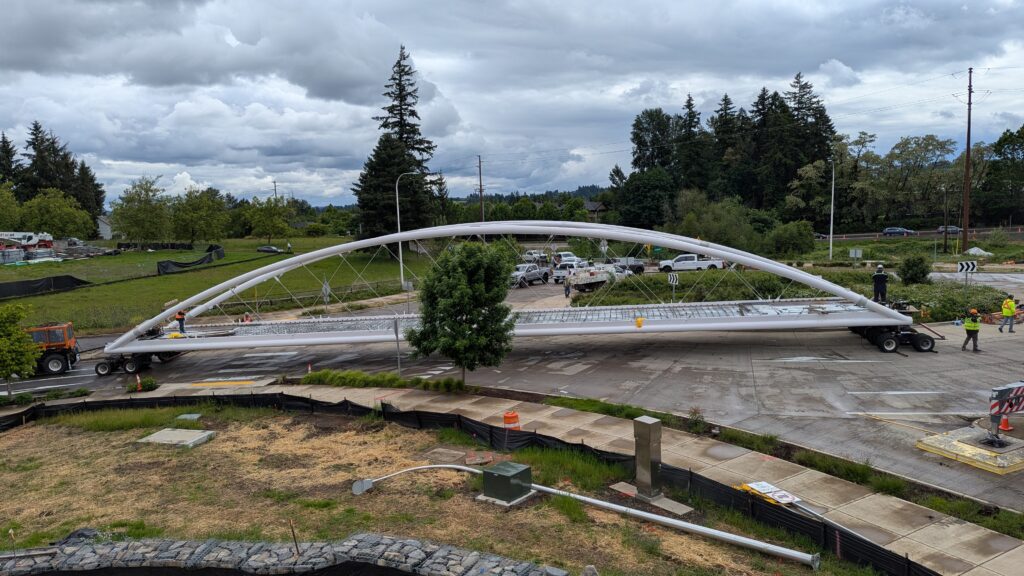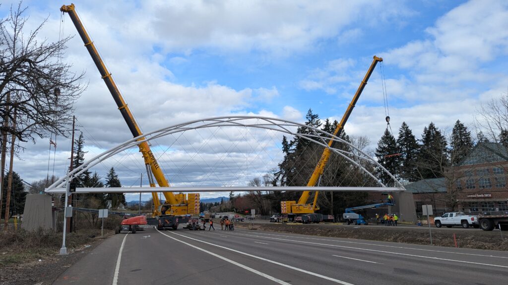 Two cranes lift span 5 from its assembly bed onto transport dollies on Sunset Blvd.As span 5 is anchored to the transporters, the cranes prepare to move onto Highway 99W to set it into its final position.Span 5 inches toward its final destination as the completed bridge bents await arrival of the other four spans. The first crane is staged for the final span 5 pick over the highway.A final look across the highway from the future east approach before the bridge moves into place.The scale of span 5 becomes more apparent as it’s lifted incrementally higher from its assembly bed.Sherwood residents and their canines eagerly await span 5’s big move from Sunset onto Highway 99W.The sun emerges on Sunset, offering a first glimpse of the dramatic shadows that the bridge structure will cast.Around 10:30am, traffic controllers stop all traffic detouring from Hwy 99W onto Elwert Rd. and shift the closures barriers to make way for span 5.Span 5 begins its careful movement through the intersection on transportation dollies.The front transporter swings wide toward Elwert Rd as span 5 crosses the intersection.Span 5 begins to turn onto the southbound lanes of Highway 99W.At the tightest point along its journey, span 5 fills the full diagonal width of 99W/Elwert/Sunset intersection.Reality confirms the viability of the bridge movement path that was studied through extensive digital and physical 3D modeling.The rear transporter finally swings into the intersection to complete the turn onto the southbound highway lanes.Span 5 just clears the highway median traffic signals as it completes the turn.Span 5 parks on the southbound lanes of Highway 99W, allowing detoured traffic to resume onto Elwert Rd after just a 20-minute pause.The cranes prepare to pick span 5 into its final position, offering a pause in the process to observe the completed structure in a temporary position from various vantage points.This temporary slope is more extreme than the final condition, but clearly demonstrates how the existing highway grades are leveraged to increase clearance under the bridge and minimize pedestrian ramp lengths.This view from the west abutment shows the three roads that the completed bridge will cross. The detoured highway 99W traffic on Elwert Rd. is denser than typical, but not much worse than the daily peaks on school days.Utility lines along the highway were raised, undergrounded, and temporarily shifted with a shoefly to create clearance for the erection cranes.The tilted arches create dynamic oblique views along the structure.Crews wrap up a final safety meeting and move into position to lift span 5 into place.The first crane is attached to the east end of span 5.The east end of span 5 lifts off of the transportation dolly, which moves out of the way as the other transporter drives toward the second crane.The west end of span 5 crawls down the southbound lanes of Hwy 99W to be picked by the second crane. Span 5 swings carefully into place through a choregraphed effort of two cranes.Span 5 is set onto its bearings and welded into place atop the concrete bents.As welders permanently anchor span 5 into place, it can be observed from views across the surrounding area.Span 5 from the roundabout.Span 5 from Highway 99W Southbound, in a view that will reopen to drivers in a matter of hours.Span 5 from Highway 99W at Elwert. Span 5 from outside the YMCA gym.Span 5 from Sunset Blvd. at Hwy 99W. The bridge span was installed and the highway reopened more than a day early, with only a 24-hour road closure.