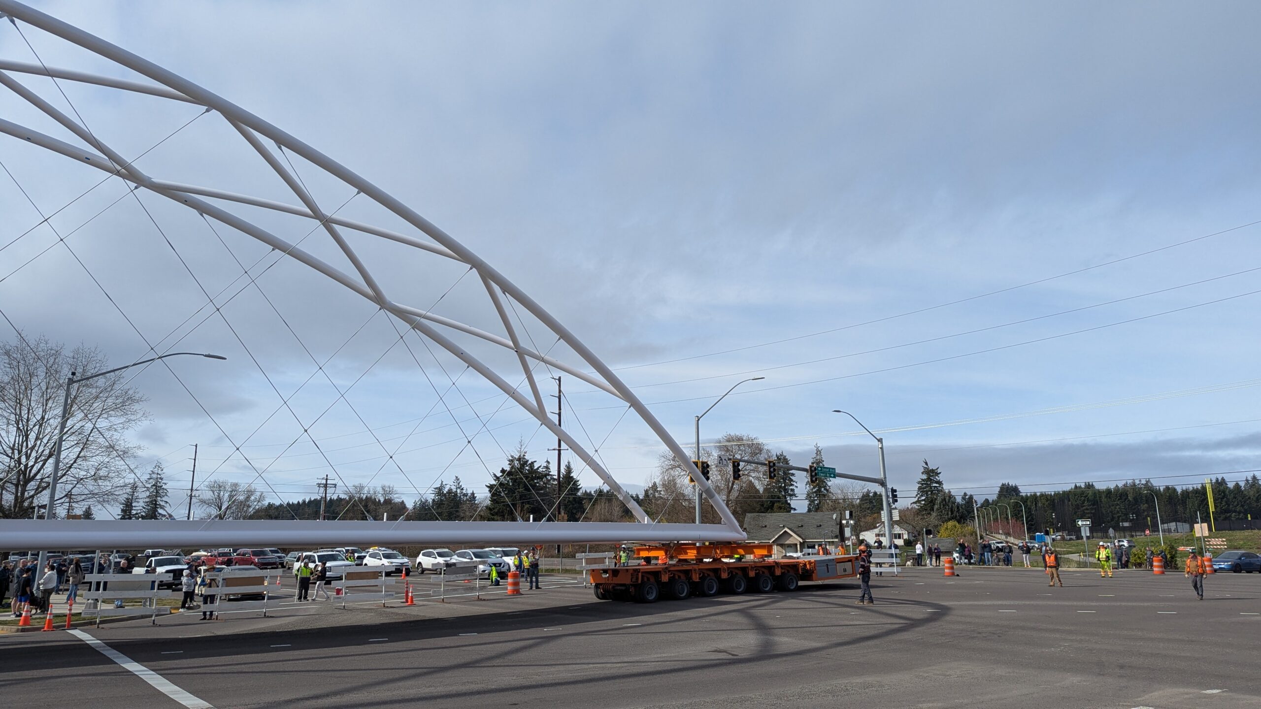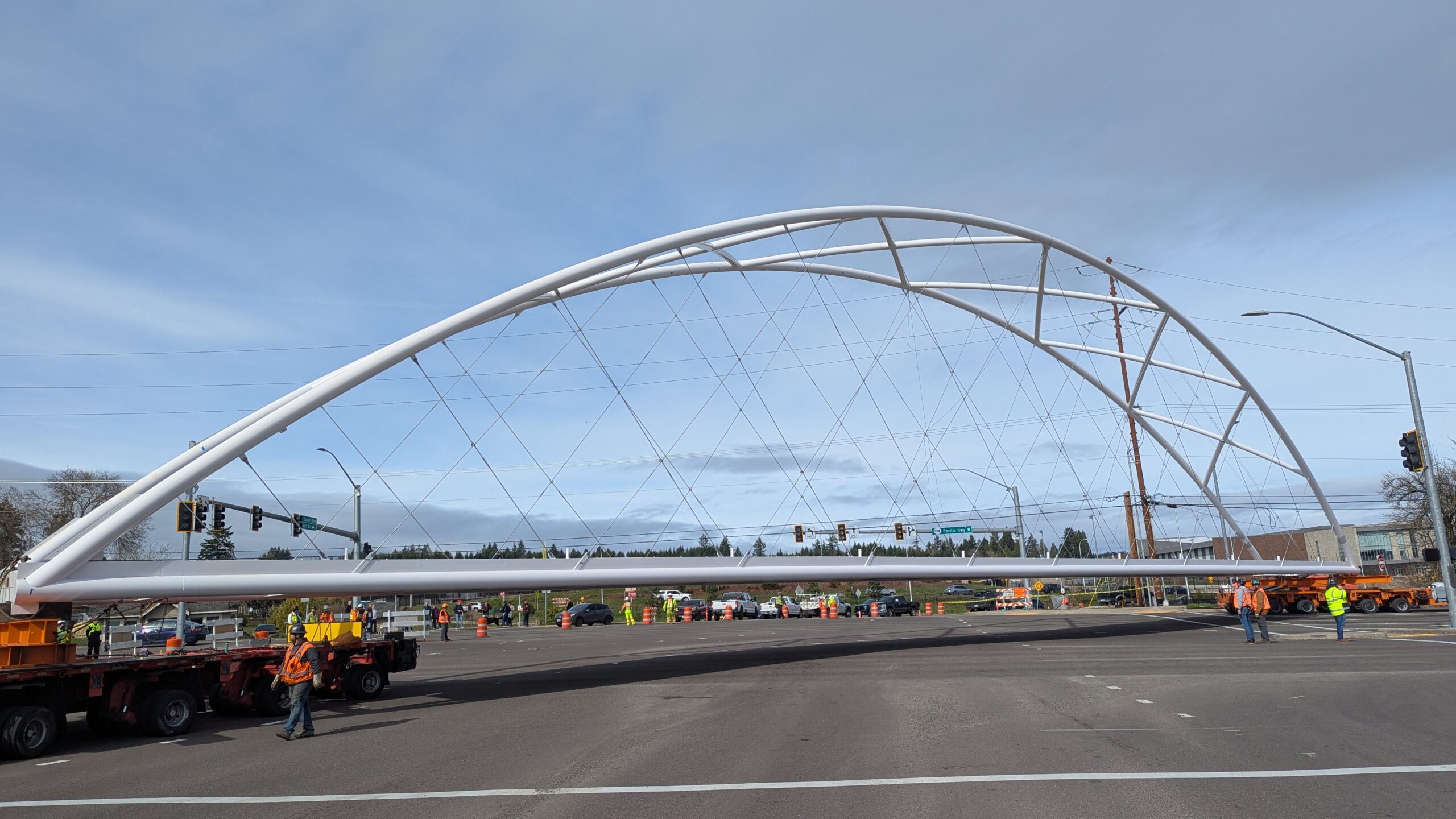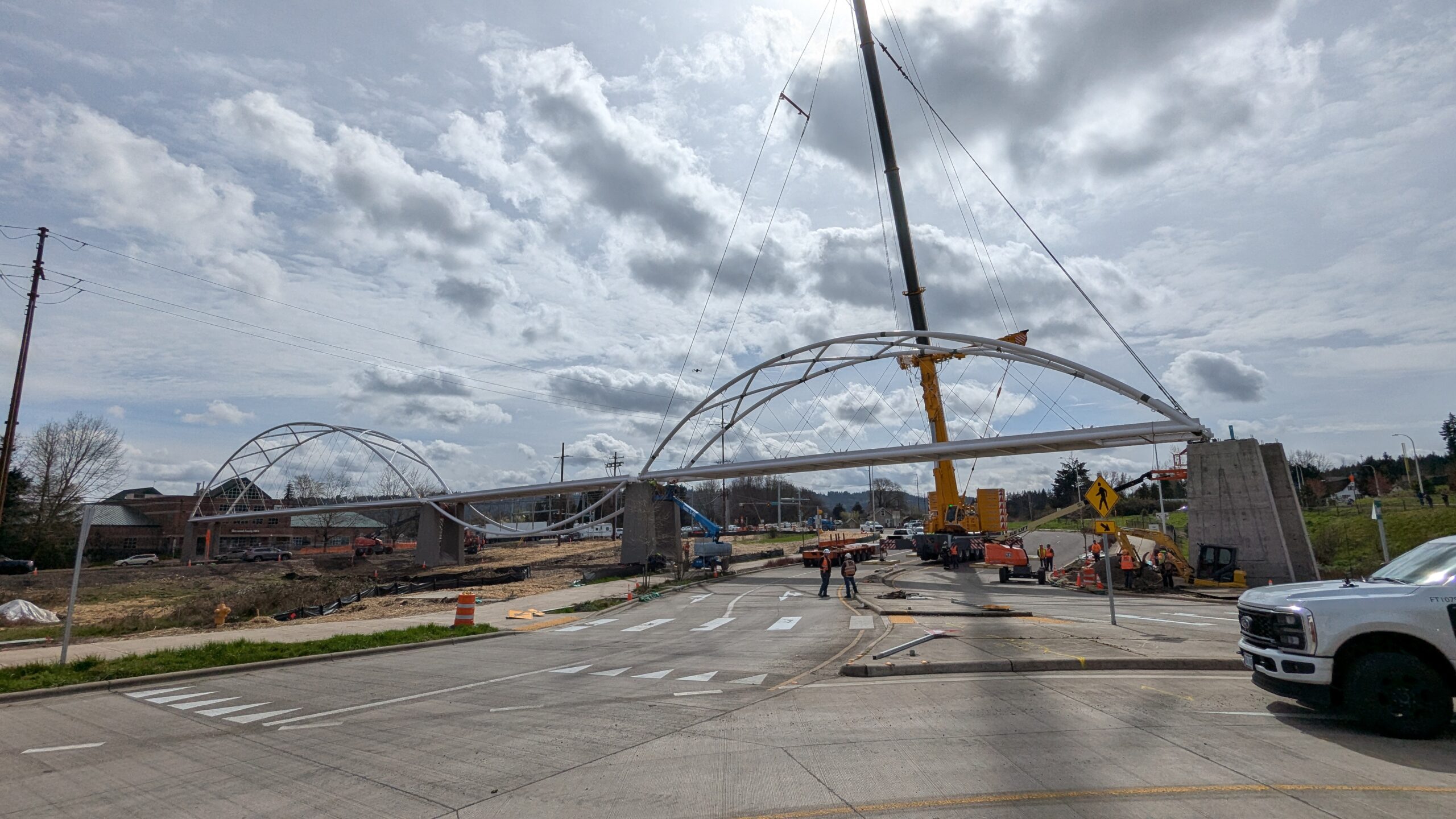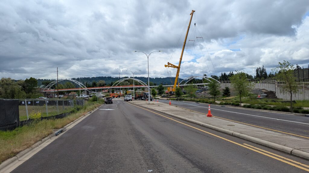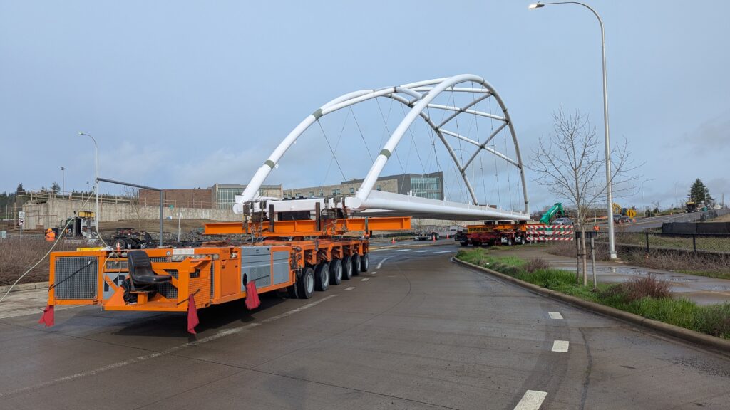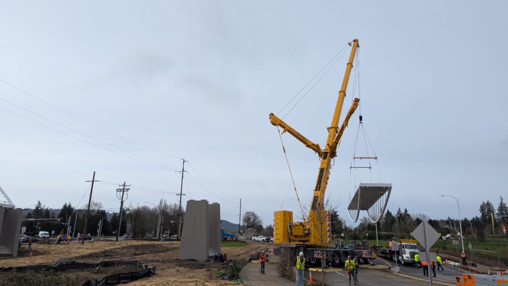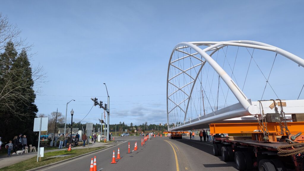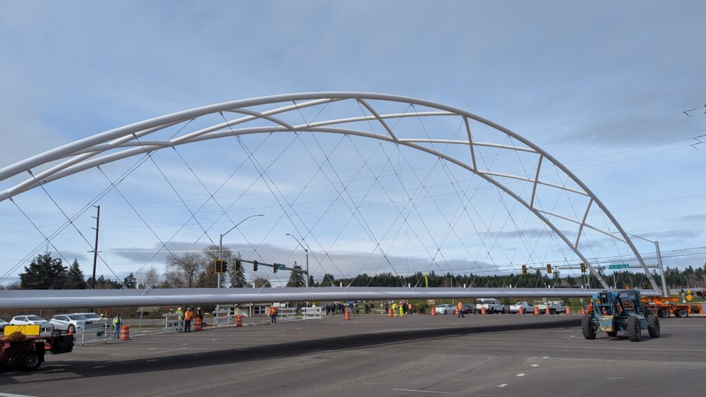 Two cranes lift span 5 from its assembly bed onto transport dollies on Sunset Blvd.As span 5 is anchored to the transporters, the cranes prepare to move onto Highway 99W to set it into its final position.Span 5 inches toward its final destination as the completed bridge bents await arrival of the other four spans. The first crane is staged for the final span 5 pick over the highway.A final look across the highway from the future east approach before the bridge moves into place.The scale of span 5 becomes more apparent as it’s lifted incrementally higher from its assembly bed.Sherwood residents and their canines eagerly await span 5’s big move from Sunset onto Highway 99W.The sun emerges on Sunset, offering a first glimpse of the dramatic shadows that the bridge structure will cast.Around 10:30am, traffic controllers stop all traffic detouring from Hwy 99W onto Elwert Rd. and shift the closures barriers to make way for span 5.Span 5 begins its careful movement through the intersection on transportation dollies.The front transporter swings wide toward Elwert Rd as span 5 crosses the intersection.Span 5 begins to turn onto the southbound lanes of Highway 99W.At the tightest point along its journey, span 5 fills the full diagonal width of 99W/Elwert/Sunset intersection.Reality confirms the viability of the bridge movement path that was studied through extensive digital and physical 3D modeling.The rear transporter finally swings into the intersection to complete the turn onto the southbound highway lanes.Span 5 just clears the highway median traffic signals as it completes the turn.Span 5 parks on the southbound lanes of Highway 99W, allowing detoured traffic to resume onto Elwert Rd after just a 20-minute pause.The cranes prepare to pick span 5 into its final position, offering a pause in the process to observe the completed structure in a temporary position from various vantage points.This temporary slope is more extreme than the final condition, but clearly demonstrates how the existing highway grades are leveraged to increase clearance under the bridge and minimize pedestrian ramp lengths.This view from the west abutment shows the three roads that the completed bridge will cross. The detoured highway 99W traffic on Elwert Rd. is denser than typical, but not much worse than the daily peaks on school days.Utility lines along the highway were raised, undergrounded, and temporarily shifted with a shoefly to create clearance for the erection cranes.The tilted arches create dynamic oblique views along the structure.Crews wrap up a final safety meeting and move into position to lift span 5 into place.The first crane is attached to the east end of span 5.The east end of span 5 lifts off of the transportation dolly, which moves out of the way as the other transporter drives toward the second crane.The west end of span 5 crawls down the southbound lanes of Hwy 99W to be picked by the second crane. Span 5 swings carefully into place through a choregraphed effort of two cranes.Span 5 is set onto its bearings and welded into place atop the concrete bents.As welders permanently anchor span 5 into place, it can be observed from views across the surrounding area.Span 5 from the roundabout.Span 5 from Highway 99W Southbound, in a view that will reopen to drivers in a matter of hours.Span 5 from Highway 99W at Elwert. Span 5 from outside the YMCA gym.Span 5 from Sunset Blvd. at Hwy 99W. The bridge span was installed and the highway reopened more than a day early, with only a 24-hour road closure.