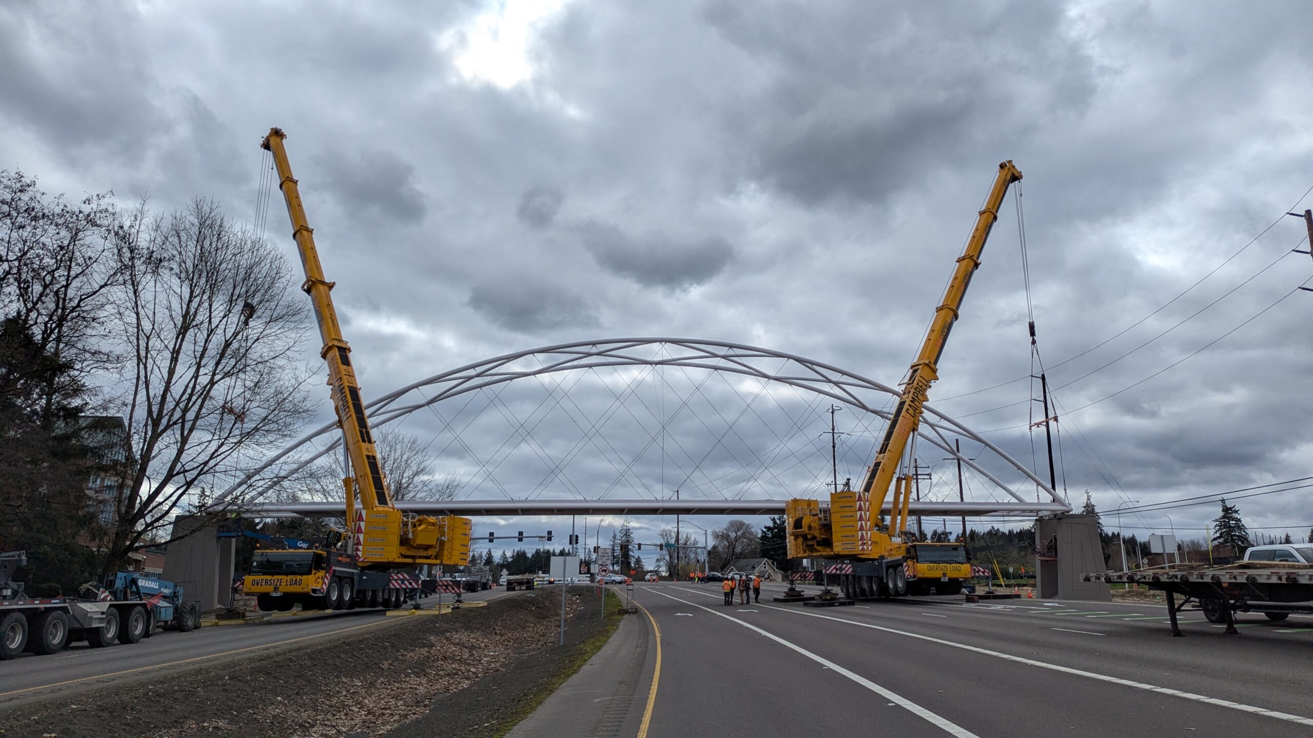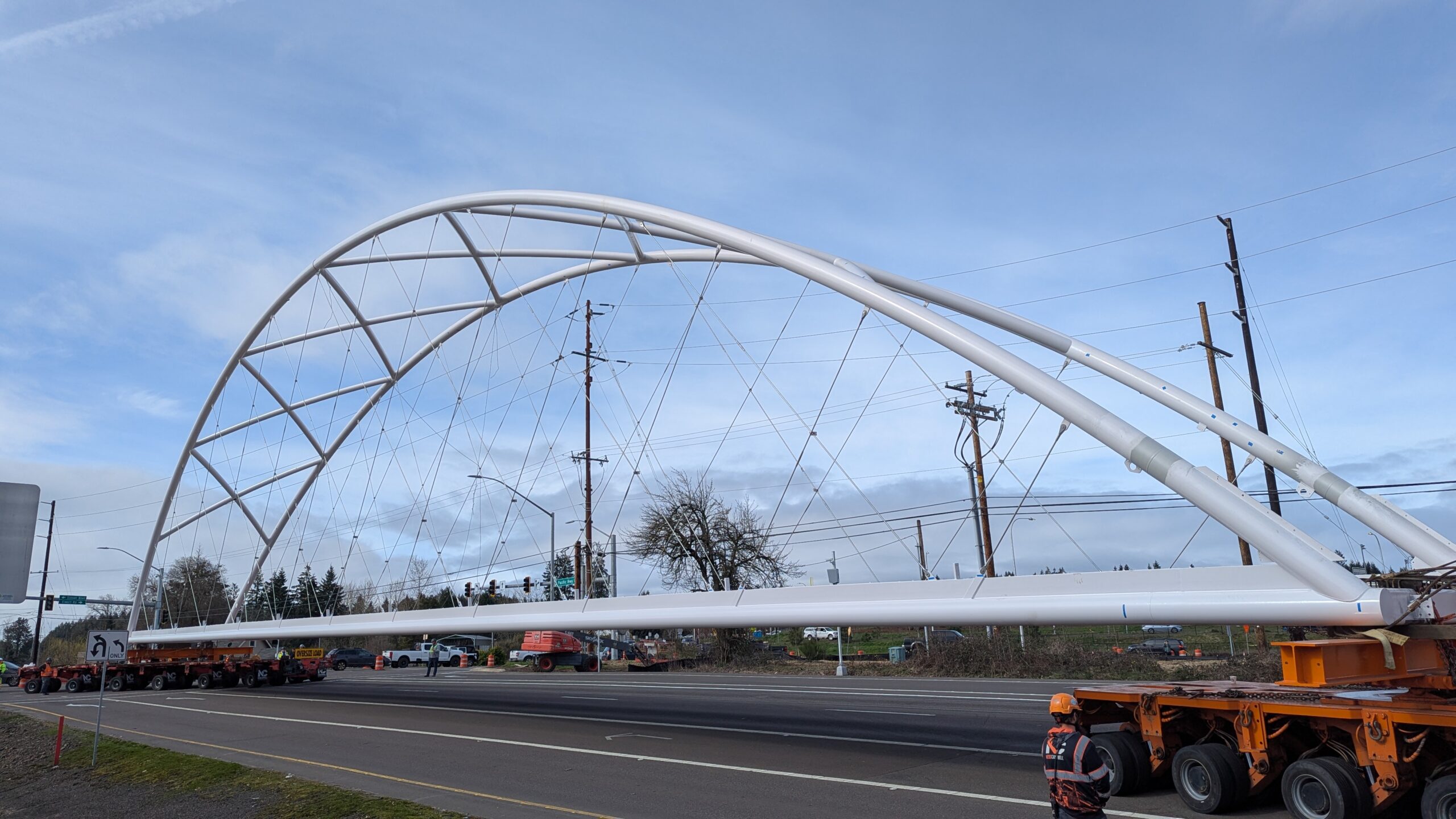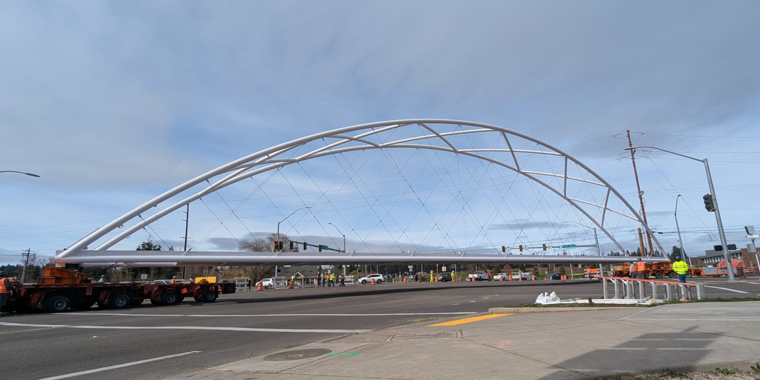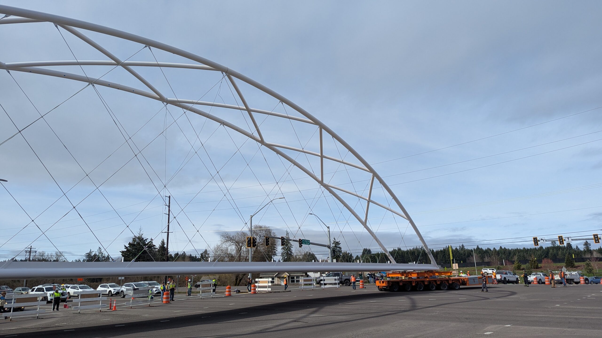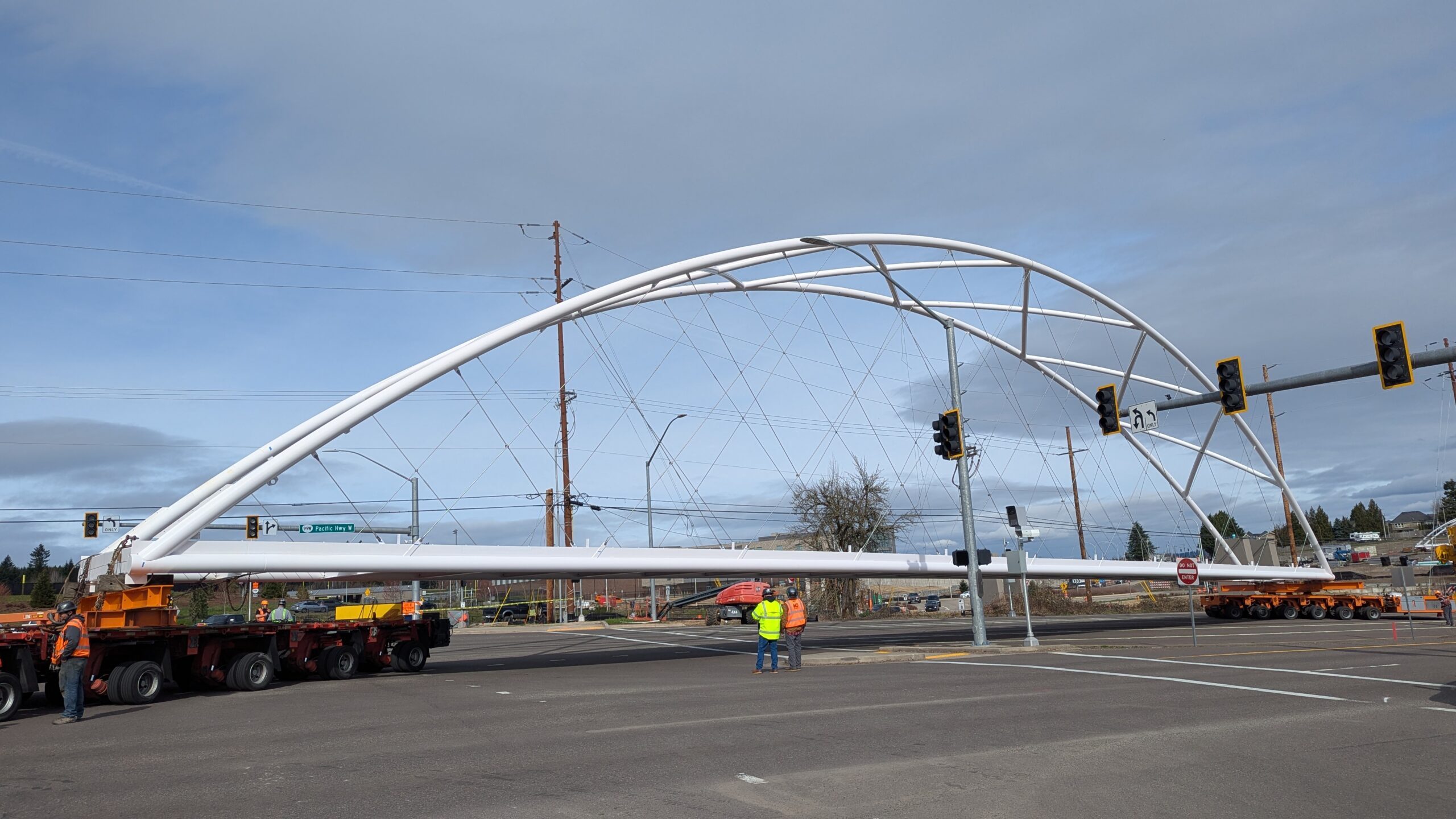 Two cranes lift span 5 from its assembly bed onto transport dollies on Sunset Blvd.As span 5 is anchored to the transporters, the cranes prepare to move onto Highway 99W to set it into its final position.Span 5 inches toward its final destination as the completed bridge bents await arrival of the other four spans. The first crane is staged for the final span 5 pick over the highway.A final look across the highway from the future east approach before the bridge moves into place.The scale of span 5 becomes more apparent as it’s lifted incrementally higher from its assembly bed.Sherwood residents and their canines eagerly await span 5’s big move from Sunset onto Highway 99W.The sun emerges on Sunset, offering a first glimpse of the dramatic shadows that the bridge structure will cast.Around 10:30am, traffic controllers stop all traffic detouring from Hwy 99W onto Elwert Rd. and shift the closures barriers to make way for span 5.Span 5 begins its careful movement through the intersection on transportation dollies.The front transporter swings wide toward Elwert Rd as span 5 crosses the intersection.Span 5 begins to turn onto the southbound lanes of Highway 99W.At the tightest point along its journey, span 5 fills the full diagonal width of 99W/Elwert/Sunset intersection.Reality confirms the viability of the bridge movement path that was studied through extensive digital and physical 3D modeling.The rear transporter finally swings into the intersection to complete the turn onto the southbound highway lanes.Span 5 just clears the highway median traffic signals as it completes the turn.Span 5 parks on the southbound lanes of Highway 99W, allowing detoured traffic to resume onto Elwert Rd after just a 20-minute pause.The cranes prepare to pick span 5 into its final position, offering a pause in the process to observe the completed structure in a temporary position from various vantage points.This temporary slope is more extreme than the final condition, but clearly demonstrates how the existing highway grades are leveraged to increase clearance under the bridge and minimize pedestrian ramp lengths.This view from the west abutment shows the three roads that the completed bridge will cross. The detoured highway 99W traffic on Elwert Rd. is denser than typical, but not much worse than the daily peaks on school days.Utility lines along the highway were raised, undergrounded, and temporarily shifted with a shoefly to create clearance for the erection cranes.The tilted arches create dynamic oblique views along the structure.Crews wrap up a final safety meeting and move into position to lift span 5 into place.The first crane is attached to the east end of span 5.The east end of span 5 lifts off of the transportation dolly, which moves out of the way as the other transporter drives toward the second crane.The west end of span 5 crawls down the southbound lanes of Hwy 99W to be picked by the second crane. Span 5 swings carefully into place through a choregraphed effort of two cranes.Span 5 is set onto its bearings and welded into place atop the concrete bents.As welders permanently anchor span 5 into place, it can be observed from views across the surrounding area.Span 5 from the roundabout.Span 5 from Highway 99W Southbound, in a view that will reopen to drivers in a matter of hours.Span 5 from Highway 99W at Elwert. Span 5 from outside the YMCA gym.Span 5 from Sunset Blvd. at Hwy 99W. The bridge span was installed and the highway reopened more than a day early, with only a 24-hour road closure.