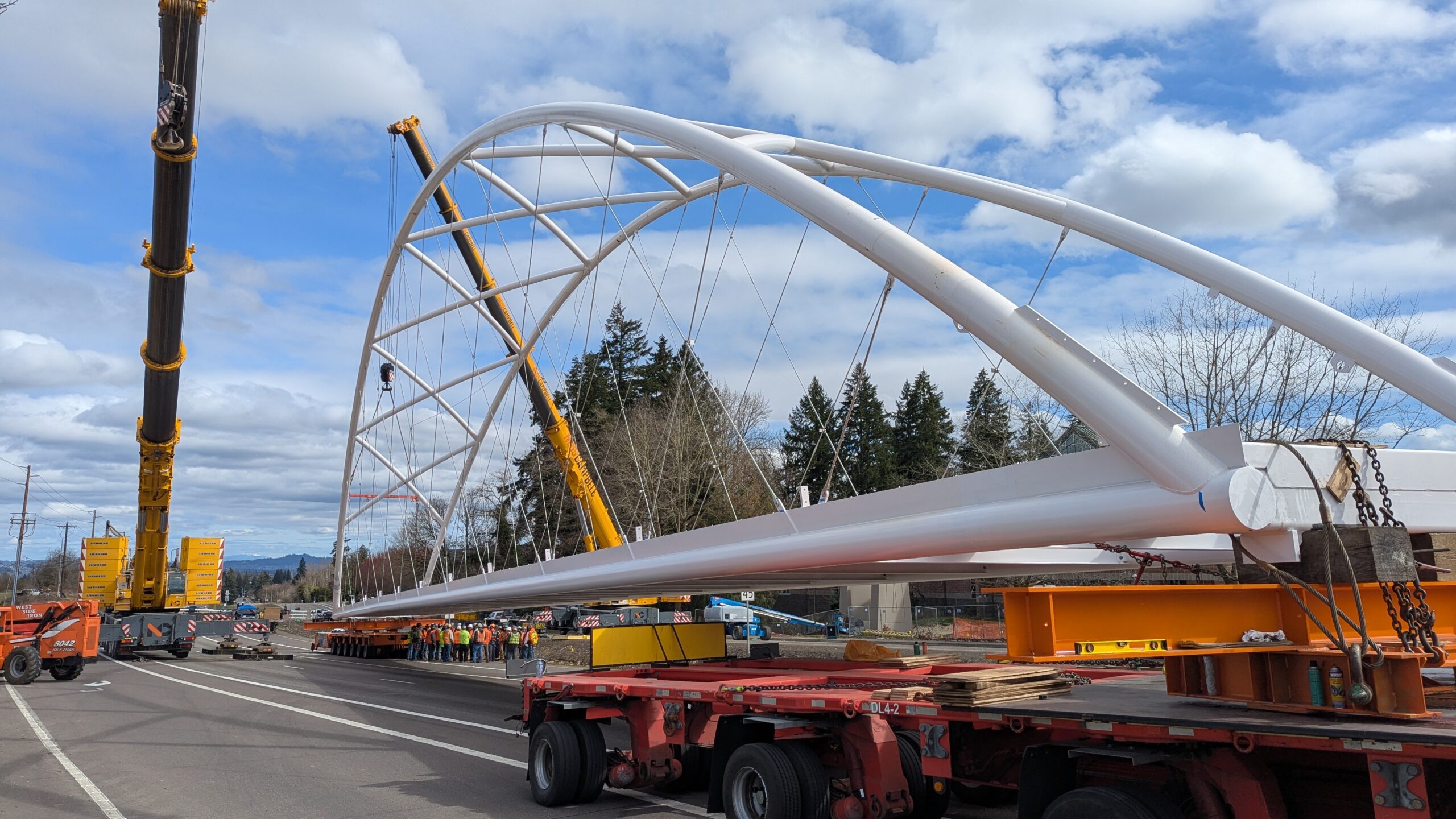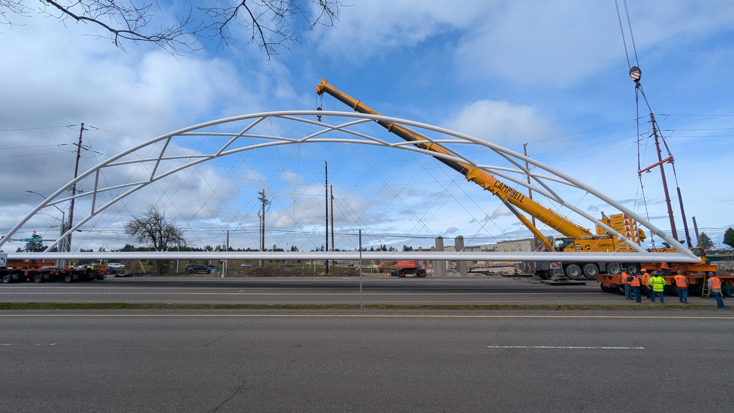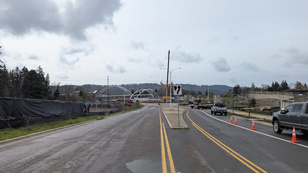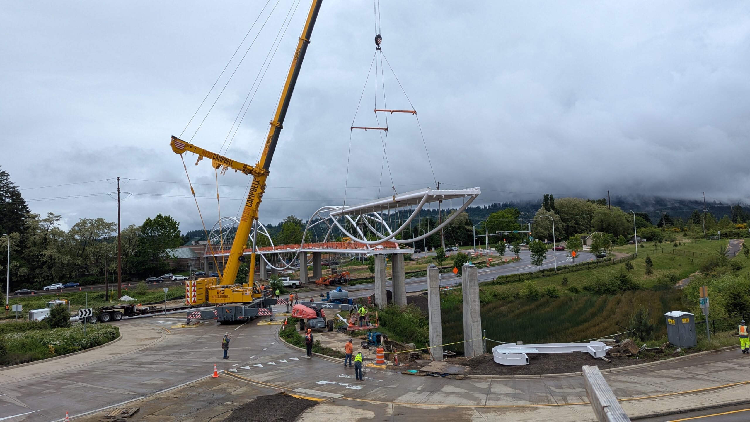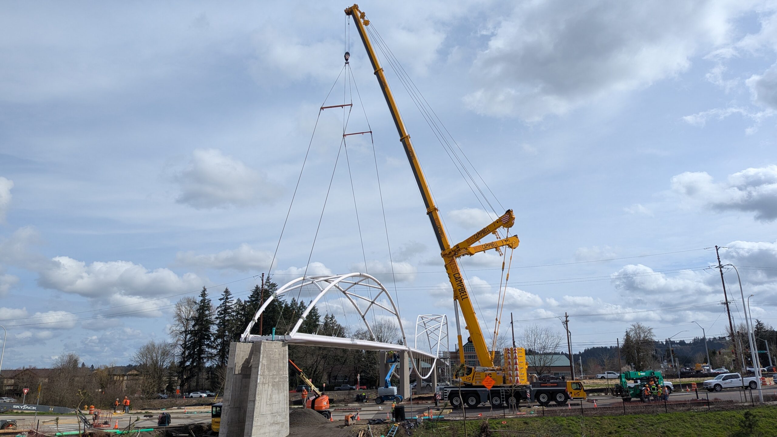 Two cranes lift span 5 from its assembly bed onto transport dollies on Sunset Blvd.As span 5 is anchored to the transporters, the cranes prepare to move onto Highway 99W to set it into its final position.Span 5 inches toward its final destination as the completed bridge bents await arrival of the other four spans. The first crane is staged for the final span 5 pick over the highway.A final look across the highway from the future east approach before the bridge moves into place.The scale of span 5 becomes more apparent as it’s lifted incrementally higher from its assembly bed.Sherwood residents and their canines eagerly await span 5’s big move from Sunset onto Highway 99W.The sun emerges on Sunset, offering a first glimpse of the dramatic shadows that the bridge structure will cast.Around 10:30am, traffic controllers stop all traffic detouring from Hwy 99W onto Elwert Rd. and shift the closures barriers to make way for span 5.Span 5 begins its careful movement through the intersection on transportation dollies.The front transporter swings wide toward Elwert Rd as span 5 crosses the intersection.Span 5 begins to turn onto the southbound lanes of Highway 99W.At the tightest point along its journey, span 5 fills the full diagonal width of 99W/Elwert/Sunset intersection.Reality confirms the viability of the bridge movement path that was studied through extensive digital and physical 3D modeling.The rear transporter finally swings into the intersection to complete the turn onto the southbound highway lanes.Span 5 just clears the highway median traffic signals as it completes the turn.Span 5 parks on the southbound lanes of Highway 99W, allowing detoured traffic to resume onto Elwert Rd after just a 20-minute pause.The cranes prepare to pick span 5 into its final position, offering a pause in the process to observe the completed structure in a temporary position from various vantage points.This temporary slope is more extreme than the final condition, but clearly demonstrates how the existing highway grades are leveraged to increase clearance under the bridge and minimize pedestrian ramp lengths.This view from the west abutment shows the three roads that the completed bridge will cross. The detoured highway 99W traffic on Elwert Rd. is denser than typical, but not much worse than the daily peaks on school days.Utility lines along the highway were raised, undergrounded, and temporarily shifted with a shoefly to create clearance for the erection cranes.The tilted arches create dynamic oblique views along the structure.Crews wrap up a final safety meeting and move into position to lift span 5 into place.The first crane is attached to the east end of span 5.The east end of span 5 lifts off of the transportation dolly, which moves out of the way as the other transporter drives toward the second crane.The west end of span 5 crawls down the southbound lanes of Hwy 99W to be picked by the second crane. Span 5 swings carefully into place through a choregraphed effort of two cranes.Span 5 is set onto its bearings and welded into place atop the concrete bents.As welders permanently anchor span 5 into place, it can be observed from views across the surrounding area.Span 5 from the roundabout.Span 5 from Highway 99W Southbound, in a view that will reopen to drivers in a matter of hours.Span 5 from Highway 99W at Elwert. Span 5 from outside the YMCA gym.Span 5 from Sunset Blvd. at Hwy 99W. The bridge span was installed and the highway reopened more than a day early, with only a 24-hour road closure.