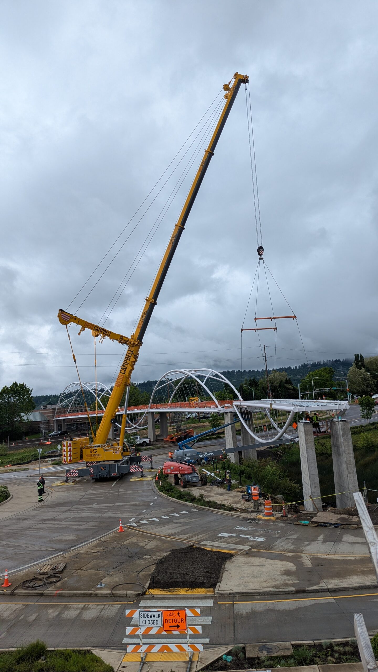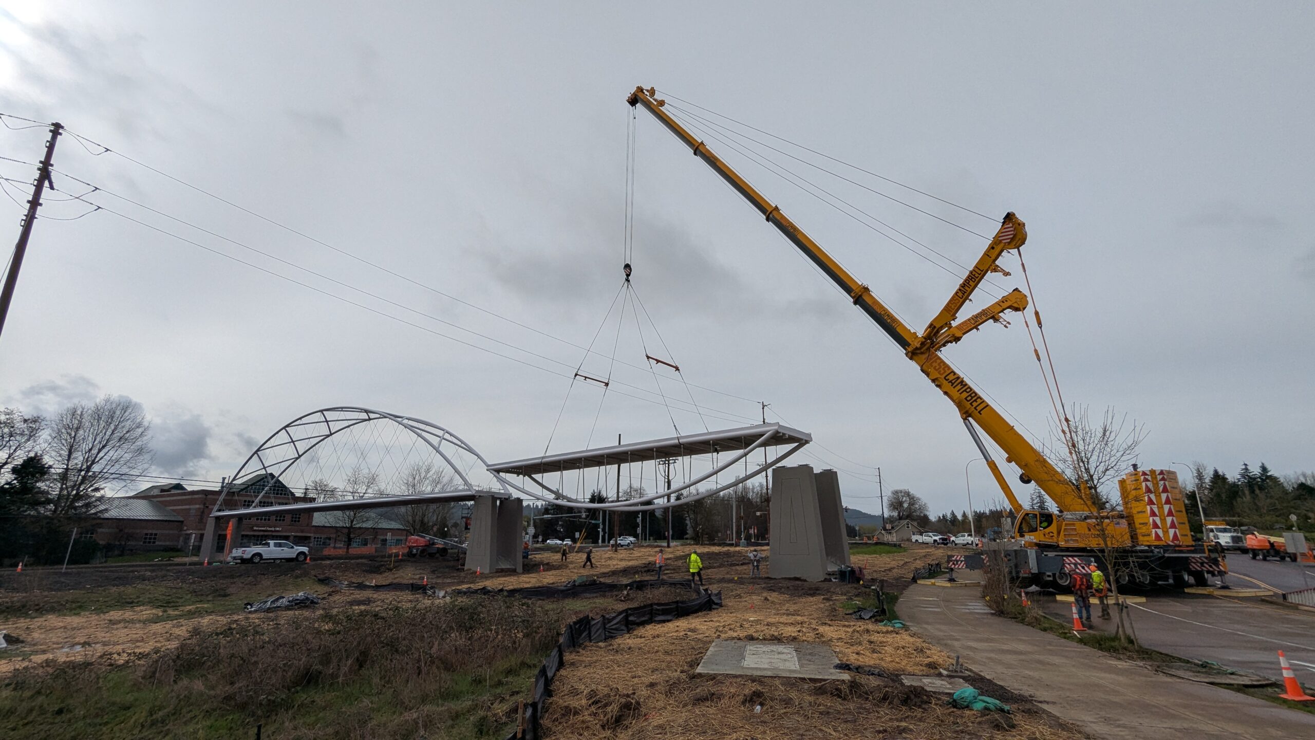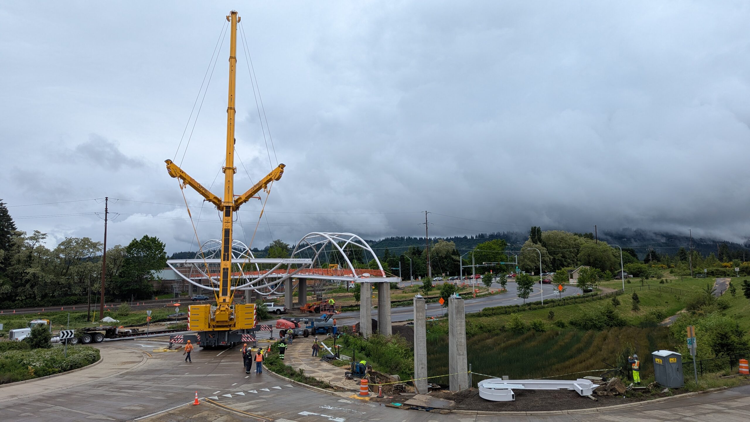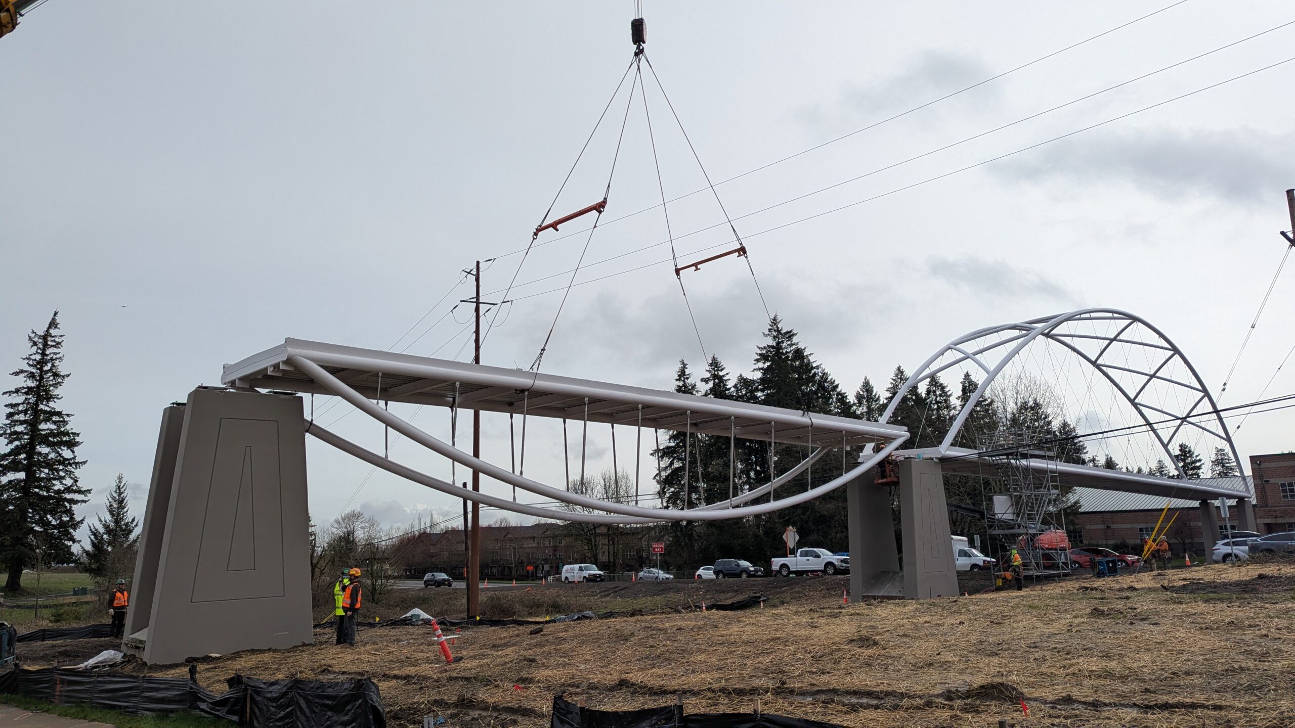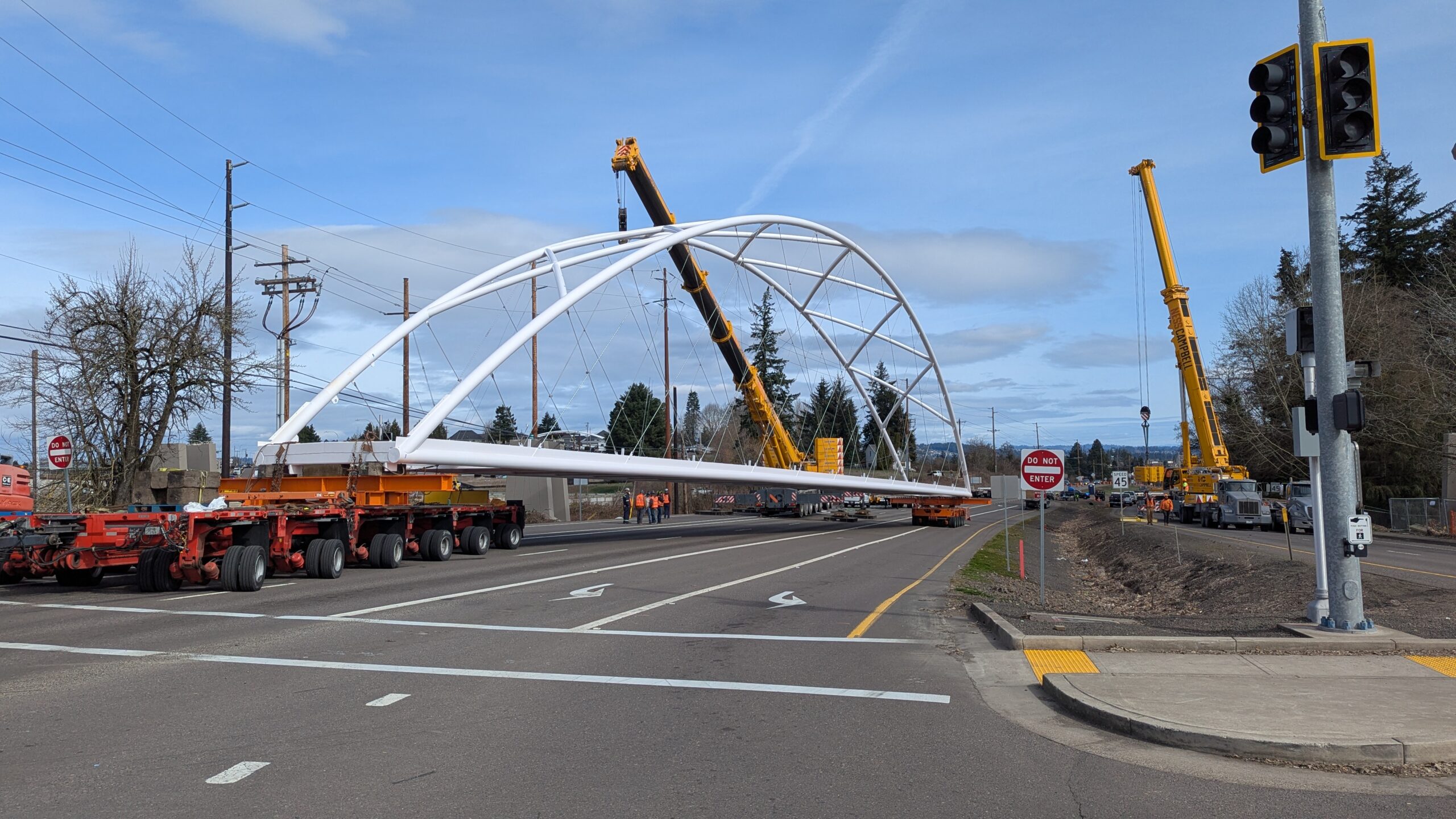 Two cranes lift span 5 from its assembly bed onto transport dollies on Sunset Blvd.As span 5 is anchored to the transporters, the cranes prepare to move onto Highway 99W to set it into its final position.Span 5 inches toward its final destination as the completed bridge bents await arrival of the other four spans. The first crane is staged for the final span 5 pick over the highway.A final look across the highway from the future east approach before the bridge moves into place.The scale of span 5 becomes more apparent as it’s lifted incrementally higher from its assembly bed.Sherwood residents and their canines eagerly await span 5’s big move from Sunset onto Highway 99W.The sun emerges on Sunset, offering a first glimpse of the dramatic shadows that the bridge structure will cast.Around 10:30am, traffic controllers stop all traffic detouring from Hwy 99W onto Elwert Rd. and shift the closures barriers to make way for span 5.Span 5 begins its careful movement through the intersection on transportation dollies.The front transporter swings wide toward Elwert Rd as span 5 crosses the intersection.Span 5 begins to turn onto the southbound lanes of Highway 99W.At the tightest point along its journey, span 5 fills the full diagonal width of 99W/Elwert/Sunset intersection.Reality confirms the viability of the bridge movement path that was studied through extensive digital and physical 3D modeling.The rear transporter finally swings into the intersection to complete the turn onto the southbound highway lanes.Span 5 just clears the highway median traffic signals as it completes the turn.Span 5 parks on the southbound lanes of Highway 99W, allowing detoured traffic to resume onto Elwert Rd after just a 20-minute pause.The cranes prepare to pick span 5 into its final position, offering a pause in the process to observe the completed structure in a temporary position from various vantage points.This temporary slope is more extreme than the final condition, but clearly demonstrates how the existing highway grades are leveraged to increase clearance under the bridge and minimize pedestrian ramp lengths.This view from the west abutment shows the three roads that the completed bridge will cross. The detoured highway 99W traffic on Elwert Rd. is denser than typical, but not much worse than the daily peaks on school days.Utility lines along the highway were raised, undergrounded, and temporarily shifted with a shoefly to create clearance for the erection cranes.The tilted arches create dynamic oblique views along the structure.Crews wrap up a final safety meeting and move into position to lift span 5 into place.The first crane is attached to the east end of span 5.The east end of span 5 lifts off of the transportation dolly, which moves out of the way as the other transporter drives toward the second crane.The west end of span 5 crawls down the southbound lanes of Hwy 99W to be picked by the second crane. Span 5 swings carefully into place through a choregraphed effort of two cranes.Span 5 is set onto its bearings and welded into place atop the concrete bents.As welders permanently anchor span 5 into place, it can be observed from views across the surrounding area.Span 5 from the roundabout.Span 5 from Highway 99W Southbound, in a view that will reopen to drivers in a matter of hours.Span 5 from Highway 99W at Elwert. Span 5 from outside the YMCA gym.Span 5 from Sunset Blvd. at Hwy 99W. The bridge span was installed and the highway reopened more than a day early, with only a 24-hour road closure.