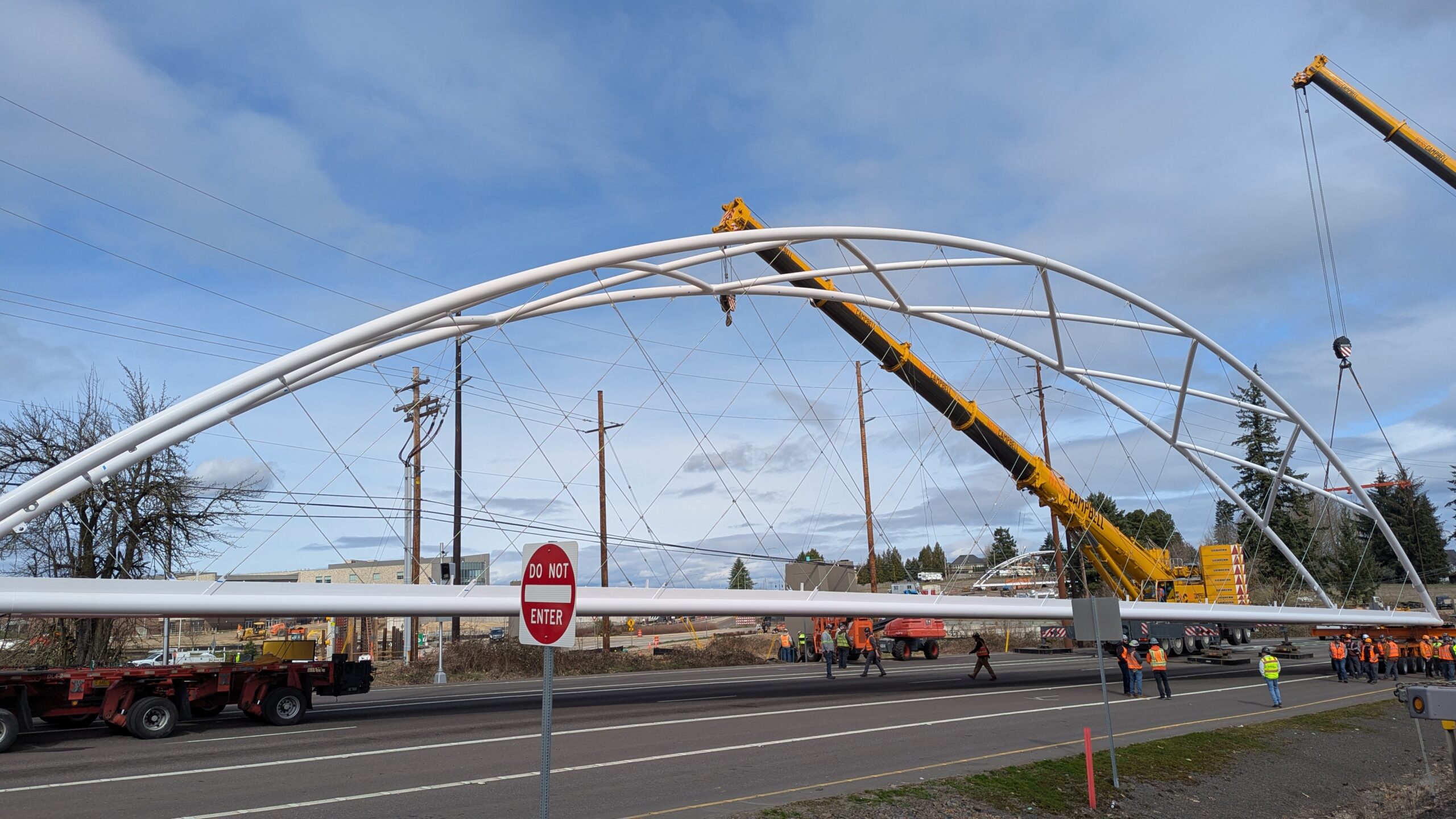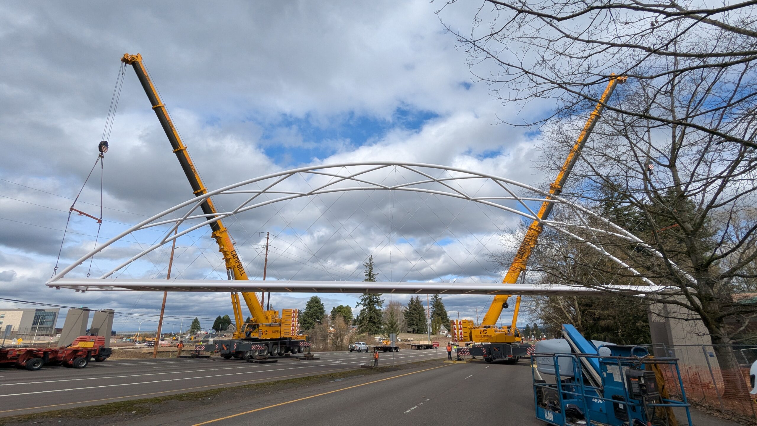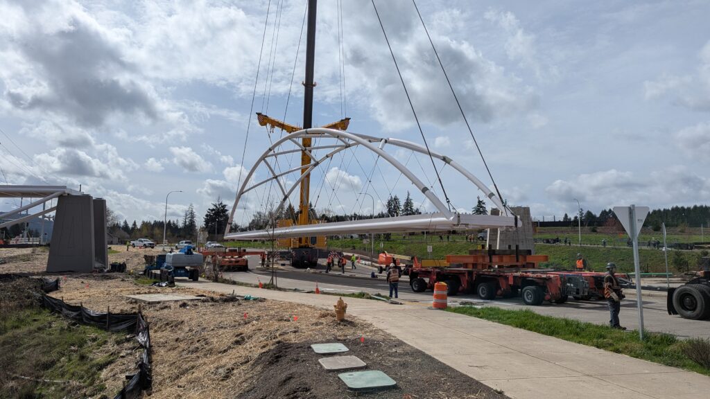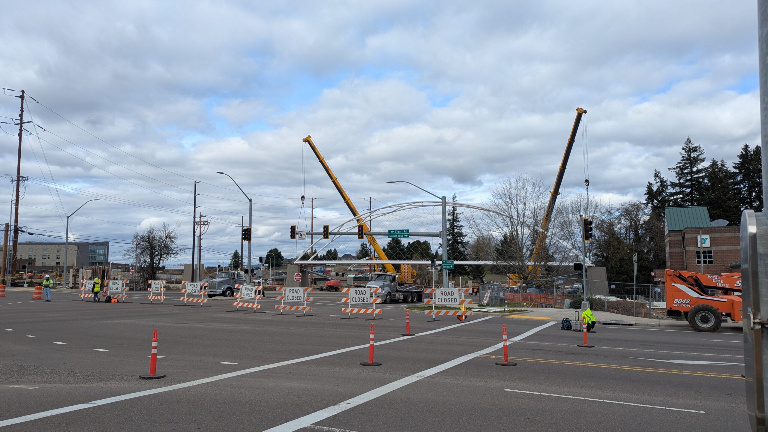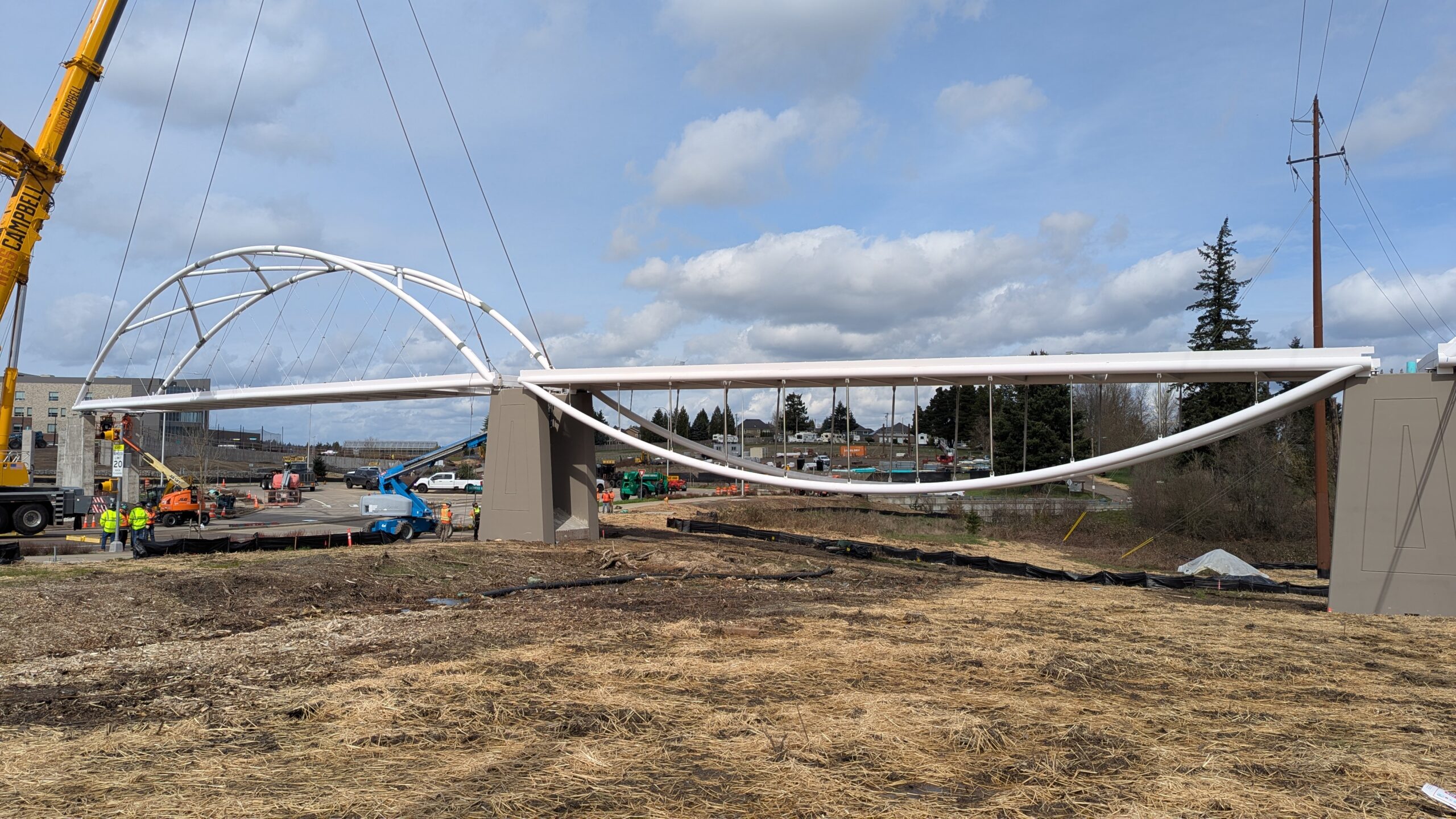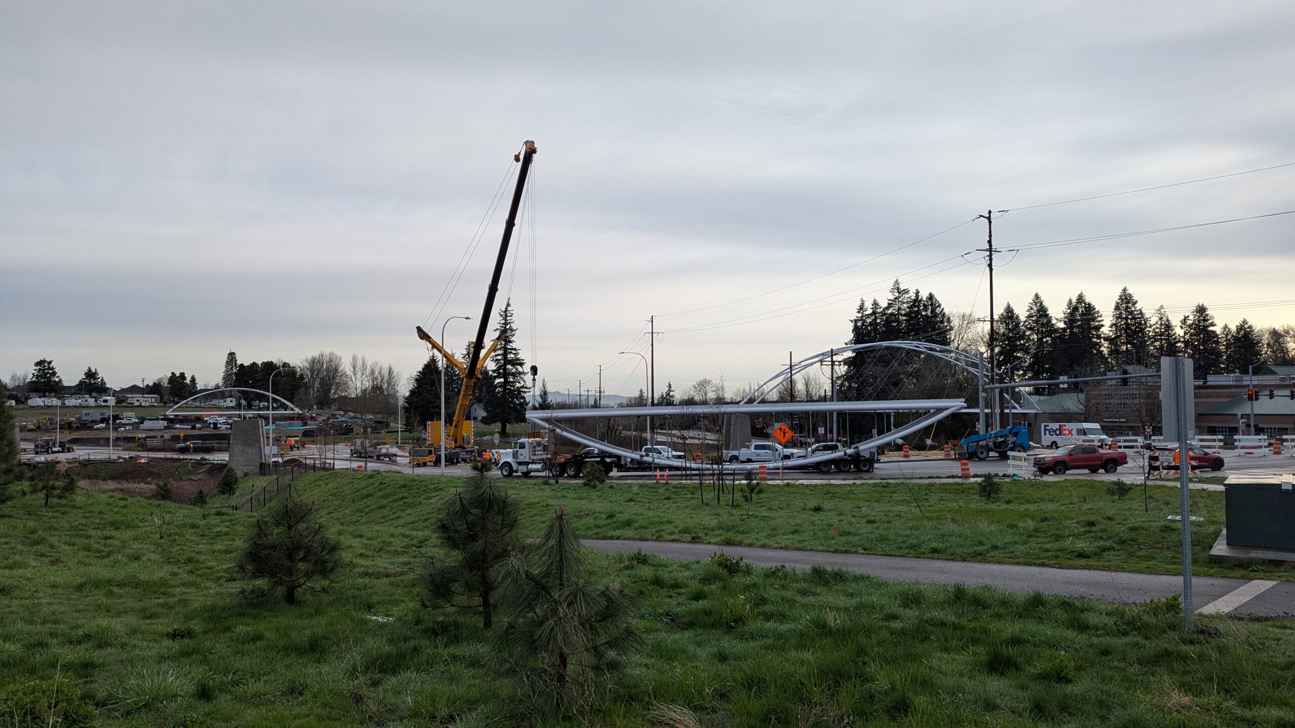 Two cranes lift span 5 from its assembly bed onto transport dollies on Sunset Blvd.As span 5 is anchored to the transporters, the cranes prepare to move onto Highway 99W to set it into its final position.Span 5 inches toward its final destination as the completed bridge bents await arrival of the other four spans. The first crane is staged for the final span 5 pick over the highway.A final look across the highway from the future east approach before the bridge moves into place.The scale of span 5 becomes more apparent as it’s lifted incrementally higher from its assembly bed.Sherwood residents and their canines eagerly await span 5’s big move from Sunset onto Highway 99W.The sun emerges on Sunset, offering a first glimpse of the dramatic shadows that the bridge structure will cast.Around 10:30am, traffic controllers stop all traffic detouring from Hwy 99W onto Elwert Rd. and shift the closures barriers to make way for span 5.Span 5 begins its careful movement through the intersection on transportation dollies.The front transporter swings wide toward Elwert Rd as span 5 crosses the intersection.Span 5 begins to turn onto the southbound lanes of Highway 99W.At the tightest point along its journey, span 5 fills the full diagonal width of 99W/Elwert/Sunset intersection.Reality confirms the viability of the bridge movement path that was studied through extensive digital and physical 3D modeling.The rear transporter finally swings into the intersection to complete the turn onto the southbound highway lanes.Span 5 just clears the highway median traffic signals as it completes the turn.Span 5 parks on the southbound lanes of Highway 99W, allowing detoured traffic to resume onto Elwert Rd after just a 20-minute pause.The cranes prepare to pick span 5 into its final position, offering a pause in the process to observe the completed structure in a temporary position from various vantage points.This temporary slope is more extreme than the final condition, but clearly demonstrates how the existing highway grades are leveraged to increase clearance under the bridge and minimize pedestrian ramp lengths.This view from the west abutment shows the three roads that the completed bridge will cross. The detoured highway 99W traffic on Elwert Rd. is denser than typical, but not much worse than the daily peaks on school days.Utility lines along the highway were raised, undergrounded, and temporarily shifted with a shoefly to create clearance for the erection cranes.The tilted arches create dynamic oblique views along the structure.Crews wrap up a final safety meeting and move into position to lift span 5 into place.The first crane is attached to the east end of span 5.The east end of span 5 lifts off of the transportation dolly, which moves out of the way as the other transporter drives toward the second crane.The west end of span 5 crawls down the southbound lanes of Hwy 99W to be picked by the second crane. Span 5 swings carefully into place through a choregraphed effort of two cranes.Span 5 is set onto its bearings and welded into place atop the concrete bents.As welders permanently anchor span 5 into place, it can be observed from views across the surrounding area.Span 5 from the roundabout.Span 5 from Highway 99W Southbound, in a view that will reopen to drivers in a matter of hours.Span 5 from Highway 99W at Elwert. Span 5 from outside the YMCA gym.Span 5 from Sunset Blvd. at Hwy 99W. The bridge span was installed and the highway reopened more than a day early, with only a 24-hour road closure.
