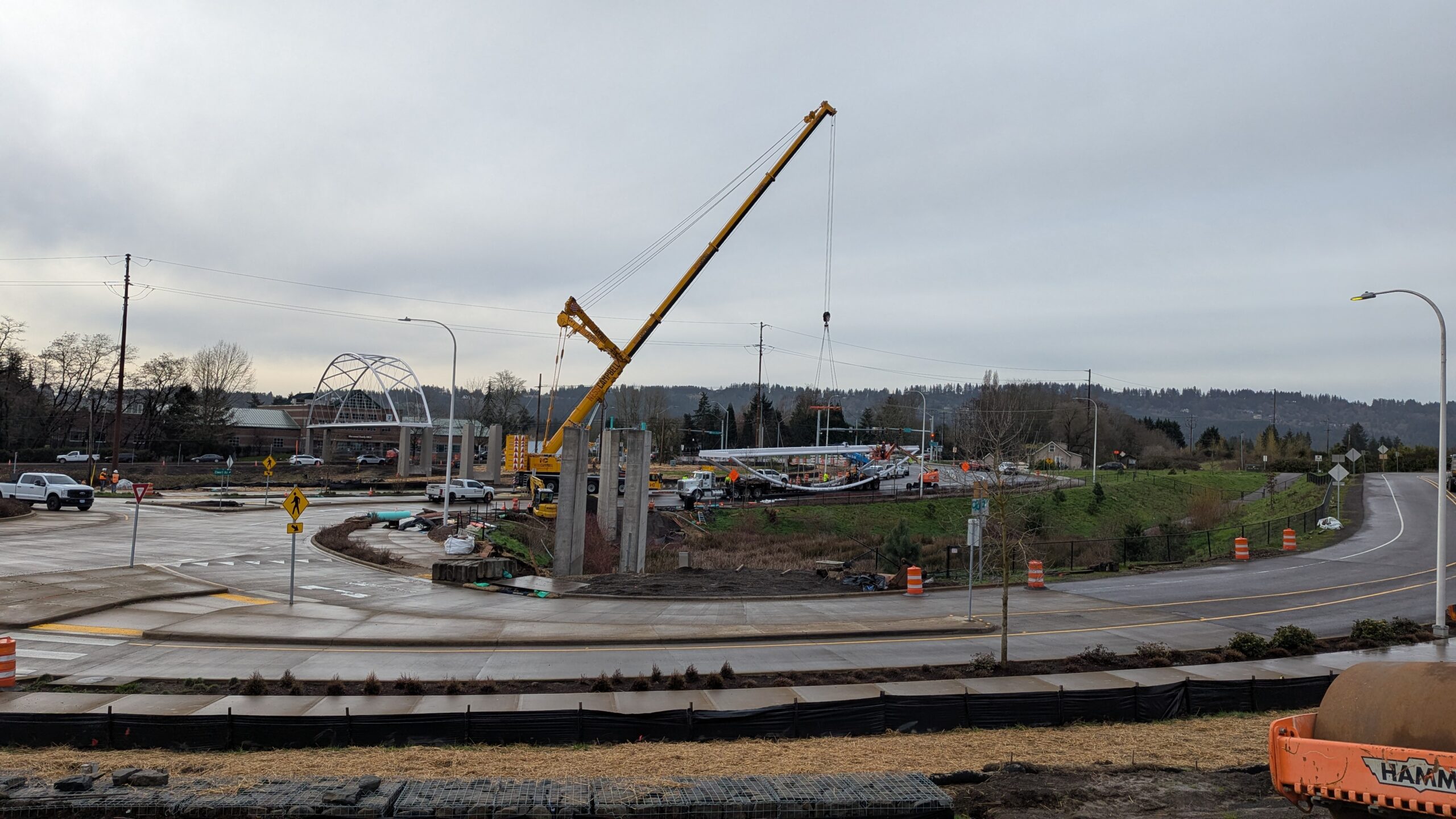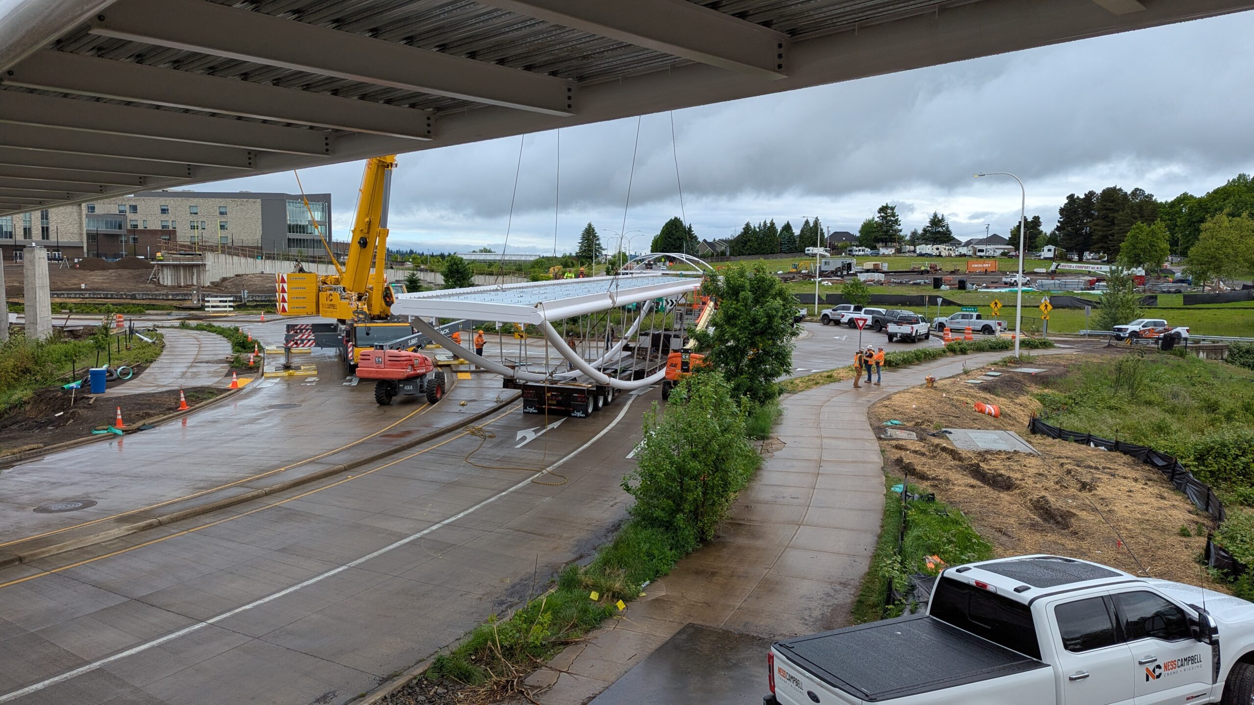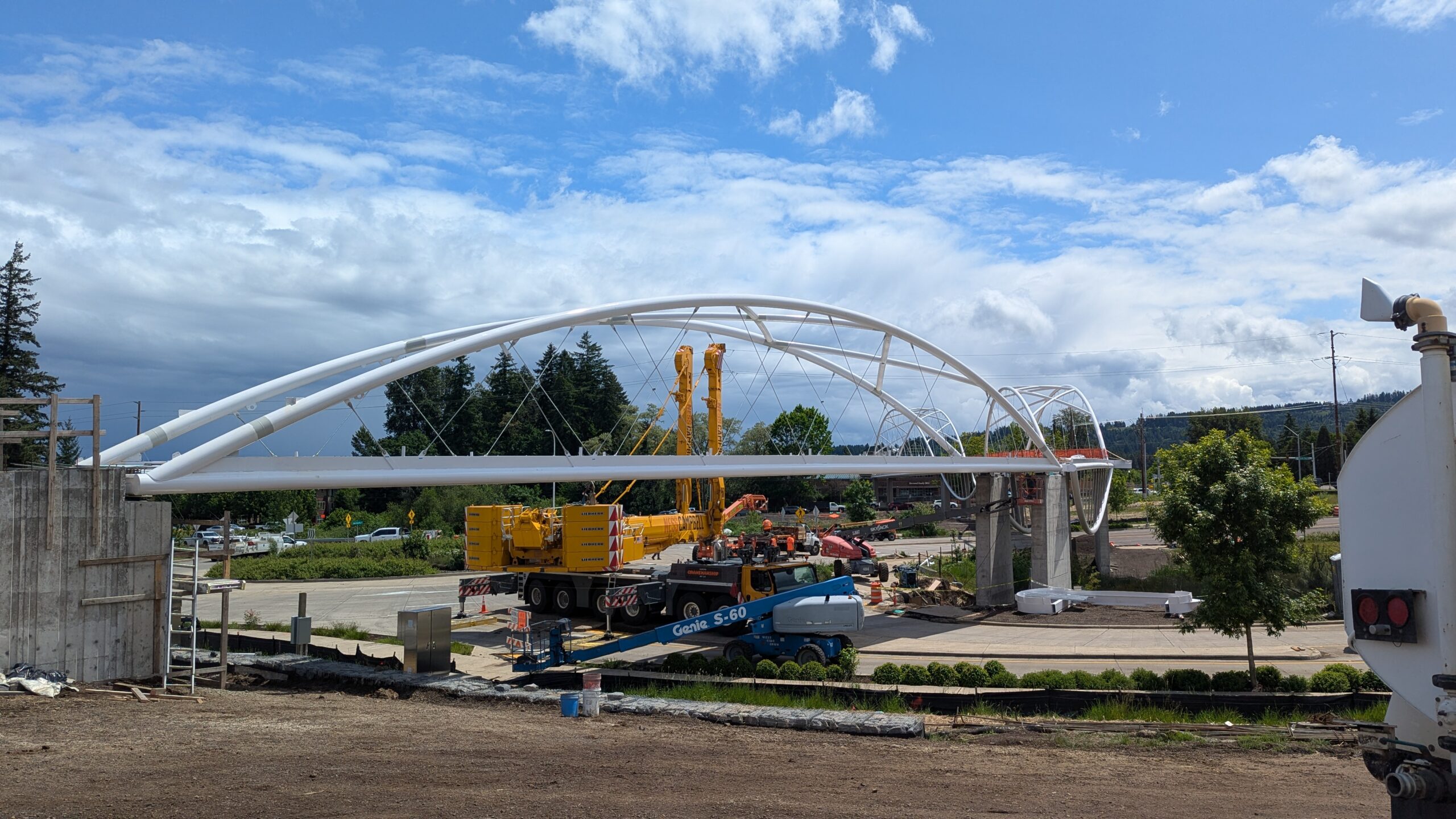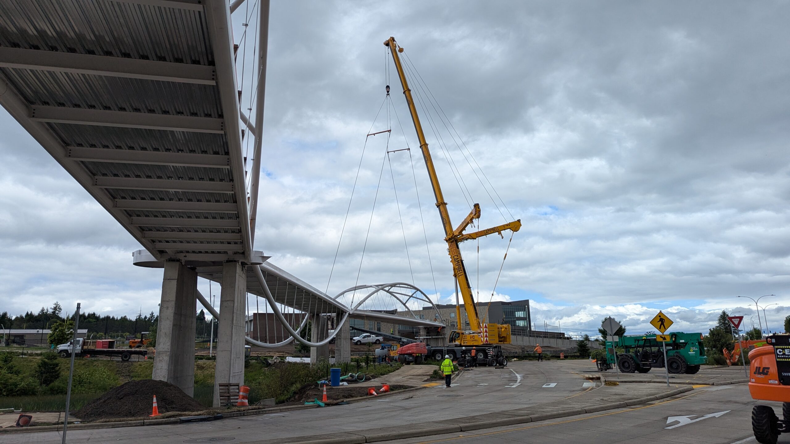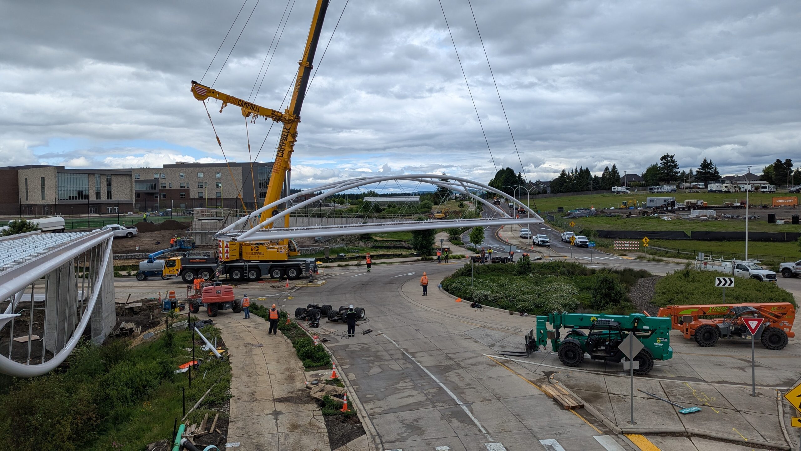 Two cranes lift span 5 from its assembly bed onto transport dollies on Sunset Blvd.As span 5 is anchored to the transporters, the cranes prepare to move onto Highway 99W to set it into its final position.Span 5 inches toward its final destination as the completed bridge bents await arrival of the other four spans. The first crane is staged for the final span 5 pick over the highway.A final look across the highway from the future east approach before the bridge moves into place.The scale of span 5 becomes more apparent as it’s lifted incrementally higher from its assembly bed.Sherwood residents and their canines eagerly await span 5’s big move from Sunset onto Highway 99W.The sun emerges on Sunset, offering a first glimpse of the dramatic shadows that the bridge structure will cast.Around 10:30am, traffic controllers stop all traffic detouring from Hwy 99W onto Elwert Rd. and shift the closures barriers to make way for span 5.Span 5 begins its careful movement through the intersection on transportation dollies.The front transporter swings wide toward Elwert Rd as span 5 crosses the intersection.Span 5 begins to turn onto the southbound lanes of Highway 99W.At the tightest point along its journey, span 5 fills the full diagonal width of 99W/Elwert/Sunset intersection.Reality confirms the viability of the bridge movement path that was studied through extensive digital and physical 3D modeling.The rear transporter finally swings into the intersection to complete the turn onto the southbound highway lanes.Span 5 just clears the highway median traffic signals as it completes the turn.Span 5 parks on the southbound lanes of Highway 99W, allowing detoured traffic to resume onto Elwert Rd after just a 20-minute pause.The cranes prepare to pick span 5 into its final position, offering a pause in the process to observe the completed structure in a temporary position from various vantage points.This temporary slope is more extreme than the final condition, but clearly demonstrates how the existing highway grades are leveraged to increase clearance under the bridge and minimize pedestrian ramp lengths.This view from the west abutment shows the three roads that the completed bridge will cross. The detoured highway 99W traffic on Elwert Rd. is denser than typical, but not much worse than the daily peaks on school days.Utility lines along the highway were raised, undergrounded, and temporarily shifted with a shoefly to create clearance for the erection cranes.The tilted arches create dynamic oblique views along the structure.Crews wrap up a final safety meeting and move into position to lift span 5 into place.The first crane is attached to the east end of span 5.The east end of span 5 lifts off of the transportation dolly, which moves out of the way as the other transporter drives toward the second crane.The west end of span 5 crawls down the southbound lanes of Hwy 99W to be picked by the second crane. Span 5 swings carefully into place through a choregraphed effort of two cranes.Span 5 is set onto its bearings and welded into place atop the concrete bents.As welders permanently anchor span 5 into place, it can be observed from views across the surrounding area.Span 5 from the roundabout.Span 5 from Highway 99W Southbound, in a view that will reopen to drivers in a matter of hours.Span 5 from Highway 99W at Elwert. Span 5 from outside the YMCA gym.Span 5 from Sunset Blvd. at Hwy 99W. The bridge span was installed and the highway reopened more than a day early, with only a 24-hour road closure.