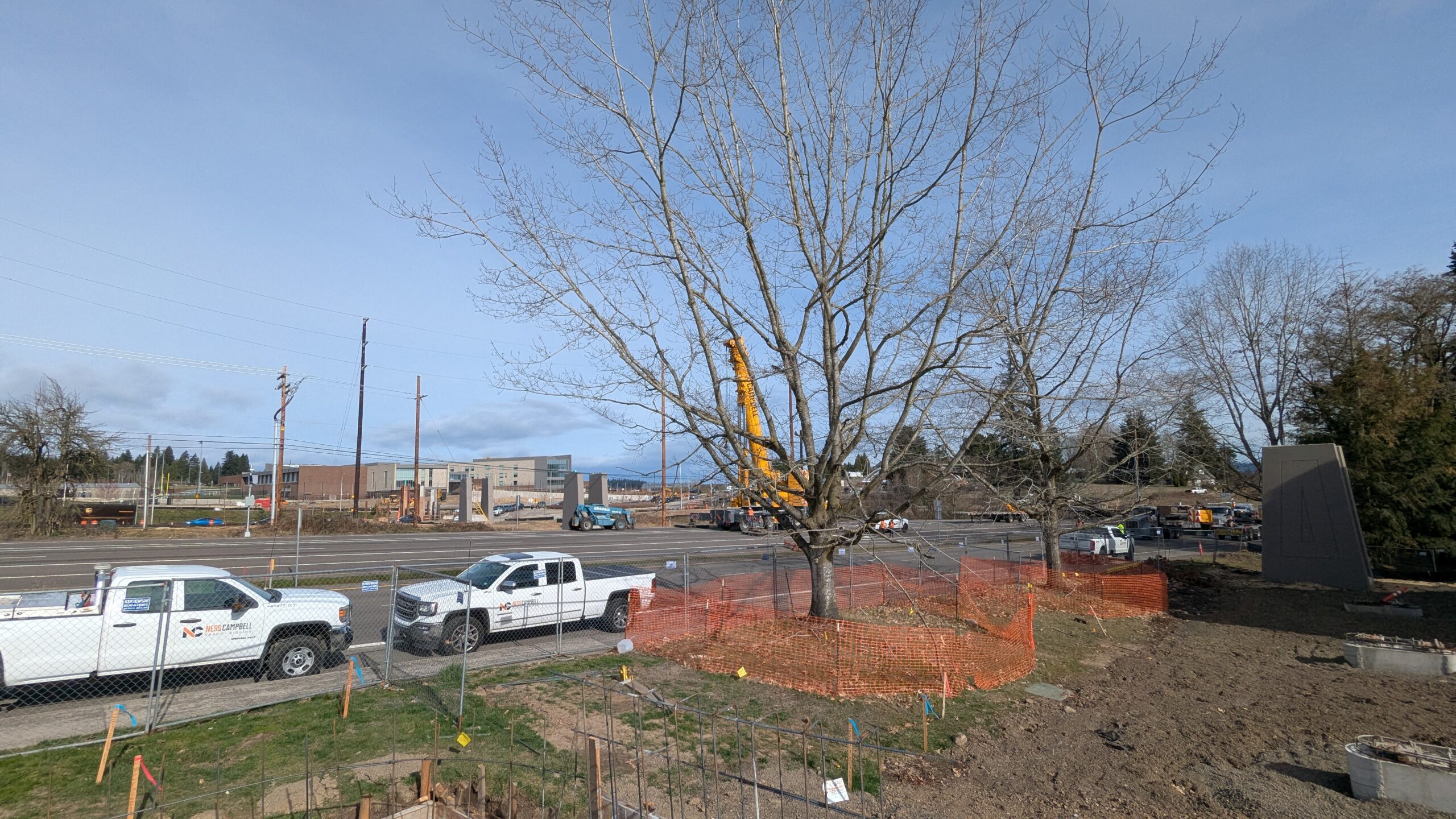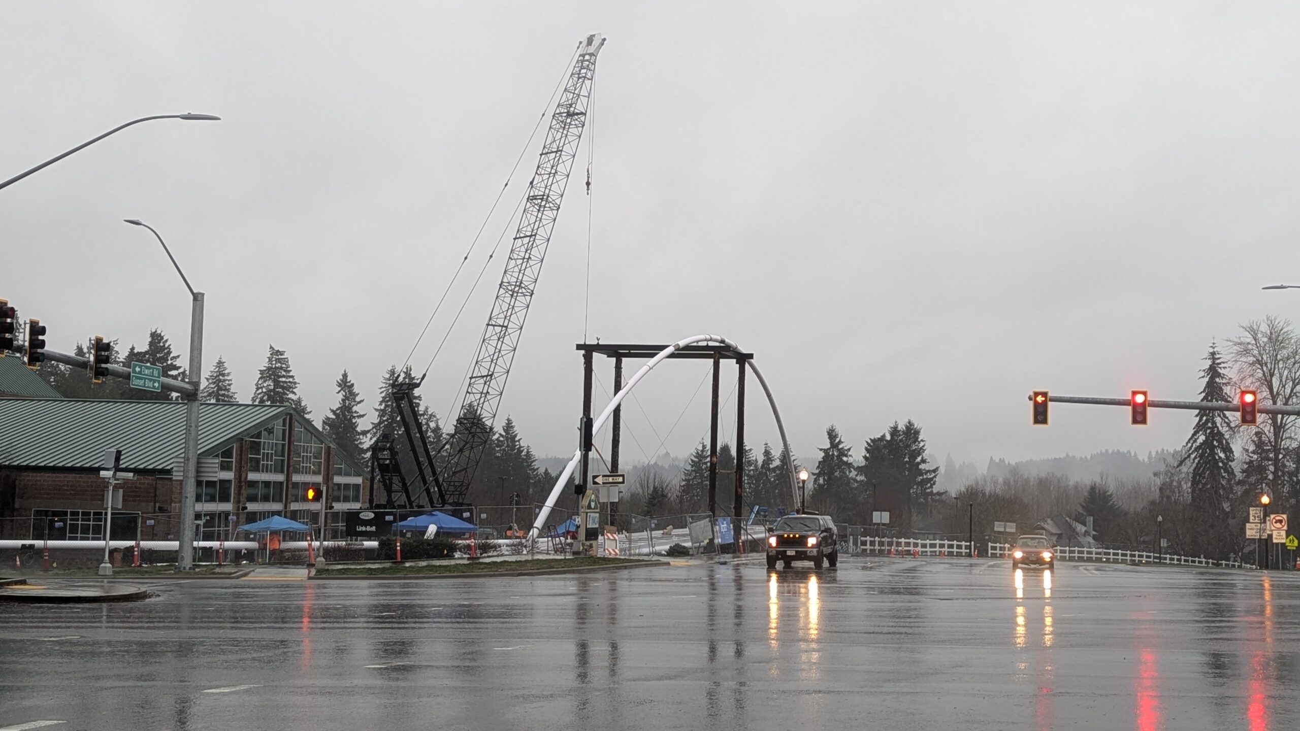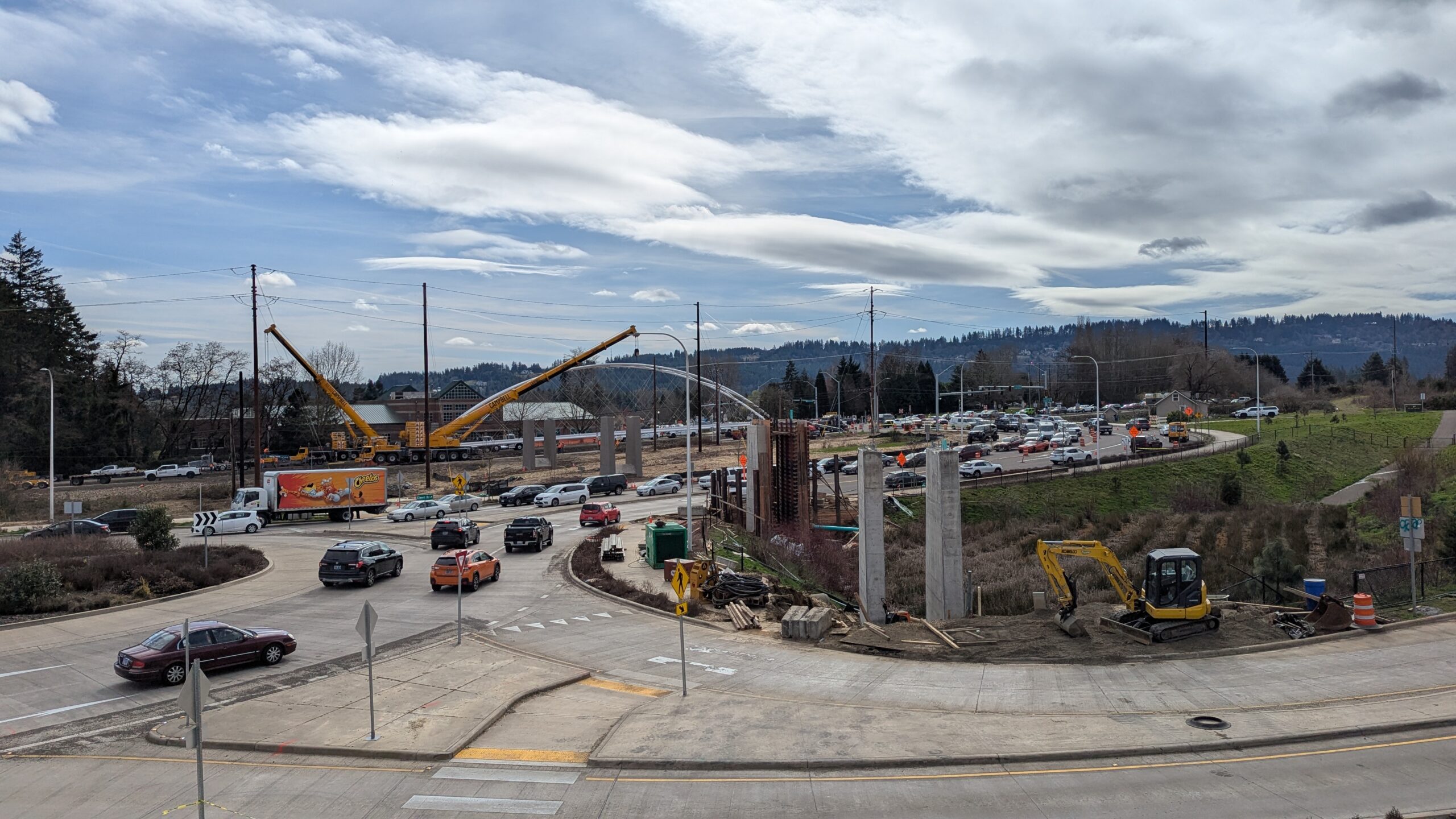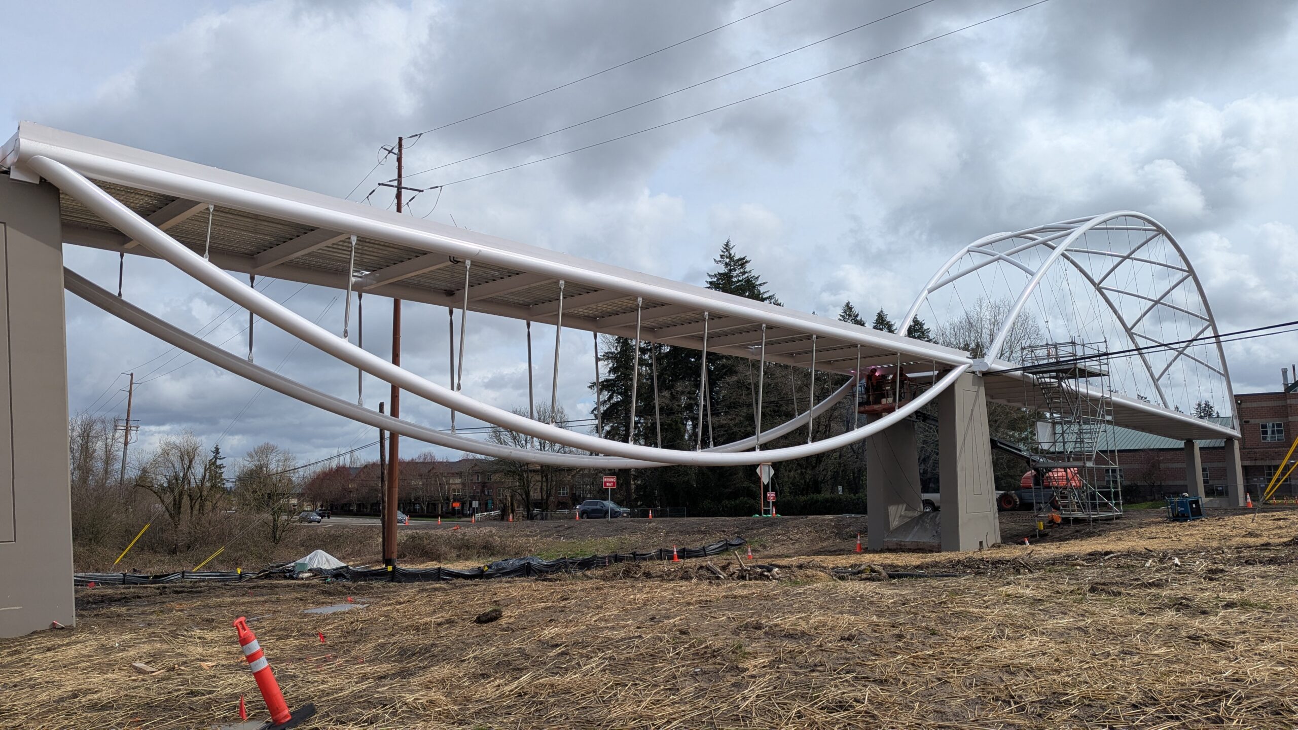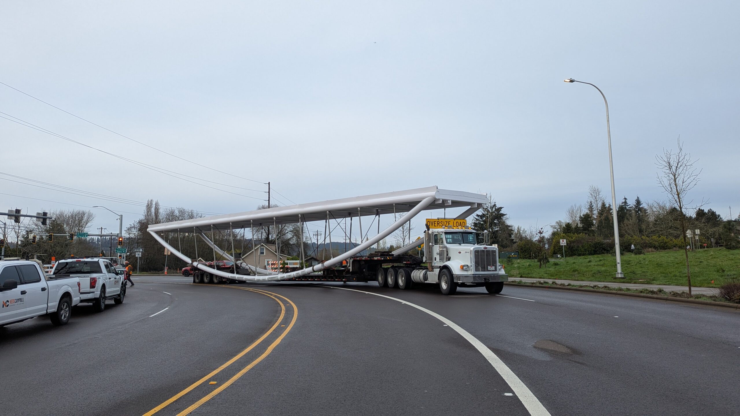 Two cranes lift span 5 from its assembly bed onto transport dollies on Sunset Blvd.As span 5 is anchored to the transporters, the cranes prepare to move onto Highway 99W to set it into its final position.Span 5 inches toward its final destination as the completed bridge bents await arrival of the other four spans. The first crane is staged for the final span 5 pick over the highway.A final look across the highway from the future east approach before the bridge moves into place.The scale of span 5 becomes more apparent as it’s lifted incrementally higher from its assembly bed.Sherwood residents and their canines eagerly await span 5’s big move from Sunset onto Highway 99W.The sun emerges on Sunset, offering a first glimpse of the dramatic shadows that the bridge structure will cast.Around 10:30am, traffic controllers stop all traffic detouring from Hwy 99W onto Elwert Rd. and shift the closures barriers to make way for span 5.Span 5 begins its careful movement through the intersection on transportation dollies.The front transporter swings wide toward Elwert Rd as span 5 crosses the intersection.Span 5 begins to turn onto the southbound lanes of Highway 99W.At the tightest point along its journey, span 5 fills the full diagonal width of 99W/Elwert/Sunset intersection.Reality confirms the viability of the bridge movement path that was studied through extensive digital and physical 3D modeling.The rear transporter finally swings into the intersection to complete the turn onto the southbound highway lanes.Span 5 just clears the highway median traffic signals as it completes the turn.Span 5 parks on the southbound lanes of Highway 99W, allowing detoured traffic to resume onto Elwert Rd after just a 20-minute pause.The cranes prepare to pick span 5 into its final position, offering a pause in the process to observe the completed structure in a temporary position from various vantage points.This temporary slope is more extreme than the final condition, but clearly demonstrates how the existing highway grades are leveraged to increase clearance under the bridge and minimize pedestrian ramp lengths.This view from the west abutment shows the three roads that the completed bridge will cross. The detoured highway 99W traffic on Elwert Rd. is denser than typical, but not much worse than the daily peaks on school days.Utility lines along the highway were raised, undergrounded, and temporarily shifted with a shoefly to create clearance for the erection cranes.The tilted arches create dynamic oblique views along the structure.Crews wrap up a final safety meeting and move into position to lift span 5 into place.The first crane is attached to the east end of span 5.The east end of span 5 lifts off of the transportation dolly, which moves out of the way as the other transporter drives toward the second crane.The west end of span 5 crawls down the southbound lanes of Hwy 99W to be picked by the second crane. Span 5 swings carefully into place through a choregraphed effort of two cranes.Span 5 is set onto its bearings and welded into place atop the concrete bents.As welders permanently anchor span 5 into place, it can be observed from views across the surrounding area.Span 5 from the roundabout.Span 5 from Highway 99W Southbound, in a view that will reopen to drivers in a matter of hours.Span 5 from Highway 99W at Elwert. Span 5 from outside the YMCA gym.Span 5 from Sunset Blvd. at Hwy 99W. The bridge span was installed and the highway reopened more than a day early, with only a 24-hour road closure.