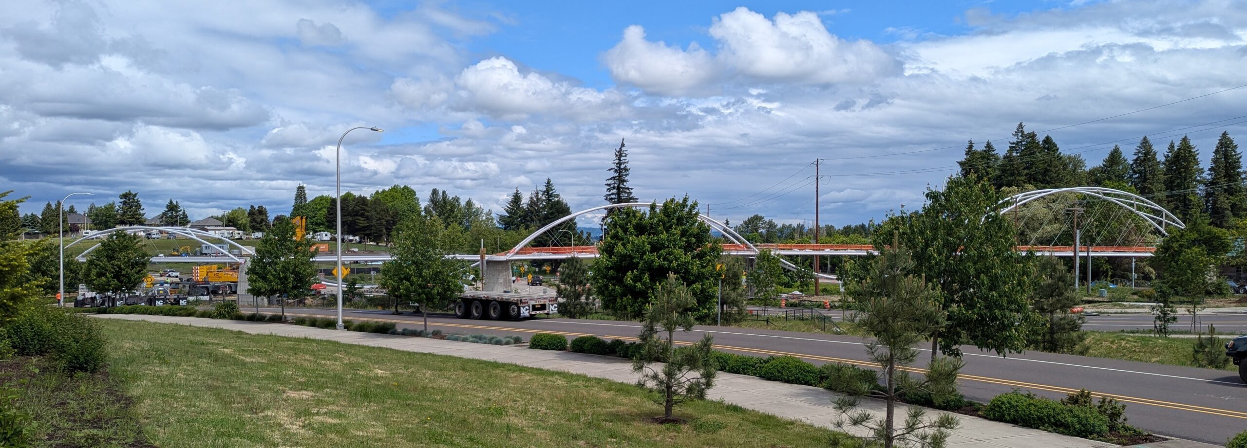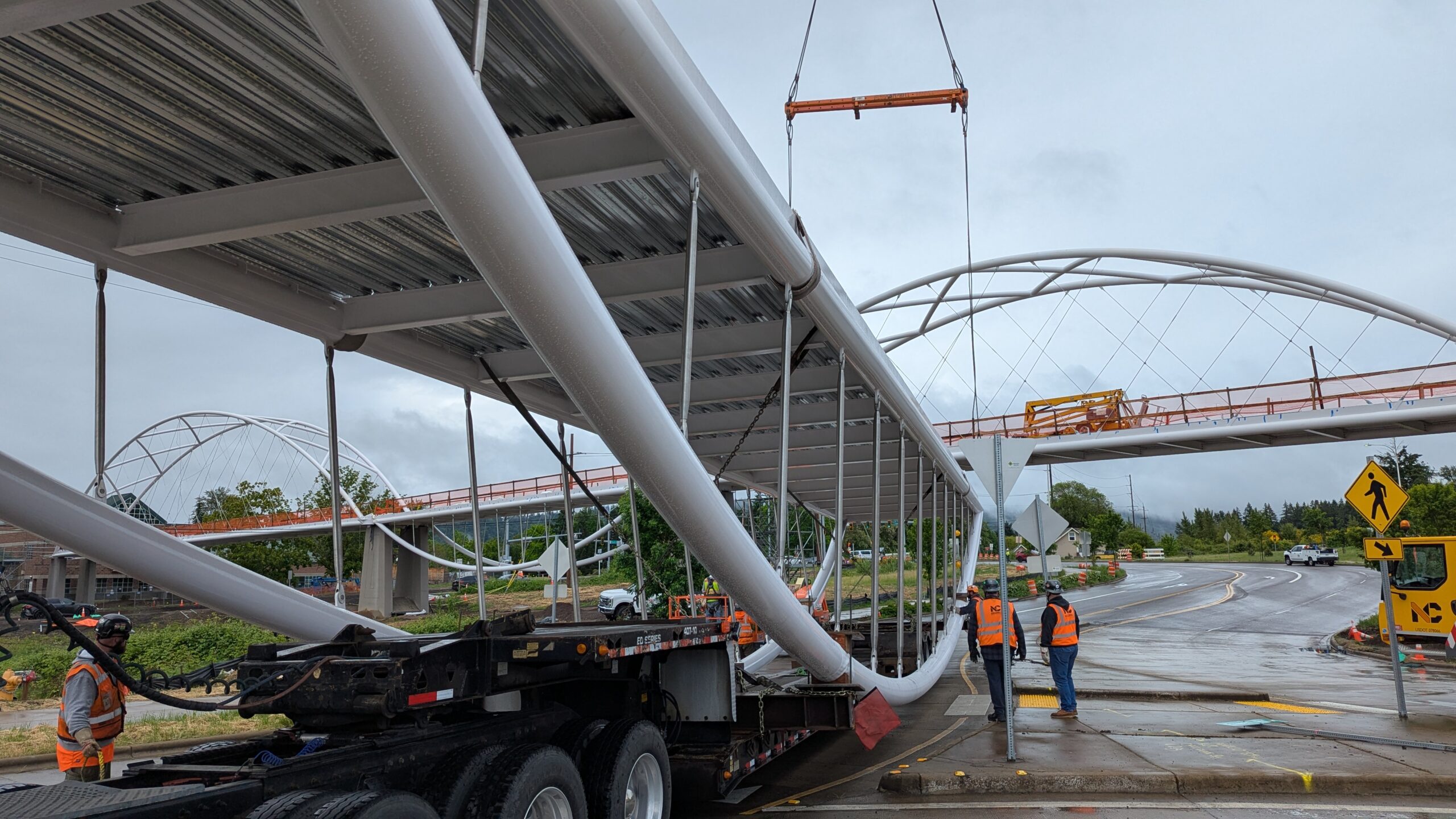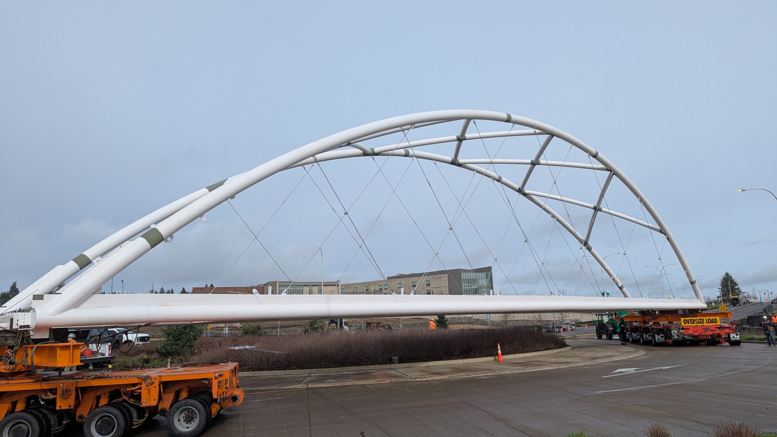 With three bridge spans now on site, the bridge becomes a composition of tied arch shapes as they move toward their final arrangement.The 100-ft-long span 4 arrives on a truck that navigated from Vanouver, WA to Sherwood overnight.The underslung arch spans feature stainless steel compression struts to match the tension rods on the tied arch spans, in a vertical pattern that will follow the railing design.Span 3 turns from the construction staging yard onto Elwert Rd.A single crane will pick each of the remaining bridge spans.A southern view of the full alignment shows span 3 at distant perspective near the final position of span 1 and span 4 in close perspective near its imminent position.Crews begin attaching rigging to four symmetrical points on span 4 for hoisting.Span 3 drives into the roundabout from Elwert Rd. on transportation dollies similar to those used for span 5.Span 3, the second largest at 128ft long and 26 feet tall at the work points, traverses the roundabout.Span 4 lifts off over Elwert Rd. Span 4 swings into place in a remarkably simple maneuver compared to the two-crane operations for span 5.Span 4 is the smallest by a slight margin, at 100 feet long and 13 feet tall at the work points.Span 4 is slowly lowered onto its bearings alongside span 5, with highway traffic uninterrupted.With the first two spans in place, span 3 is staged near its final position over Elwert Rd.The arches of span 4 intersect the temporary placement of span 3 in this view down Elwert Rd.Spans 5 and 3 have the same aspect ratio and arch sizes, offering a play of scale and proportion from different angles.Span 3 prepares to continue the emerging undulating bridge form in this view from the west abutment.With 2/3 the height and length of span 5, span 3 feels slightly more muscular in its proportion of solid steel and void space.Span 3 waits in the roundabout while the crane is relocated.The joints between each span will be articulated with projecting belvedere features to complete the architectural form.The stainless steel struts on span 4 begin to sparkle in the sun for the first time.The crane rigging is stretched across the 128 foot length of span 3.The crane rigging is spread at a wide angle to pick span 3 from its four corners near the bearings.Span 3 lifts off of the transportation dollies along Elwert Rd. Span 3 slowly swings across Elwert Rd.Span 3 starts to touch down on its bearings to reveal the third bay of the undulating bridge form.The raw concrete walls of bent 1 frame a view of the first three bridge spans with the span 3 crane.The crane holds span 3 in place as crews bring to weld it onto the bearings at bent 2 across the stormwater pond.Spans 3 and 4 begin to curve the bridge alignment from the highway toward Sherwood High School.Span 3 joins the bridge in this view from the west abutment, leaving just two spans to complete the grade-separated path.Span 3 brings the bridge past the halfway point in length and features the highest elevation over the roadway at the peak of the bridge vertical profile.As the crane prepares to de-rig, the scale and alignment of the bridge project become much clearer to the public.