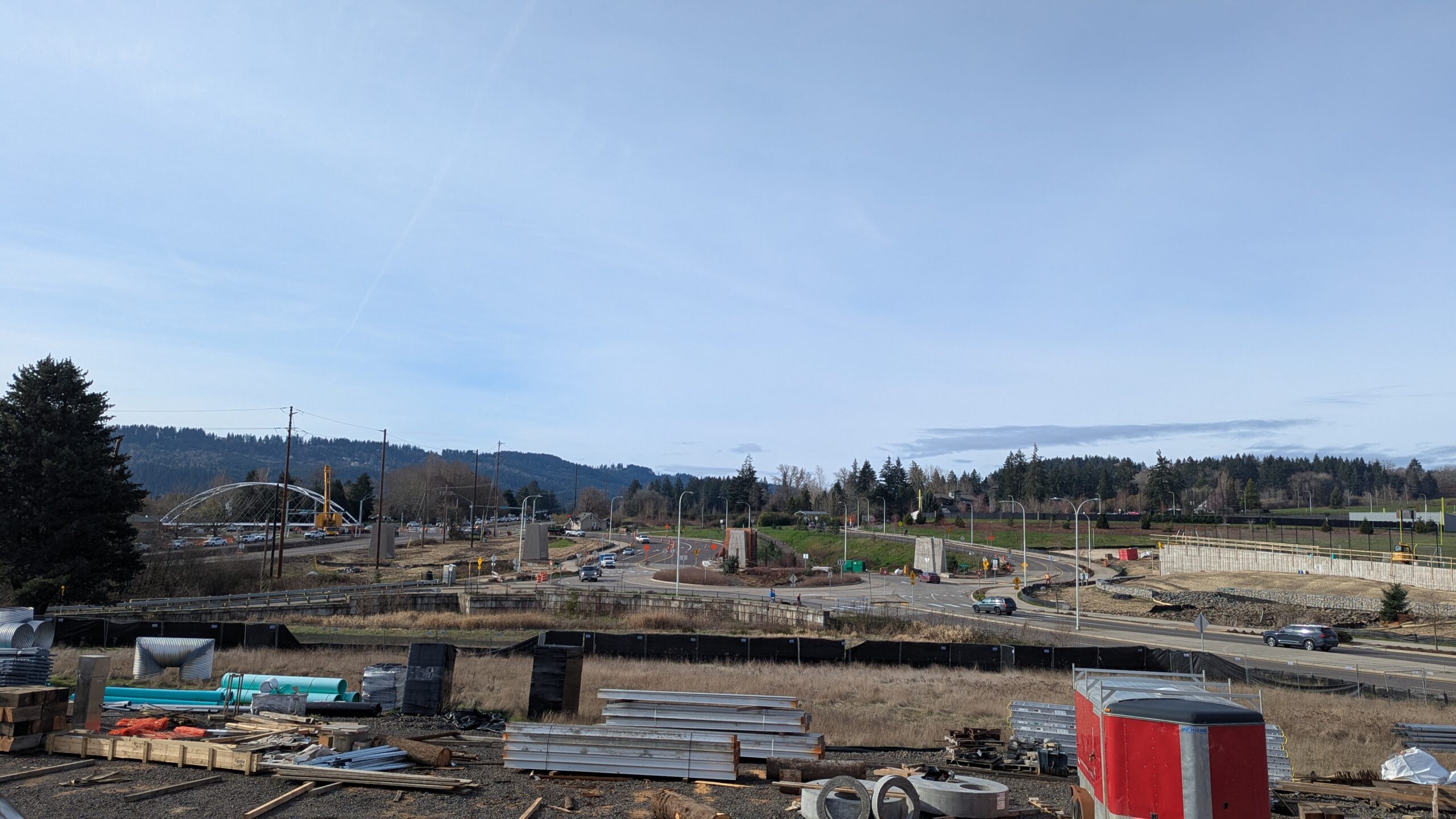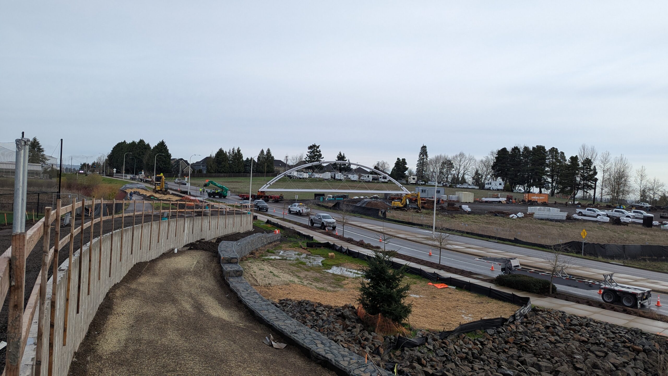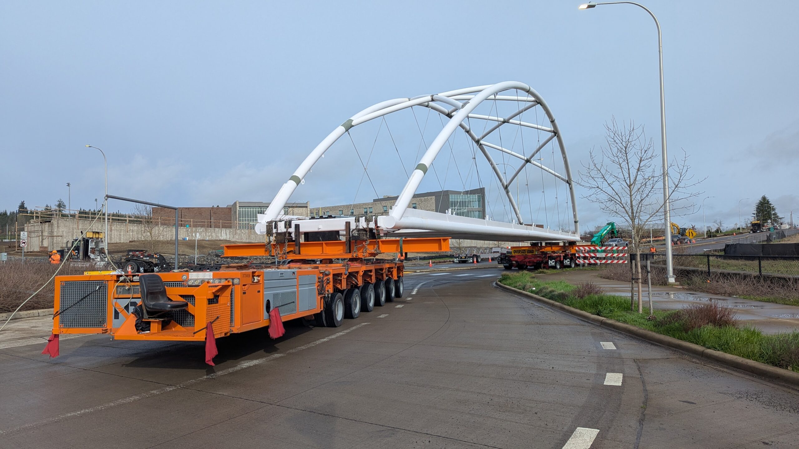 With three bridge spans now on site, the bridge becomes a composition of tied arch shapes as they move toward their final arrangement.The 100-ft-long span 4 arrives on a truck that navigated from Vanouver, WA to Sherwood overnight.The underslung arch spans feature stainless steel compression struts to match the tension rods on the tied arch spans, in a vertical pattern that will follow the railing design.Span 3 turns from the construction staging yard onto Elwert Rd.A single crane will pick each of the remaining bridge spans.A southern view of the full alignment shows span 3 at distant perspective near the final position of span 1 and span 4 in close perspective near its imminent position.Crews begin attaching rigging to four symmetrical points on span 4 for hoisting.Span 3 drives into the roundabout from Elwert Rd. on transportation dollies similar to those used for span 5.Span 3, the second largest at 128ft long and 26 feet tall at the work points, traverses the roundabout.Span 4 lifts off over Elwert Rd. Span 4 swings into place in a remarkably simple maneuver compared to the two-crane operations for span 5.Span 4 is the smallest by a slight margin, at 100 feet long and 13 feet tall at the work points.Span 4 is slowly lowered onto its bearings alongside span 5, with highway traffic uninterrupted.With the first two spans in place, span 3 is staged near its final position over Elwert Rd.The arches of span 4 intersect the temporary placement of span 3 in this view down Elwert Rd.Spans 5 and 3 have the same aspect ratio and arch sizes, offering a play of scale and proportion from different angles.Span 3 prepares to continue the emerging undulating bridge form in this view from the west abutment.With 2/3 the height and length of span 5, span 3 feels slightly more muscular in its proportion of solid steel and void space.Span 3 waits in the roundabout while the crane is relocated.The joints between each span will be articulated with projecting belvedere features to complete the architectural form.The stainless steel struts on span 4 begin to sparkle in the sun for the first time.The crane rigging is stretched across the 128 foot length of span 3.The crane rigging is spread at a wide angle to pick span 3 from its four corners near the bearings.Span 3 lifts off of the transportation dollies along Elwert Rd. Span 3 slowly swings across Elwert Rd.Span 3 starts to touch down on its bearings to reveal the third bay of the undulating bridge form.The raw concrete walls of bent 1 frame a view of the first three bridge spans with the span 3 crane.The crane holds span 3 in place as crews bring to weld it onto the bearings at bent 2 across the stormwater pond.Spans 3 and 4 begin to curve the bridge alignment from the highway toward Sherwood High School.Span 3 joins the bridge in this view from the west abutment, leaving just two spans to complete the grade-separated path.Span 3 brings the bridge past the halfway point in length and features the highest elevation over the roadway at the peak of the bridge vertical profile.As the crane prepares to de-rig, the scale and alignment of the bridge project become much clearer to the public.