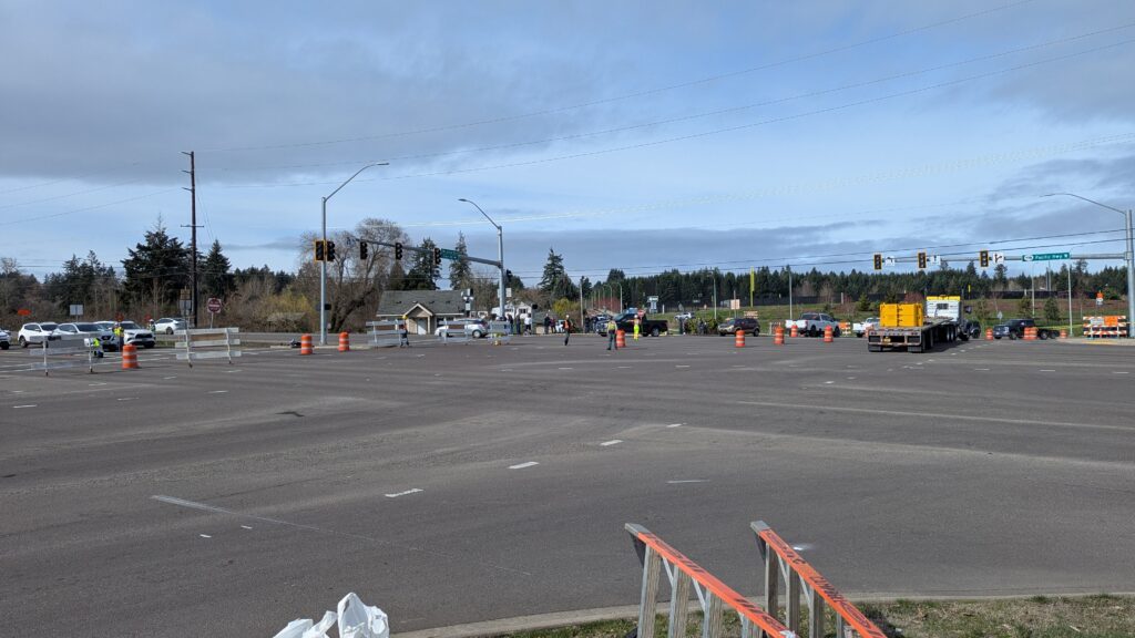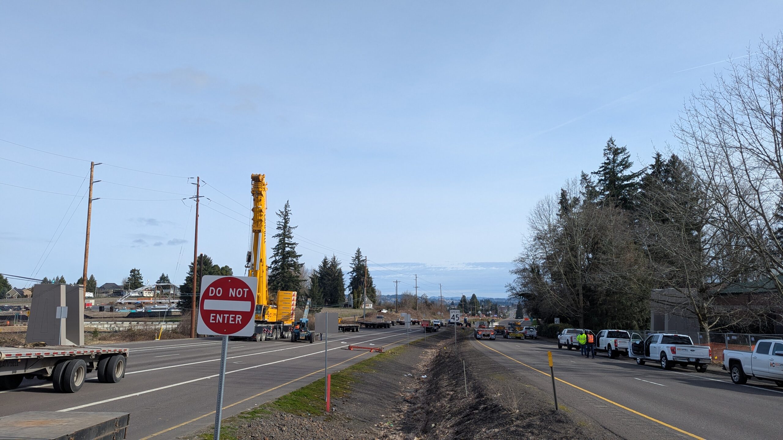 With concurrent assembly work, the next two bridge spans were ready to be installed just two weeks later. This time, Highway 99W remained open while Kruger Rd, Elwert Rd, and the roundabout were closed to traffic.