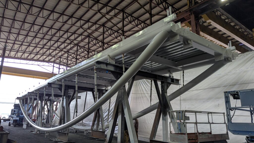 Each of the five bridge spans is simply supported. This means that they are structurally independent and self-supporting. The upright tied arches and inverted arch trusses are all biaxially symmetrical and can be lifted from four symmetrically located points. These trusses were assembled on site and in the Thompson Metal Fab shop in Vancouver, WA prior to erection to minimize road closures and traffic impacts.