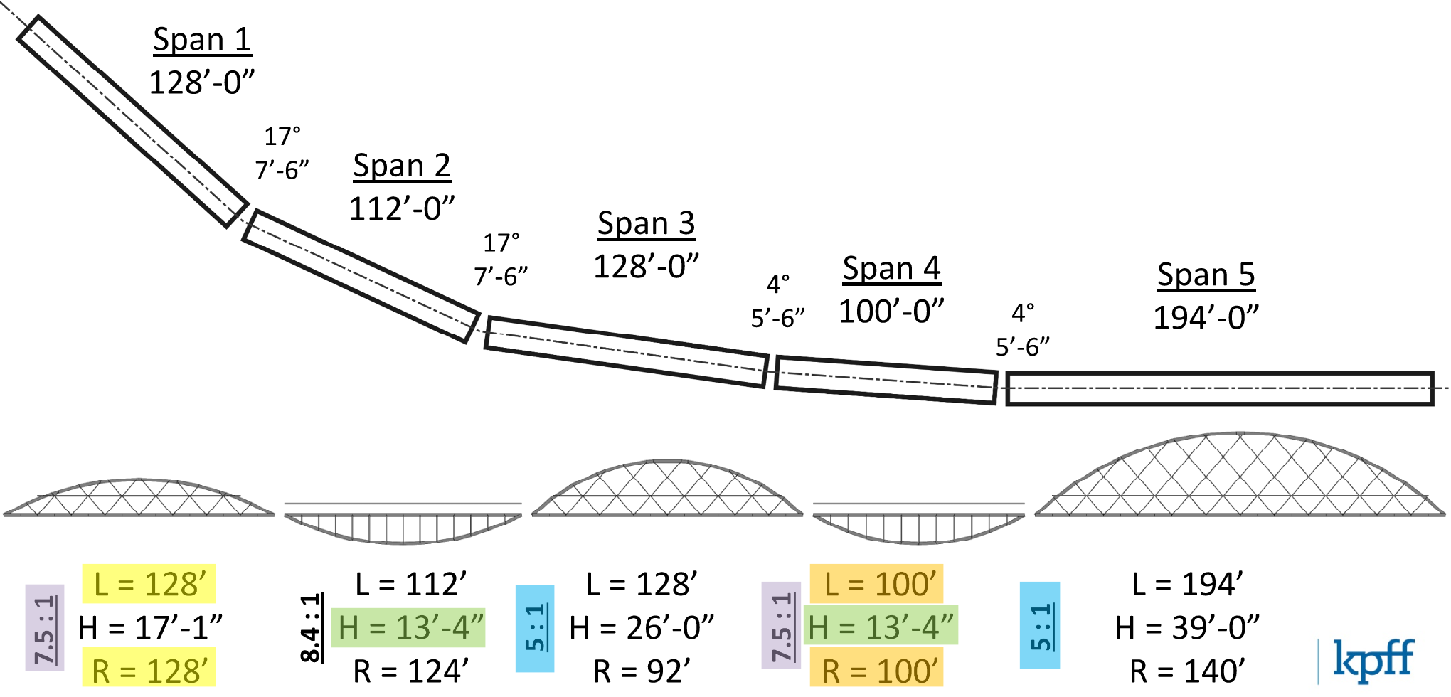 The final two spans join the composition, meandering toward their final arrangement.Like span 4, span 2 was fully assembled at Thompson Metal Fab’s shop and shipped to site overnight.Span 1 begins to move from the site yard toward Elwert Rd. while span 2 is attached to the crane.Span 2 is rigged to the crane while span 1 turns onto Elwert Rd. in the distance.Construction on span 3 has progressed through bridge deck placement, offering a direct overhead view of spans 1 and 2 down Elwert.Span 1 caps span 2 in the distance under span 3. Span 2 is the second-shortest at 112 feet long, and the same height as span 4 at 13 feet tall to the work points.The crane prepares to lift span 2, closing the gap toward the west approach.Span 2 lifts off of its transport trailer in the roundabout.Span 2 spins over Elwert Rd. along span 3.Span 2 hovers over its home across the stormwater pond.The crane sets span 2 into place to complete the fourth section of the undulating bridge form.View across spans 3 and 2 from the bent 3 lantern.View across span 4 to spans 3 and 2.The bridge composition is nearly complete, with span 1 awaiting erection on the north side of the roundabout.Maturing landscaping in the stormwater pond offers a serene foreground for span 2. The underslung arches of span 2 float above landscaping in the stormwater pond. These arches are in tension and do not require the cross bracing found on the above-deck arches. The crane releases span 2 and prepares to relocate for the final pick of span 1, which will complete the connection to this vantage point.Bridge composition with span 1 foreground of its final position.Span 1 is the same length as span 3, at 128 feet, but has the same span-to-depth ratio as span 4 at 7.5:1 to shape the overall bridge form, resulting in a thicker proportion of structure to void.Span 1 makes its way down Elwert Rd. on transporters to join the rest of the bridge.Span 1 awaits erection in the roundabout.The crane prepares to pick span 1, viewed from the span 4 bridge deck.Span 1 lifts off from the transport dollies in the roundabout.Span 1 swing across the west approach walls viewed from the span 3 deck.Span 1 swings over the end of Kruger Rd.Span 1 spins into place above Kruger Rd.The crane prepares to set span 1 down into its final position.A first look across the completed bridge superstructure from span 5 over Highway 99W.Span 1 joins the composition with its conspicuous turn north toward Sherwood High School.The crane and span 1, with the other spans turning away in the background.All five bridge spans and the crane from the west approach ramps.The five bridge spans looking south from Elwert Rd.The five bridge spans, with the crane holding span 1, from the construction staging yard.The crane releases span 1 from the rigging.A first look across the future span 1 deck from the west abutment.The crane is dismantled, leaving the prominent horizontal bridge form.The completed bridge superstructure from Kruger Rd.The Sherwood High School baseball field’s berm offers broad views of the bridge galloping through the trees.Summary of the span lengths, heights, and aspect ratios of the bridge spans.