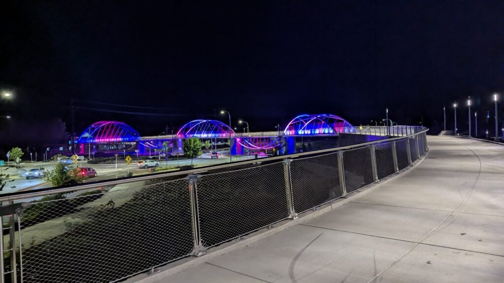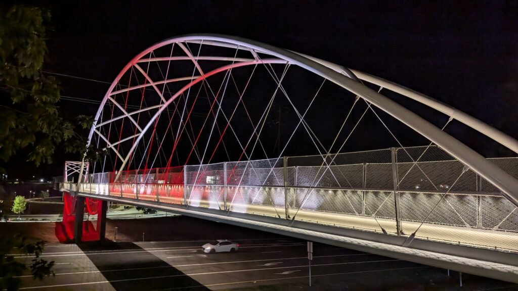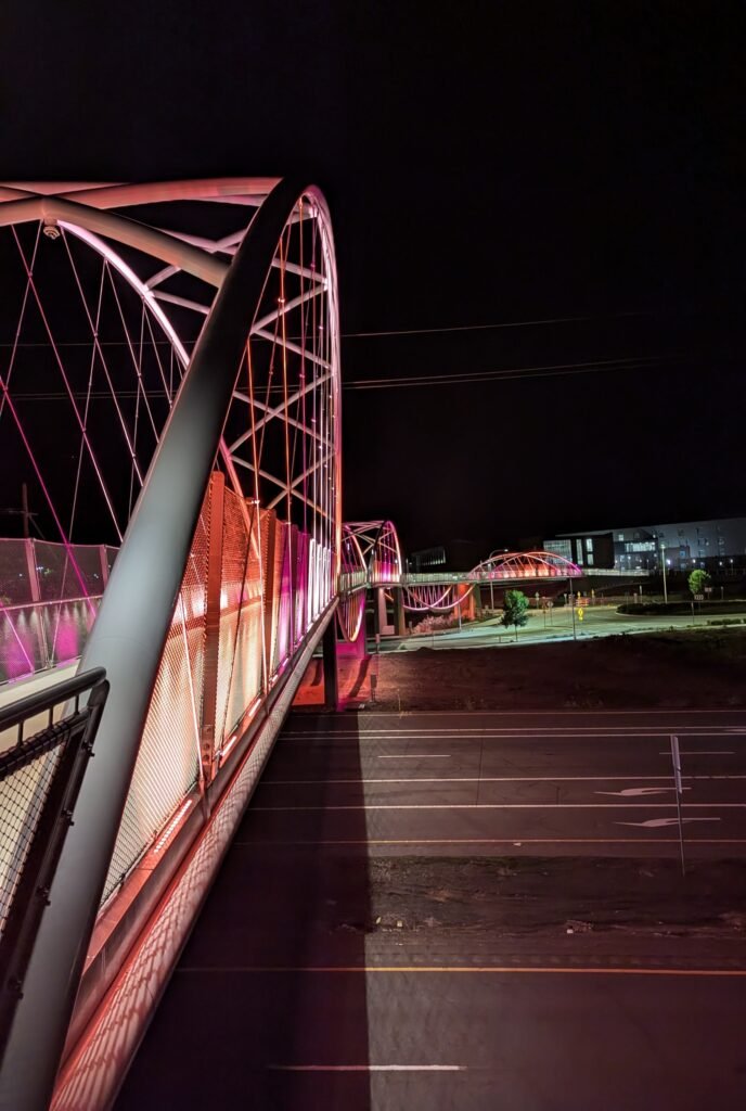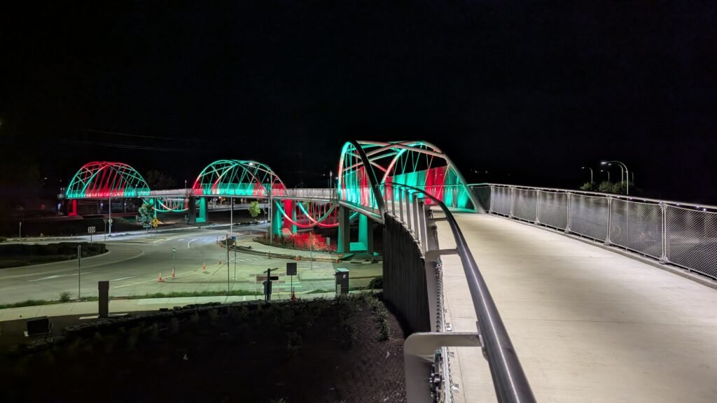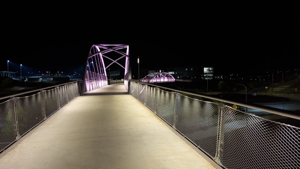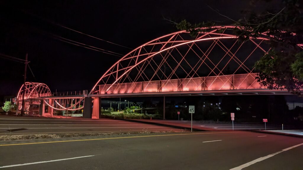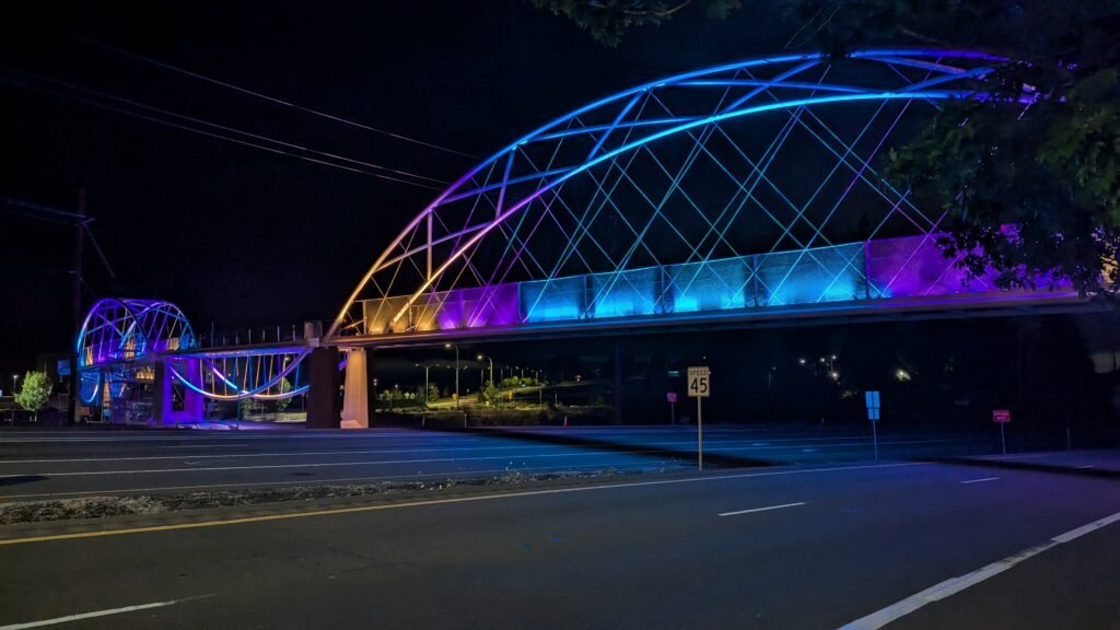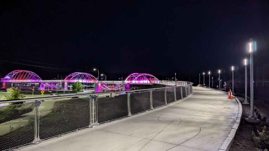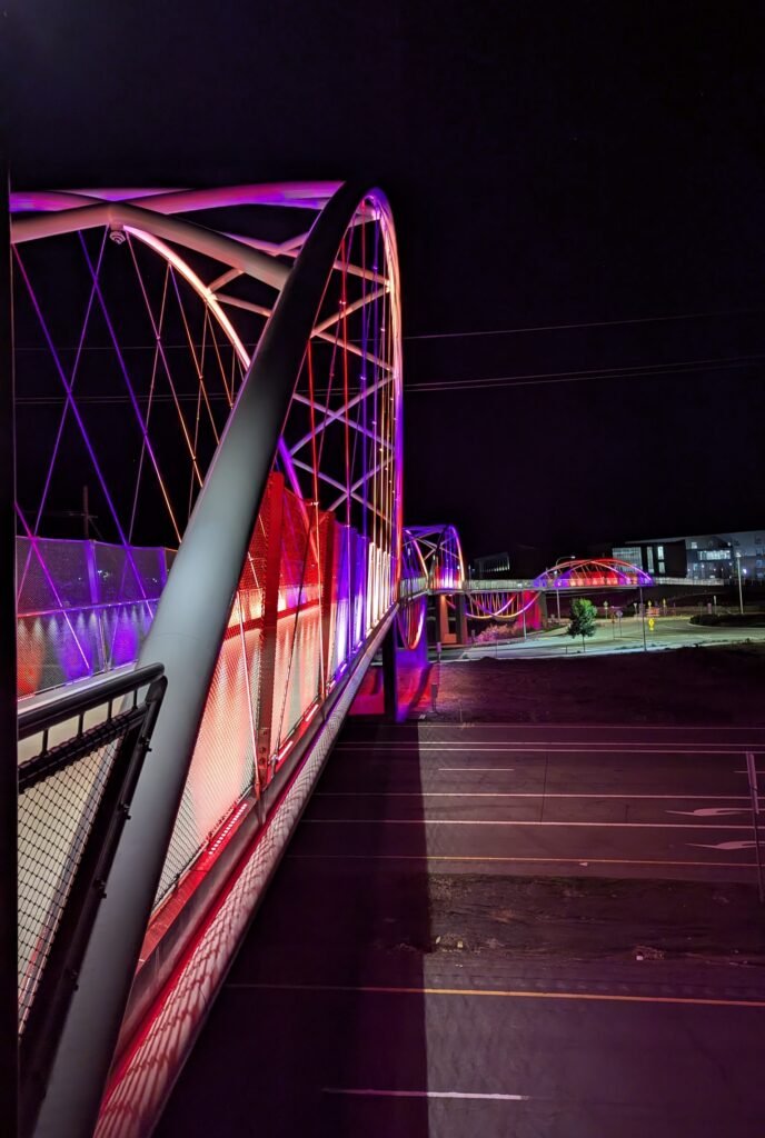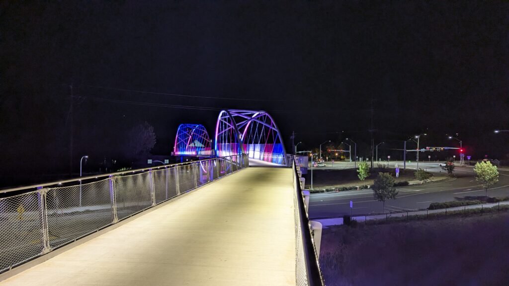 As Sherwood’s new bicycle and pedestrian bridge opened this fall, the city gained not only a major link in the multimodal transportation network but also an iconic landmark. After dark, the sculptural structure comes to life with color changing architectural lights. The lighting system includes 214 fixtures enabling immense possibilities for future programming. Initially, the bridge will feature twenty scenes on a calendar schedule to debut throughout 2025 and 2026. This post captures the bridge in a range of colors and patterns from several viewpoints, taken during the multi-night testing and programming process in August and September 2025.