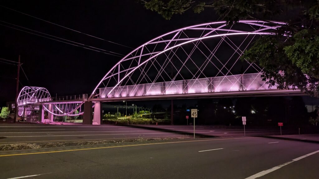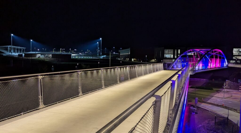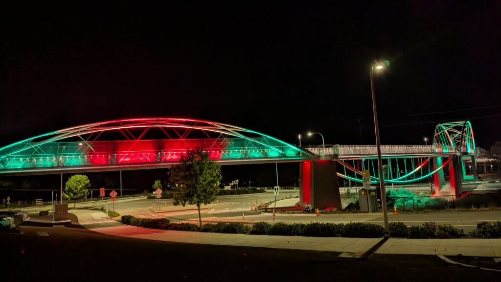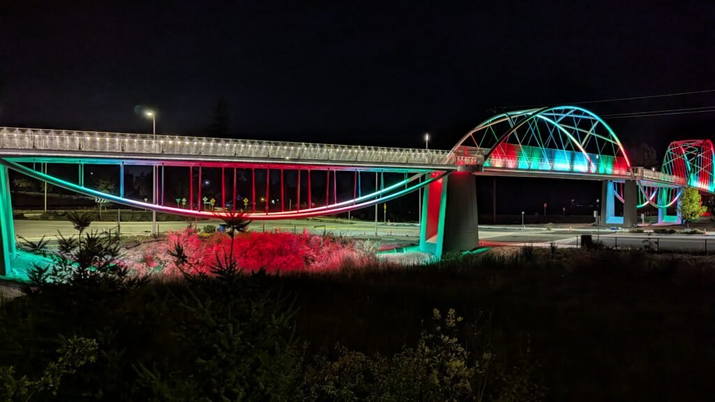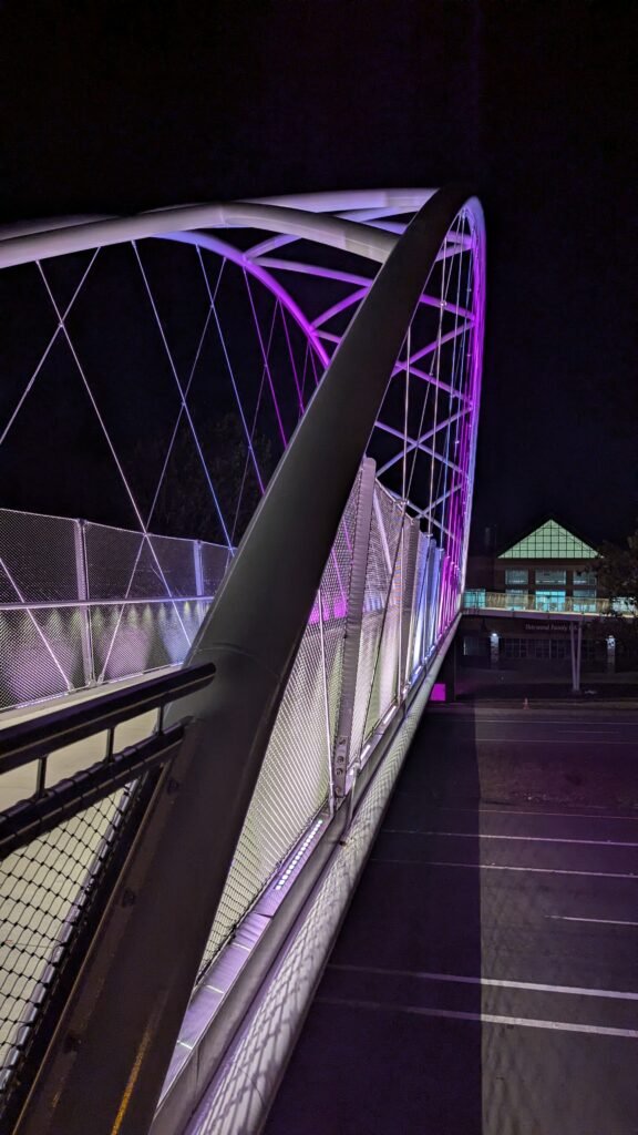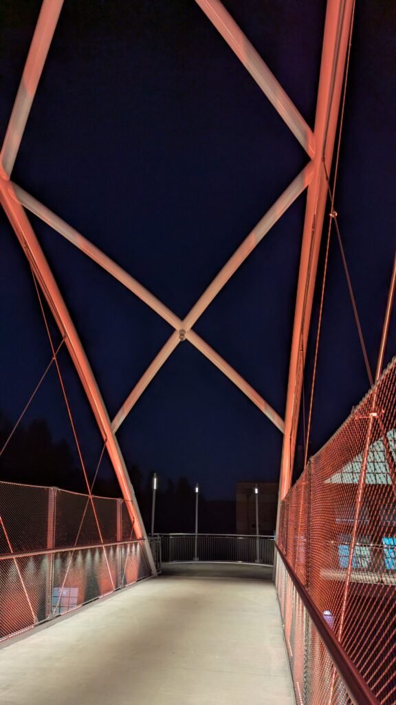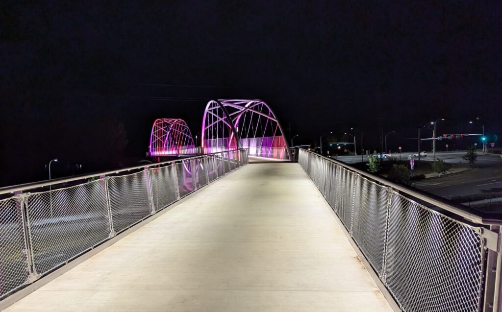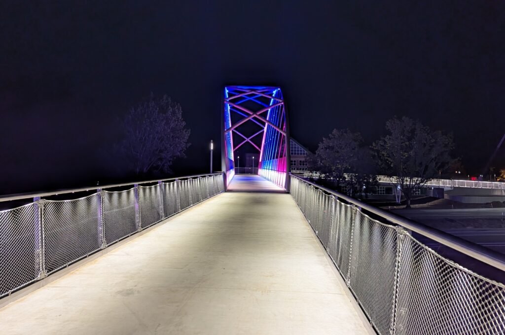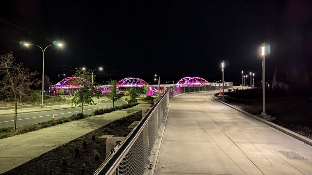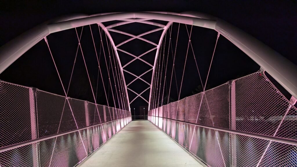 As Sherwood’s new bicycle and pedestrian bridge opened this fall, the city gained not only a major link in the multimodal transportation network but also an iconic landmark. After dark, the sculptural structure comes to life with color changing architectural lights. The lighting system includes 214 fixtures enabling immense possibilities for future programming. Initially, the bridge will feature twenty scenes on a calendar schedule to debut throughout 2025 and 2026. This post captures the bridge in a range of colors and patterns from several viewpoints, taken during the multi-night testing and programming process in August and September 2025.