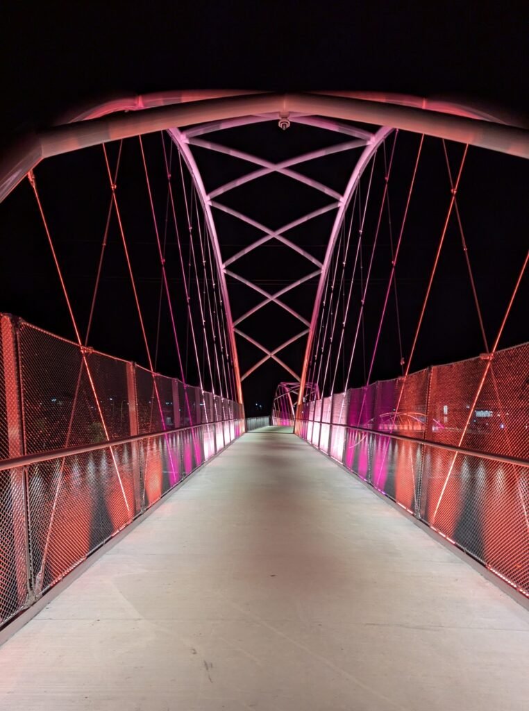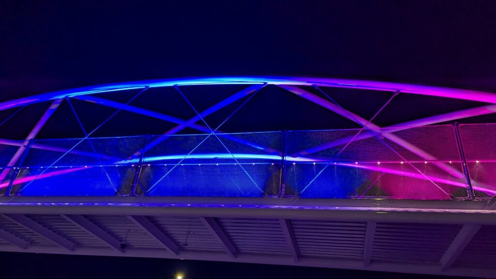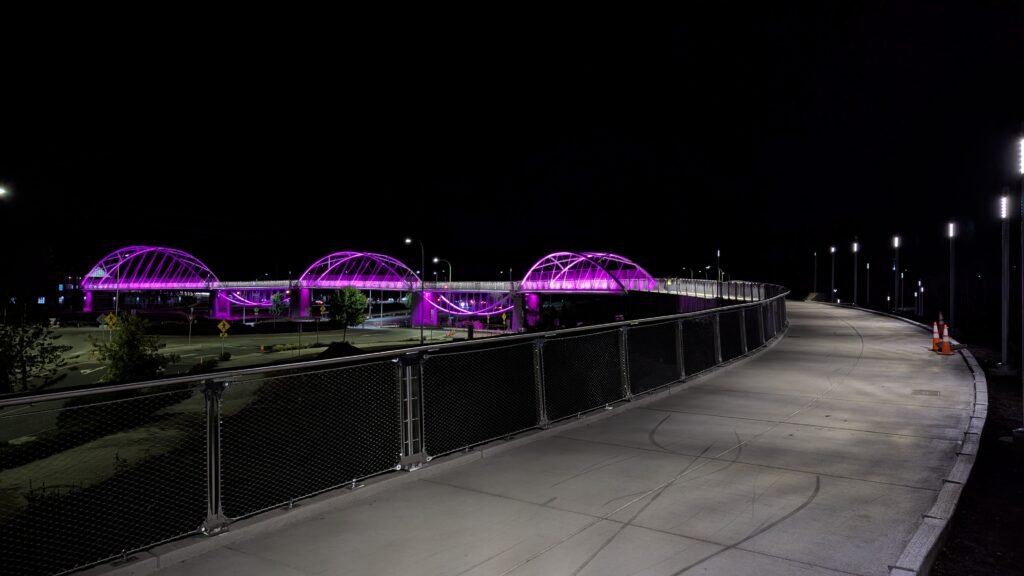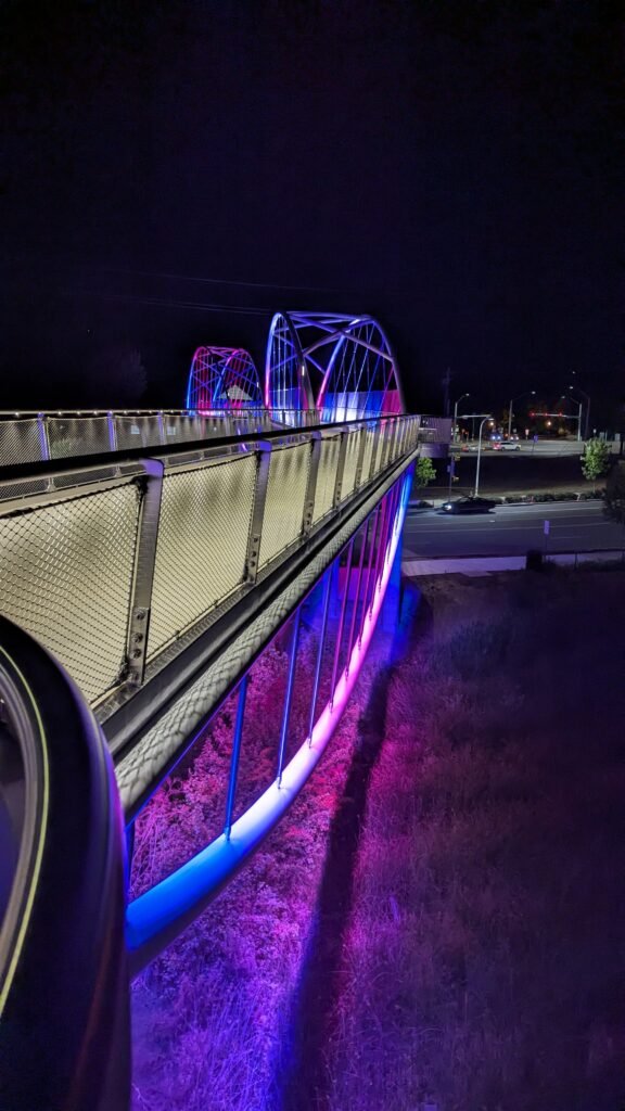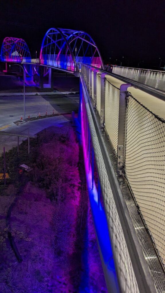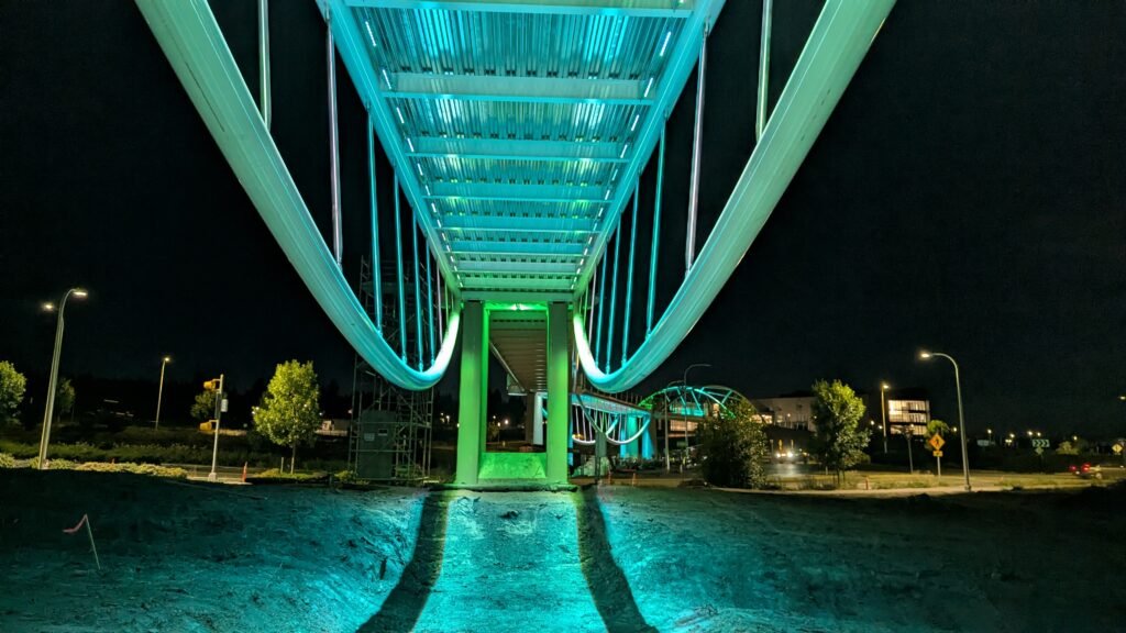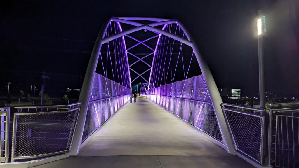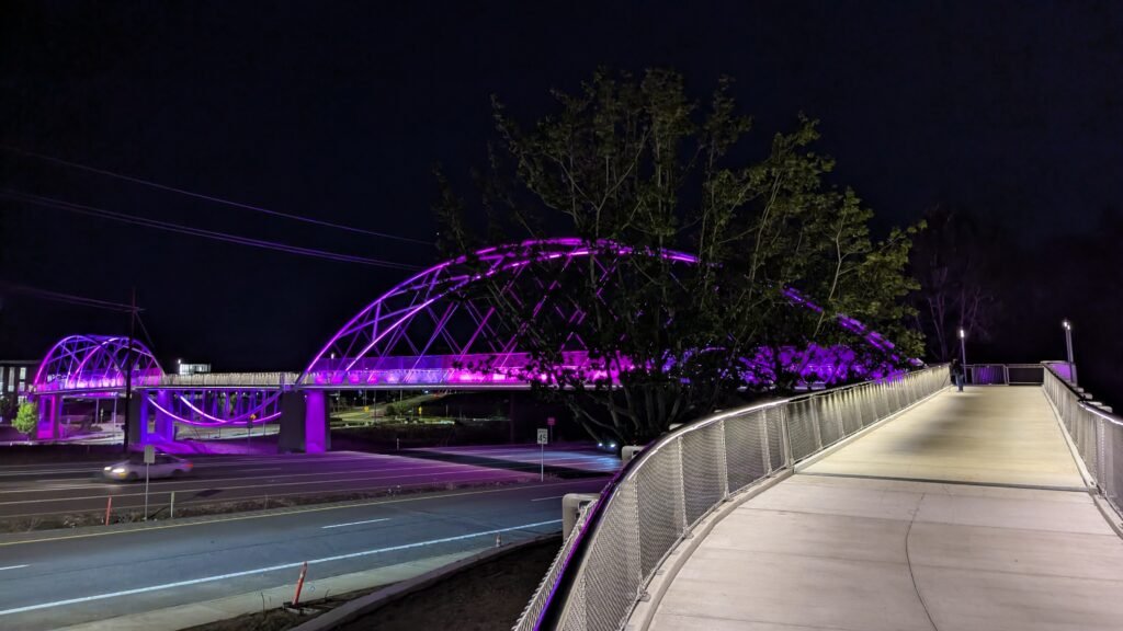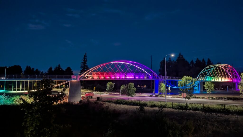 As Sherwood’s new bicycle and pedestrian bridge opened this fall, the city gained not only a major link in the multimodal transportation network but also an iconic landmark. After dark, the sculptural structure comes to life with color changing architectural lights. The lighting system includes 214 fixtures enabling immense possibilities for future programming. Initially, the bridge will feature twenty scenes on a calendar schedule to debut throughout 2025 and 2026. This post captures the bridge in a range of colors and patterns from several viewpoints, taken during the multi-night testing and programming process in August and September 2025.
