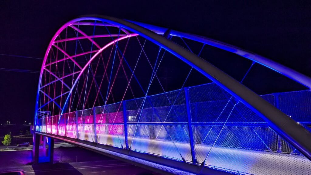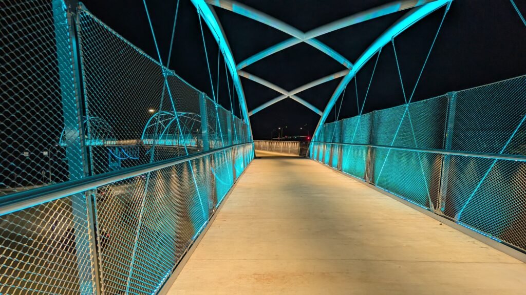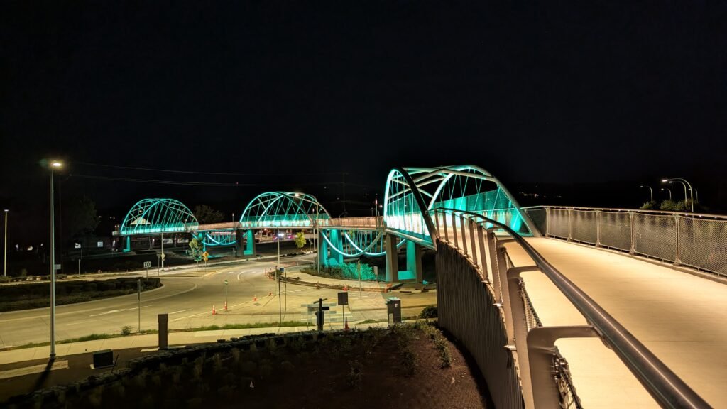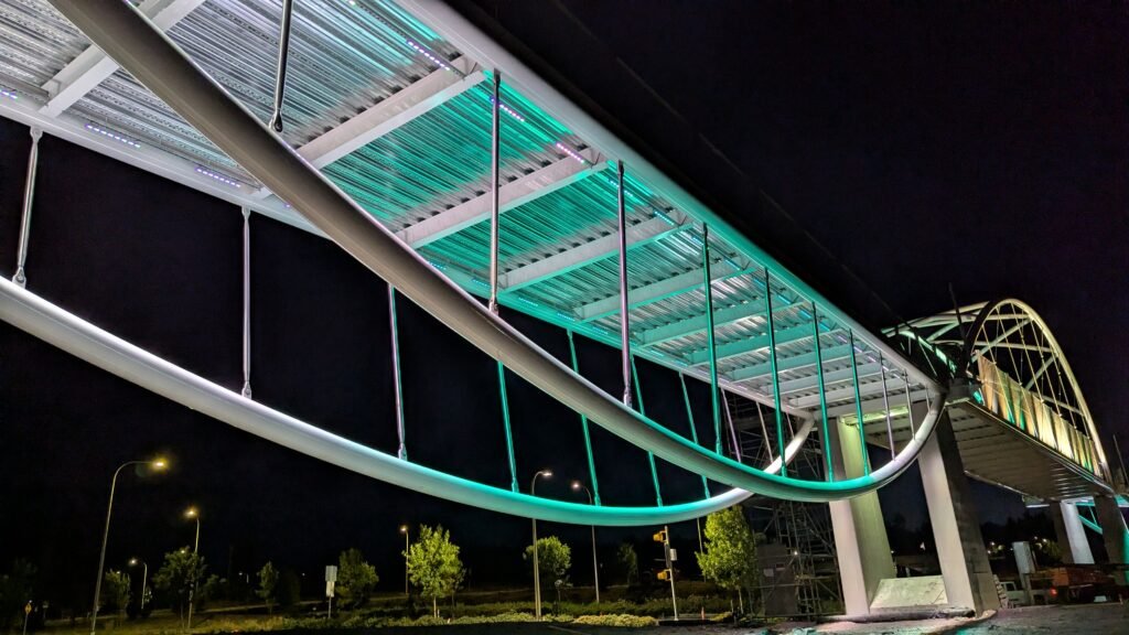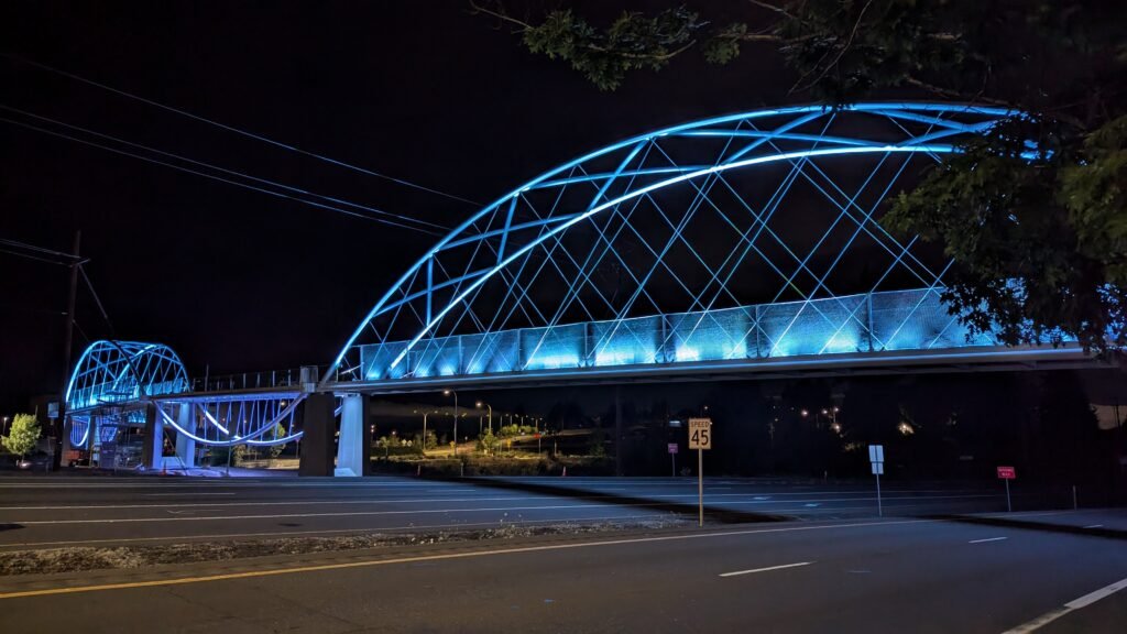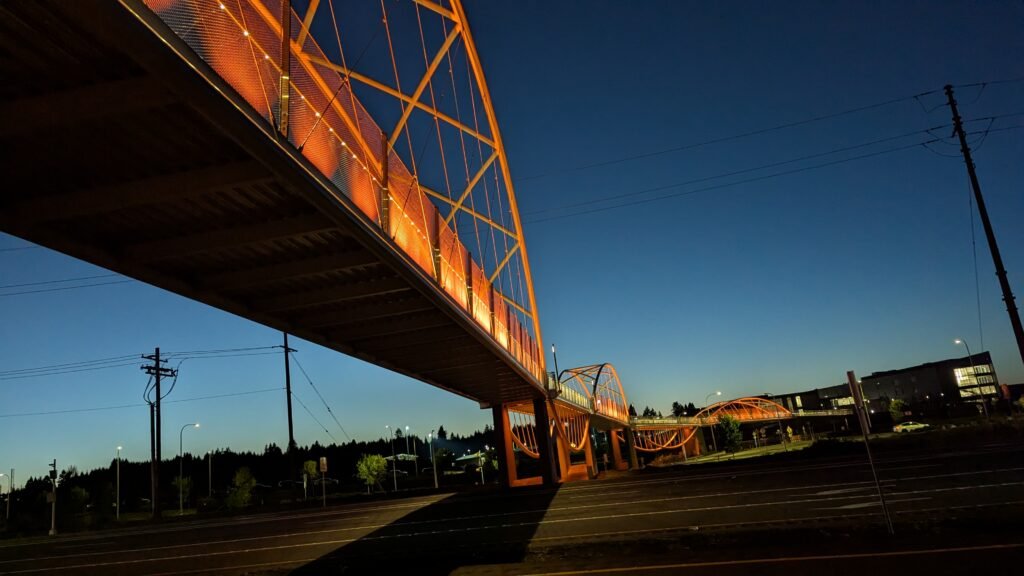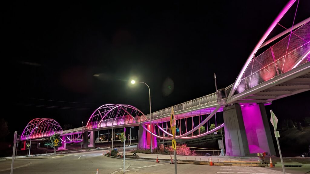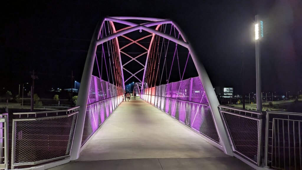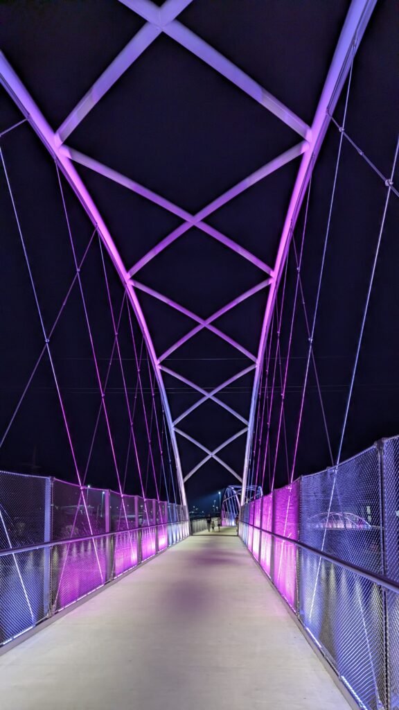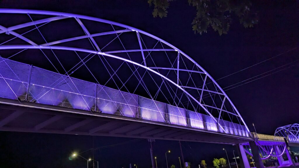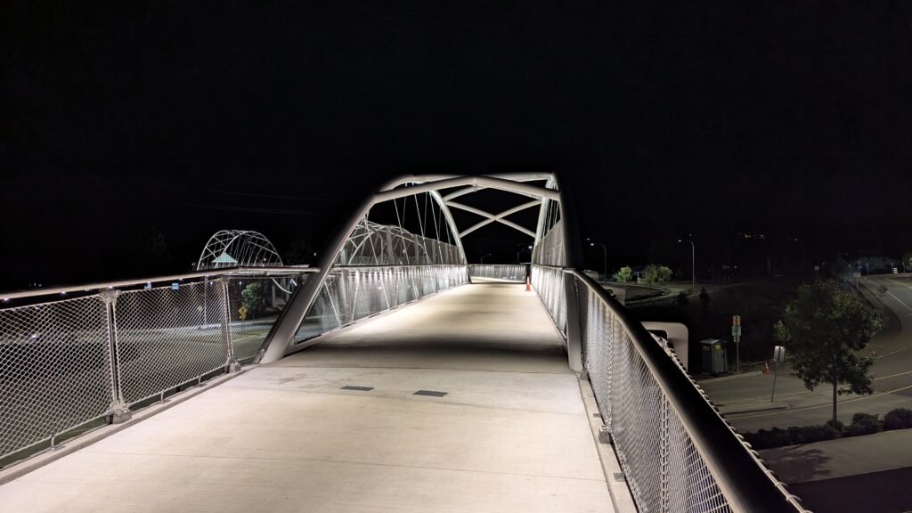 As Sherwood’s new bicycle and pedestrian bridge opened this fall, the city gained not only a major link in the multimodal transportation network but also an iconic landmark. After dark, the sculptural structure comes to life with color changing architectural lights. The lighting system includes 214 fixtures enabling immense possibilities for future programming. Initially, the bridge will feature twenty scenes on a calendar schedule to debut throughout 2025 and 2026. This post captures the bridge in a range of colors and patterns from several viewpoints, taken during the multi-night testing and programming process in August and September 2025.