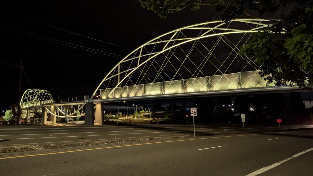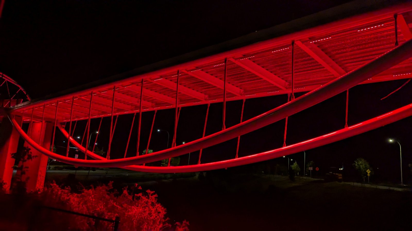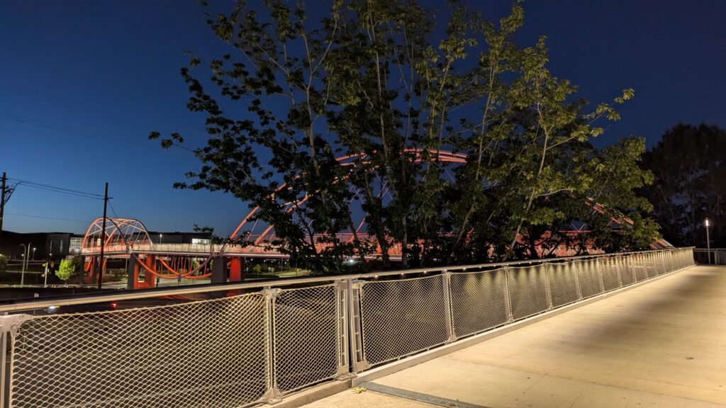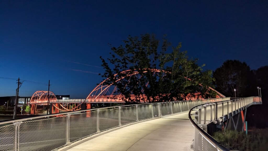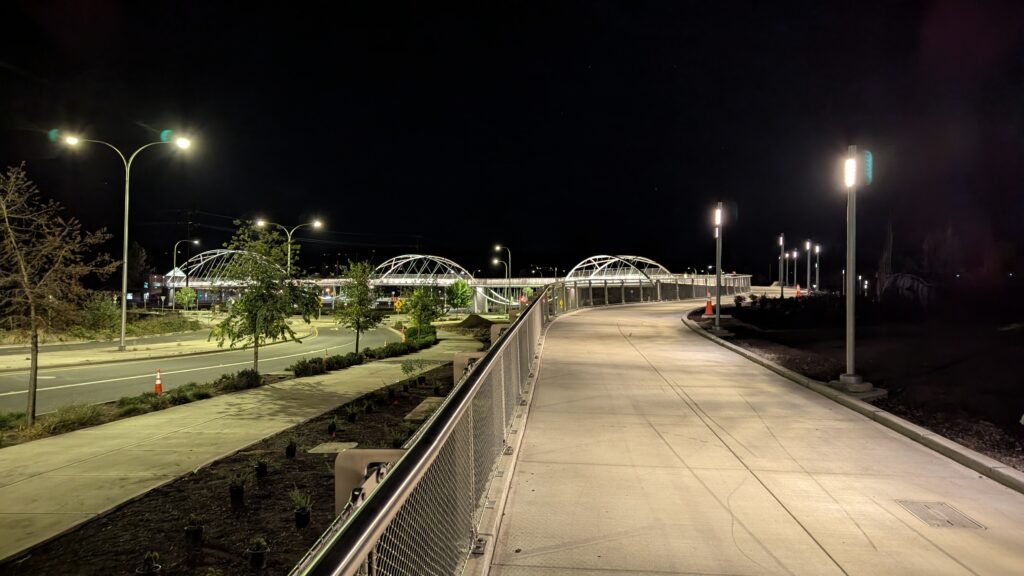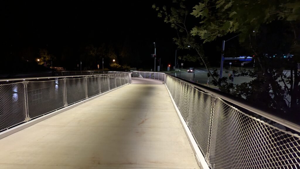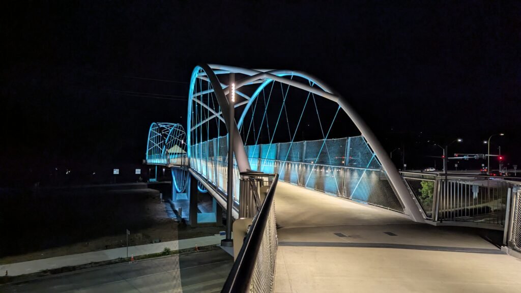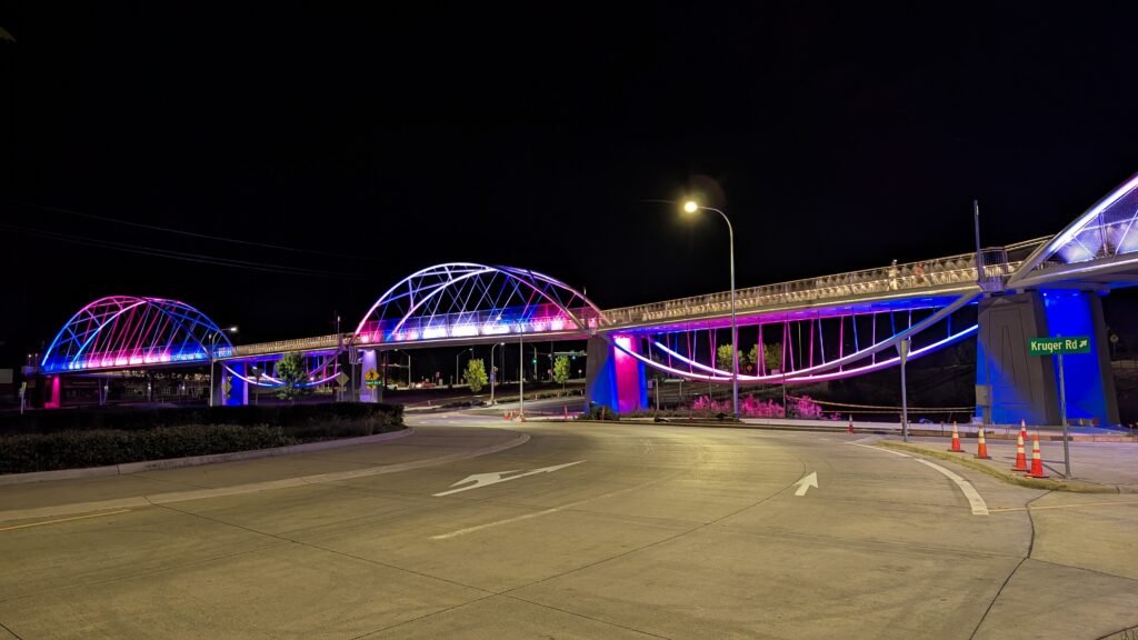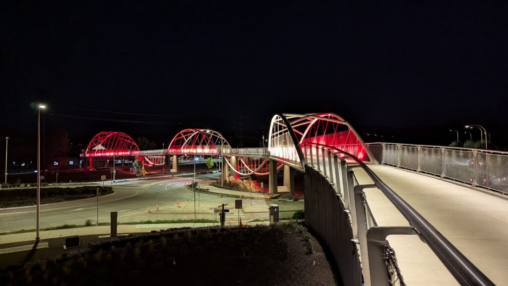 As Sherwood’s new bicycle and pedestrian bridge opened this fall, the city gained not only a major link in the multimodal transportation network but also an iconic landmark. After dark, the sculptural structure comes to life with color changing architectural lights. The lighting system includes 214 fixtures enabling immense possibilities for future programming. Initially, the bridge will feature twenty scenes on a calendar schedule to debut throughout 2025 and 2026. This post captures the bridge in a range of colors and patterns from several viewpoints, taken during the multi-night testing and programming process in August and September 2025.