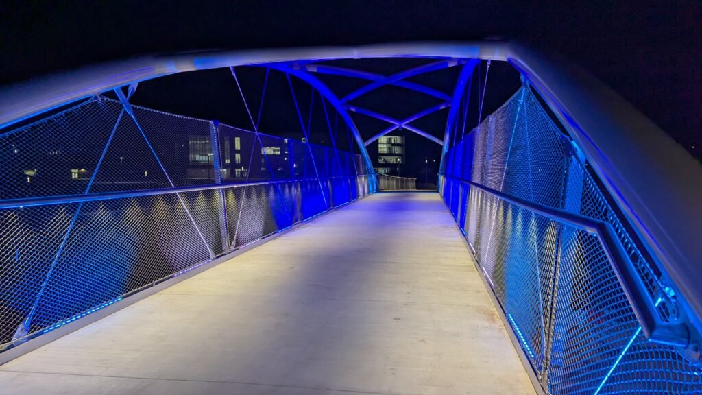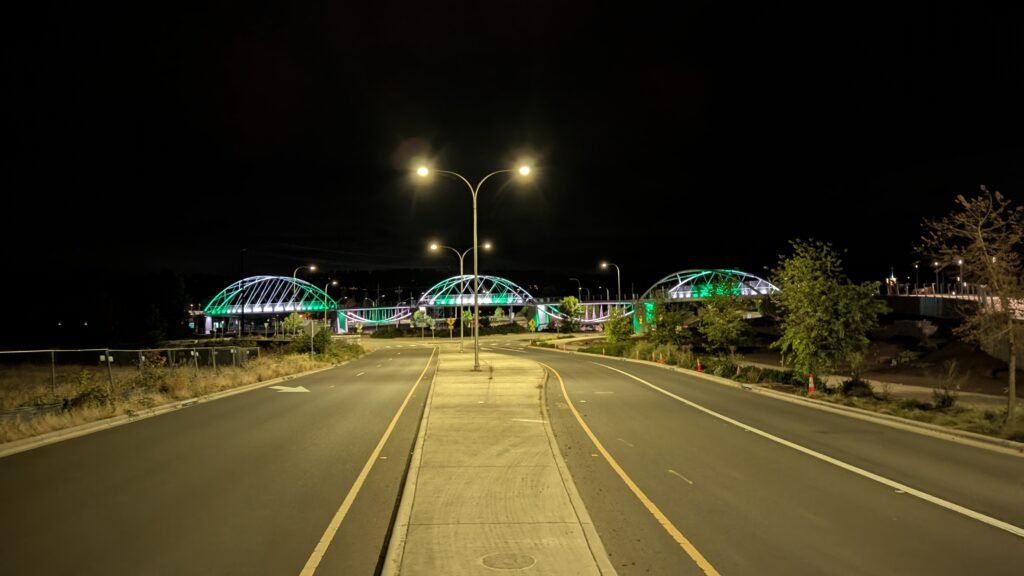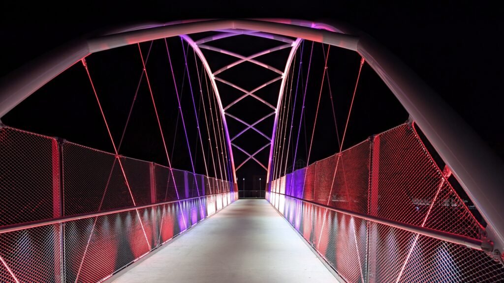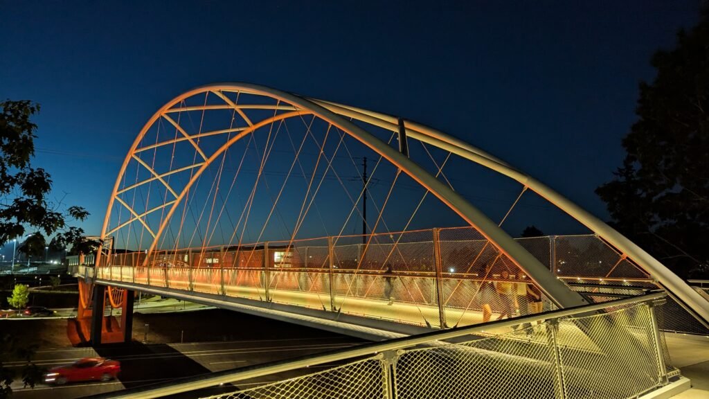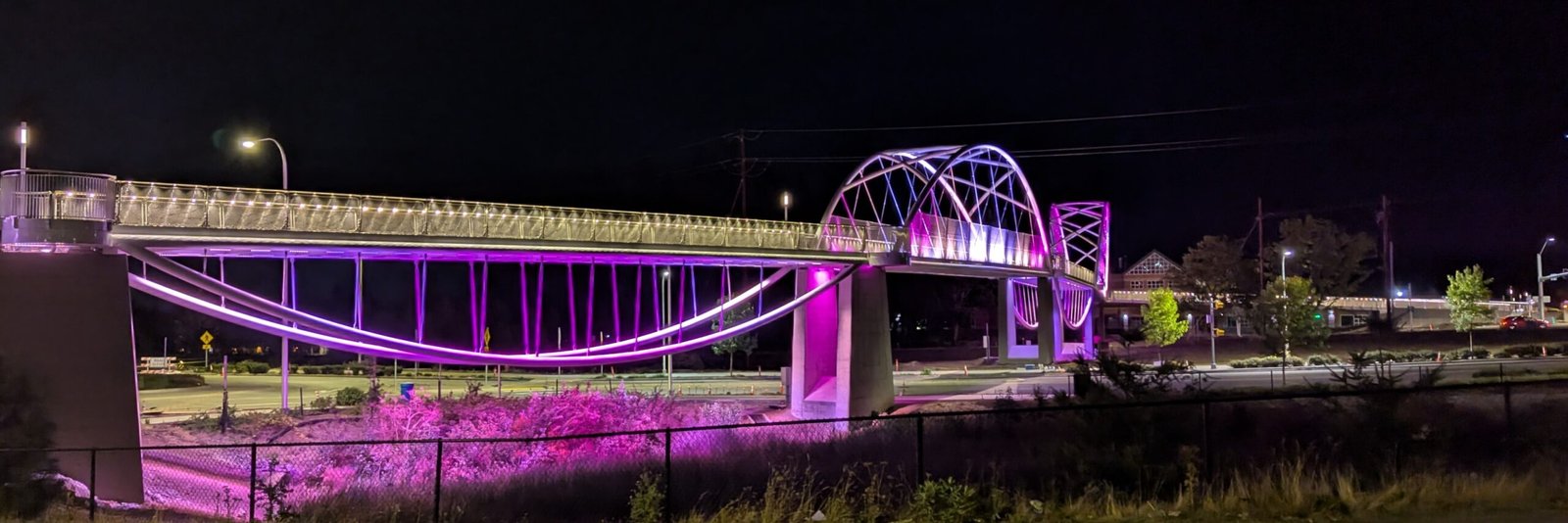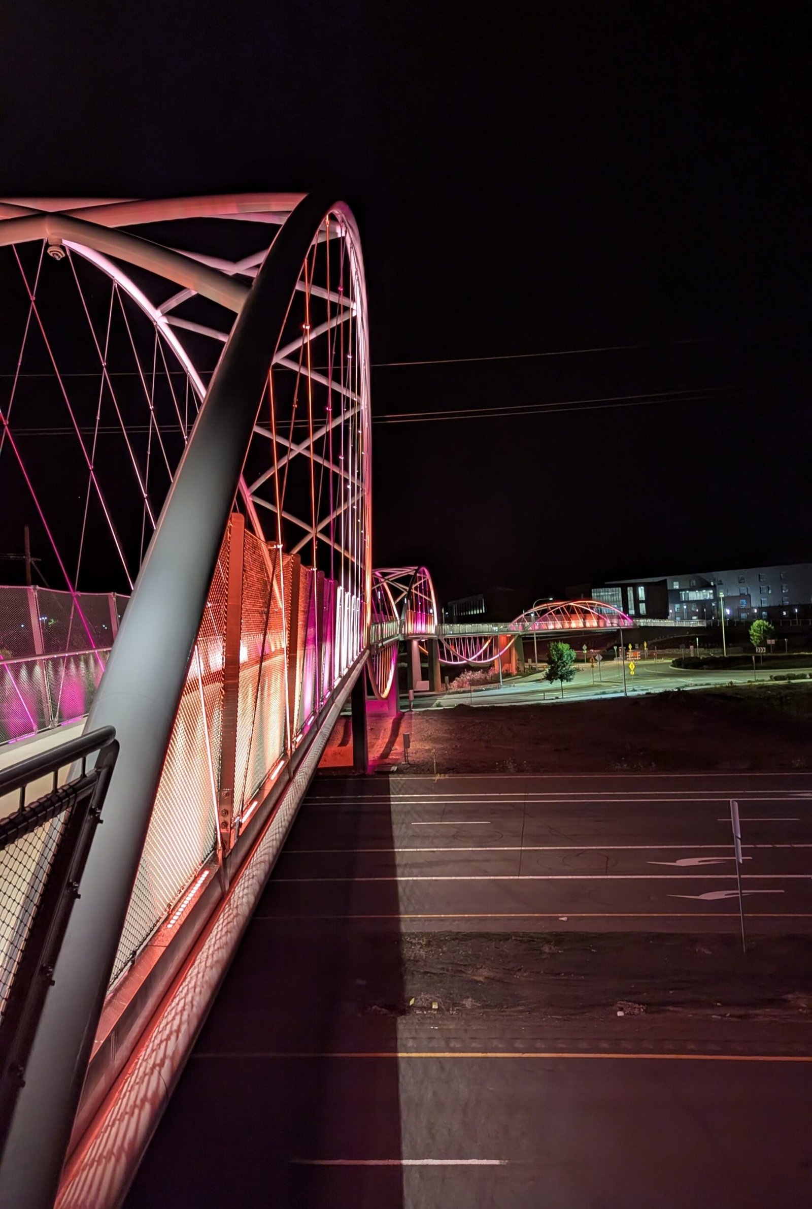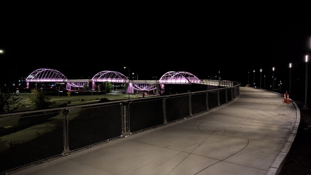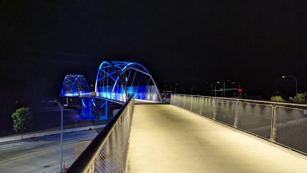 As Sherwood’s new bicycle and pedestrian bridge opened this fall, the city gained not only a major link in the multimodal transportation network but also an iconic landmark. After dark, the sculptural structure comes to life with color changing architectural lights. The lighting system includes 214 fixtures enabling immense possibilities for future programming. Initially, the bridge will feature twenty scenes on a calendar schedule to debut throughout 2025 and 2026. This post captures the bridge in a range of colors and patterns from several viewpoints, taken during the multi-night testing and programming process in August and September 2025.