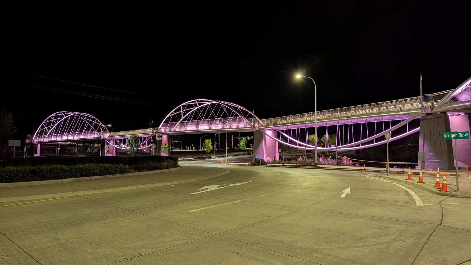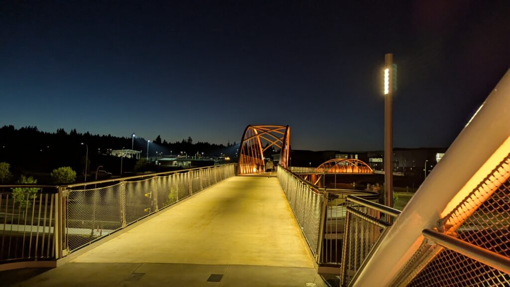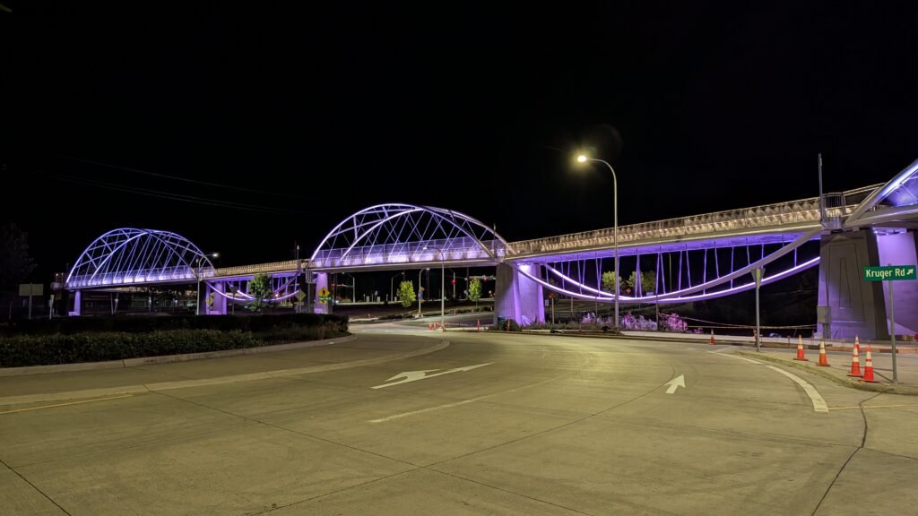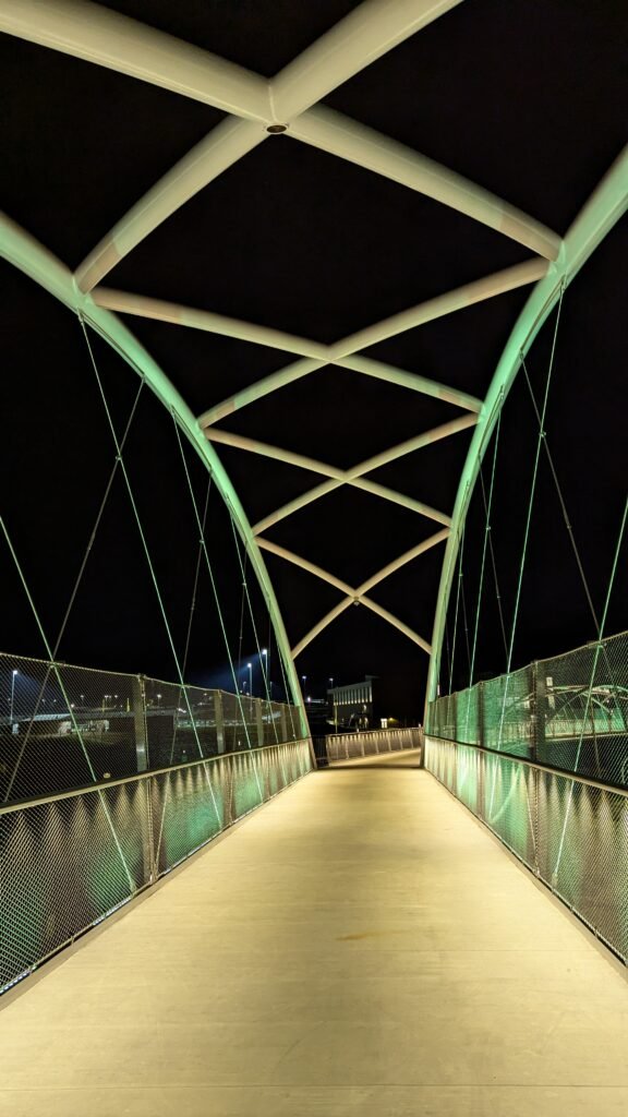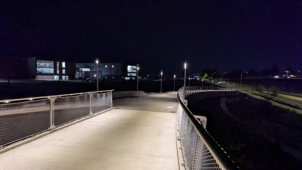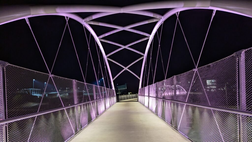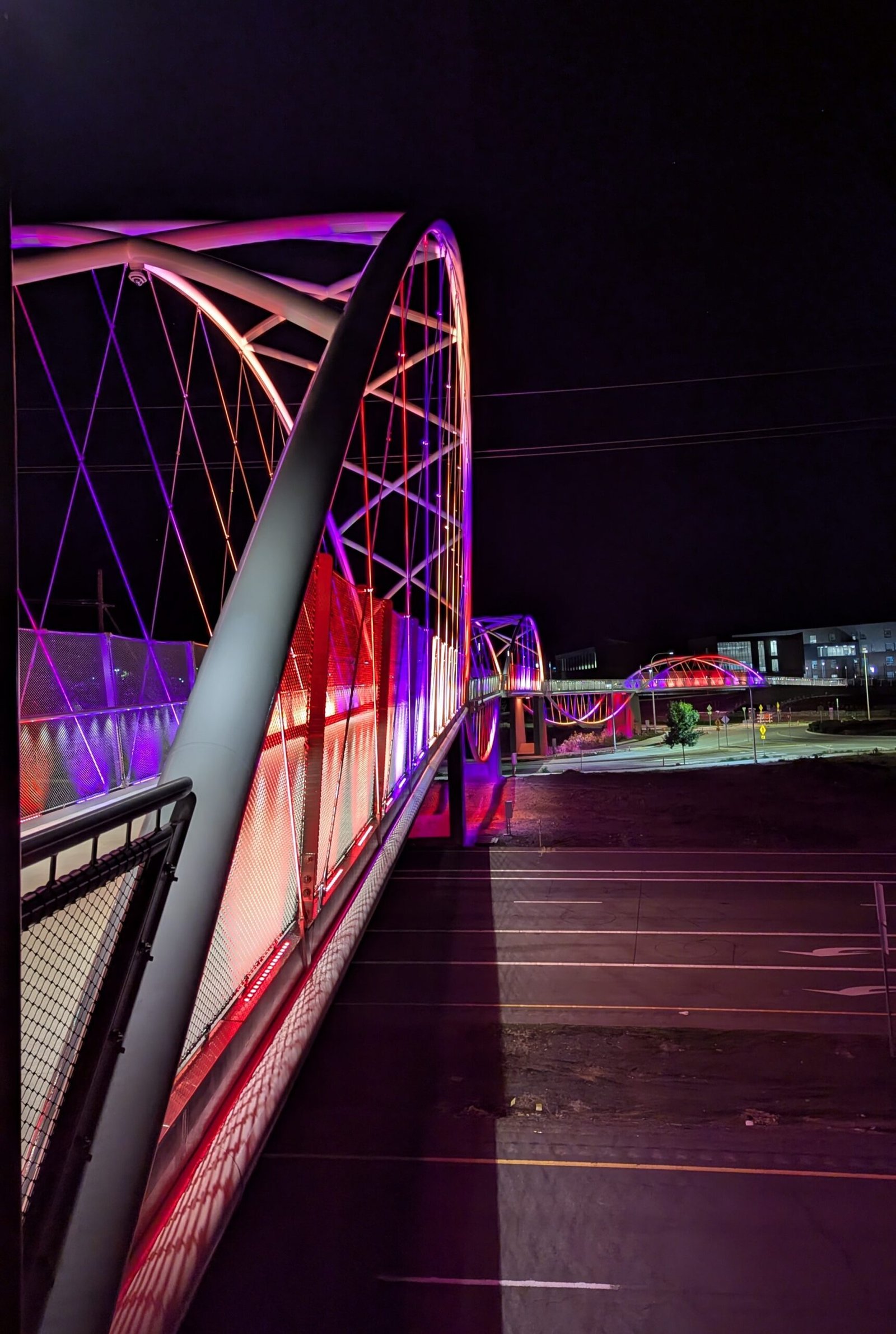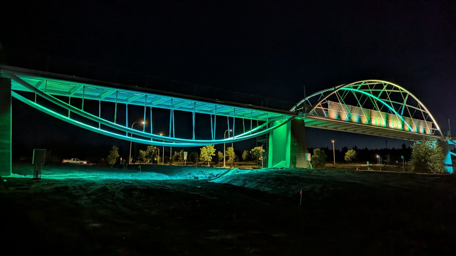 As Sherwood’s new bicycle and pedestrian bridge opened this fall, the city gained not only a major link in the multimodal transportation network but also an iconic landmark. After dark, the sculptural structure comes to life with color changing architectural lights. The lighting system includes 214 fixtures enabling immense possibilities for future programming. Initially, the bridge will feature twenty scenes on a calendar schedule to debut throughout 2025 and 2026. This post captures the bridge in a range of colors and patterns from several viewpoints, taken during the multi-night testing and programming process in August and September 2025.