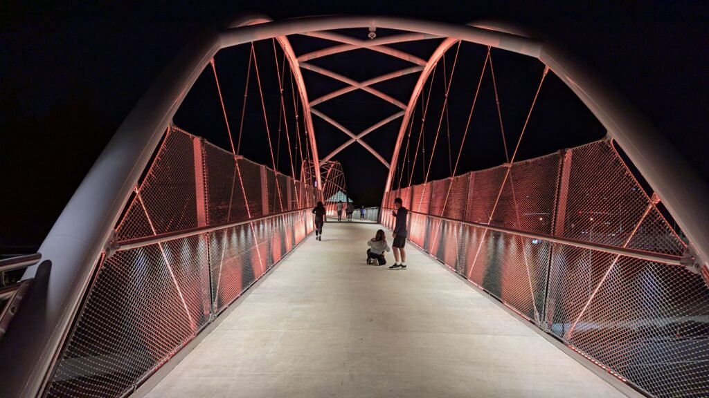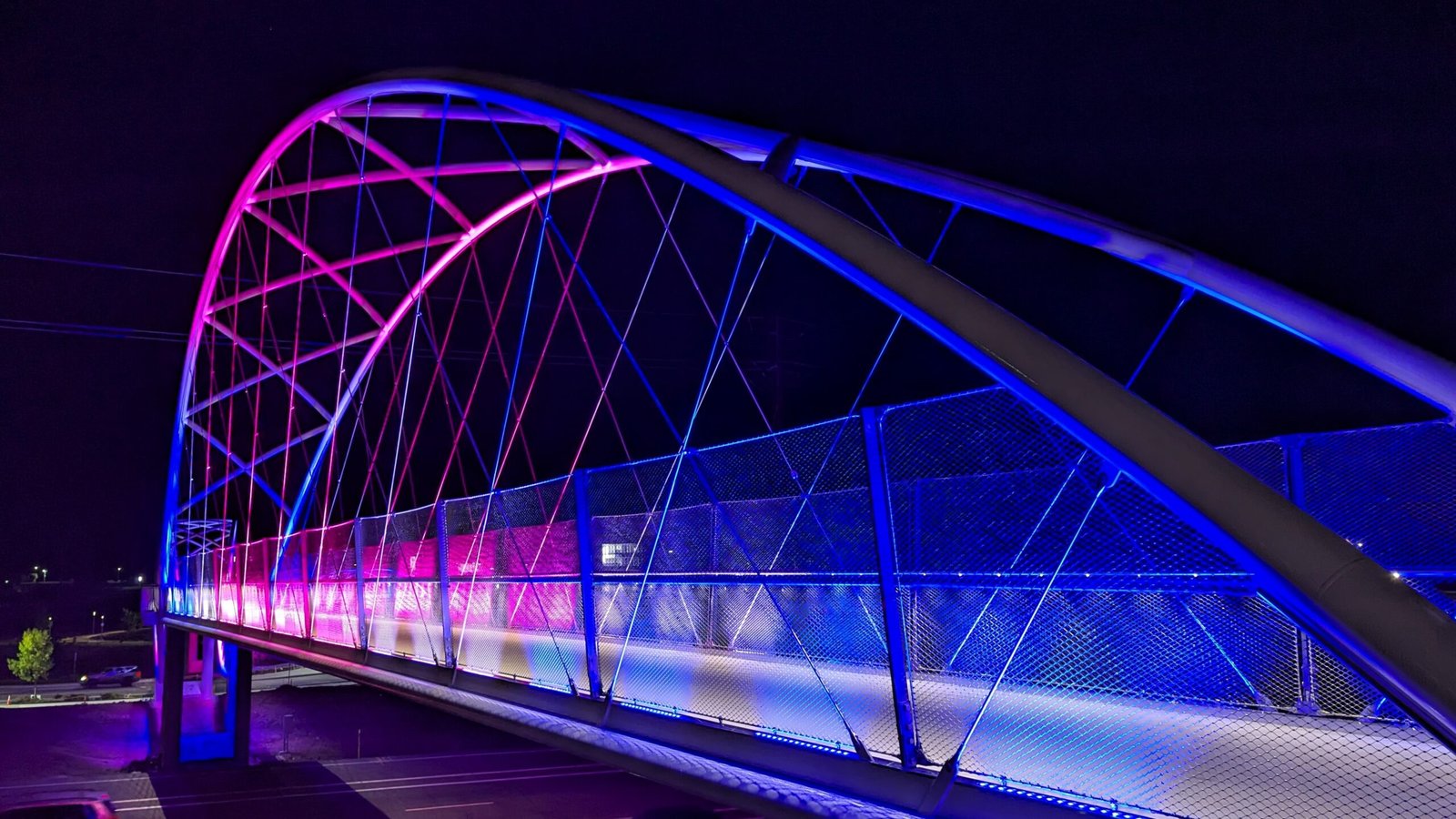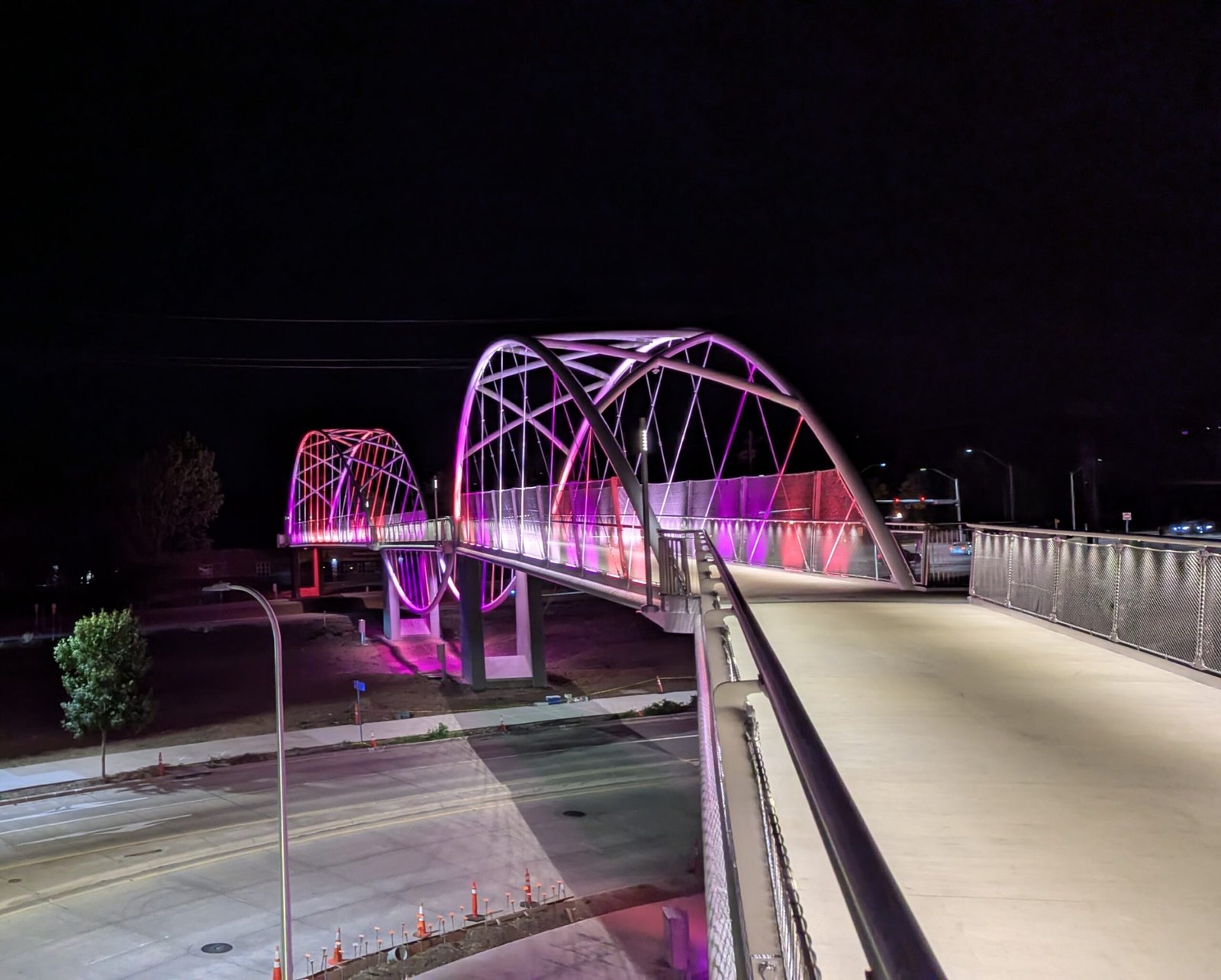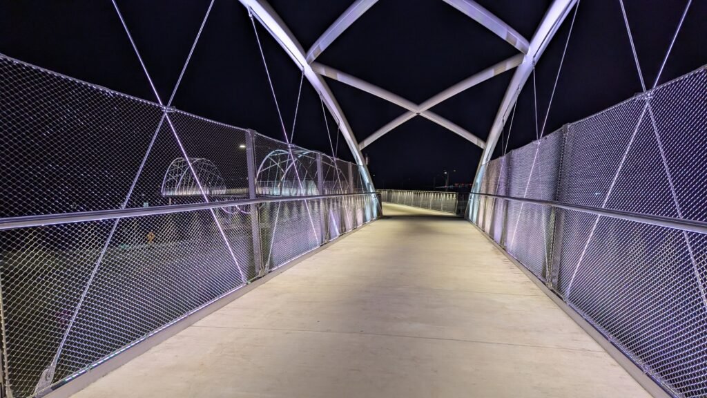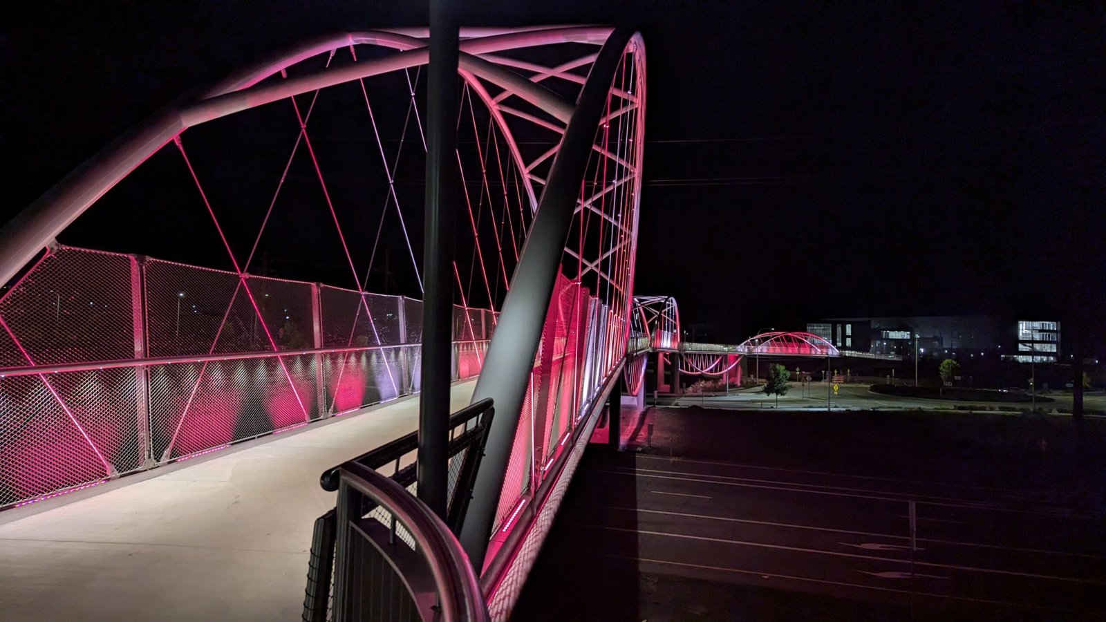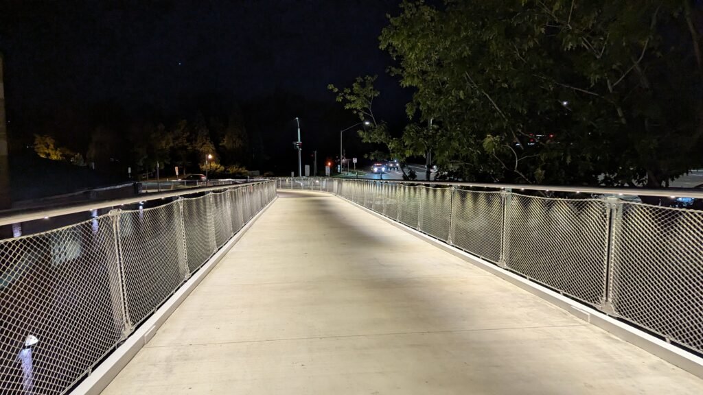 As Sherwood’s new bicycle and pedestrian bridge opened this fall, the city gained not only a major link in the multimodal transportation network but also an iconic landmark. After dark, the sculptural structure comes to life with color changing architectural lights. The lighting system includes 214 fixtures enabling immense possibilities for future programming. Initially, the bridge will feature twenty scenes on a calendar schedule to debut throughout 2025 and 2026. This post captures the bridge in a range of colors and patterns from several viewpoints, taken during the multi-night testing and programming process in August and September 2025.