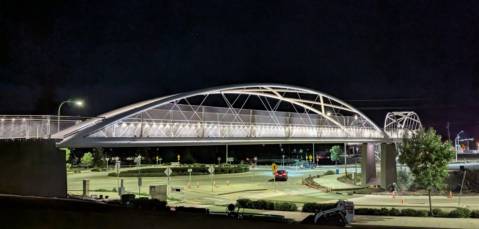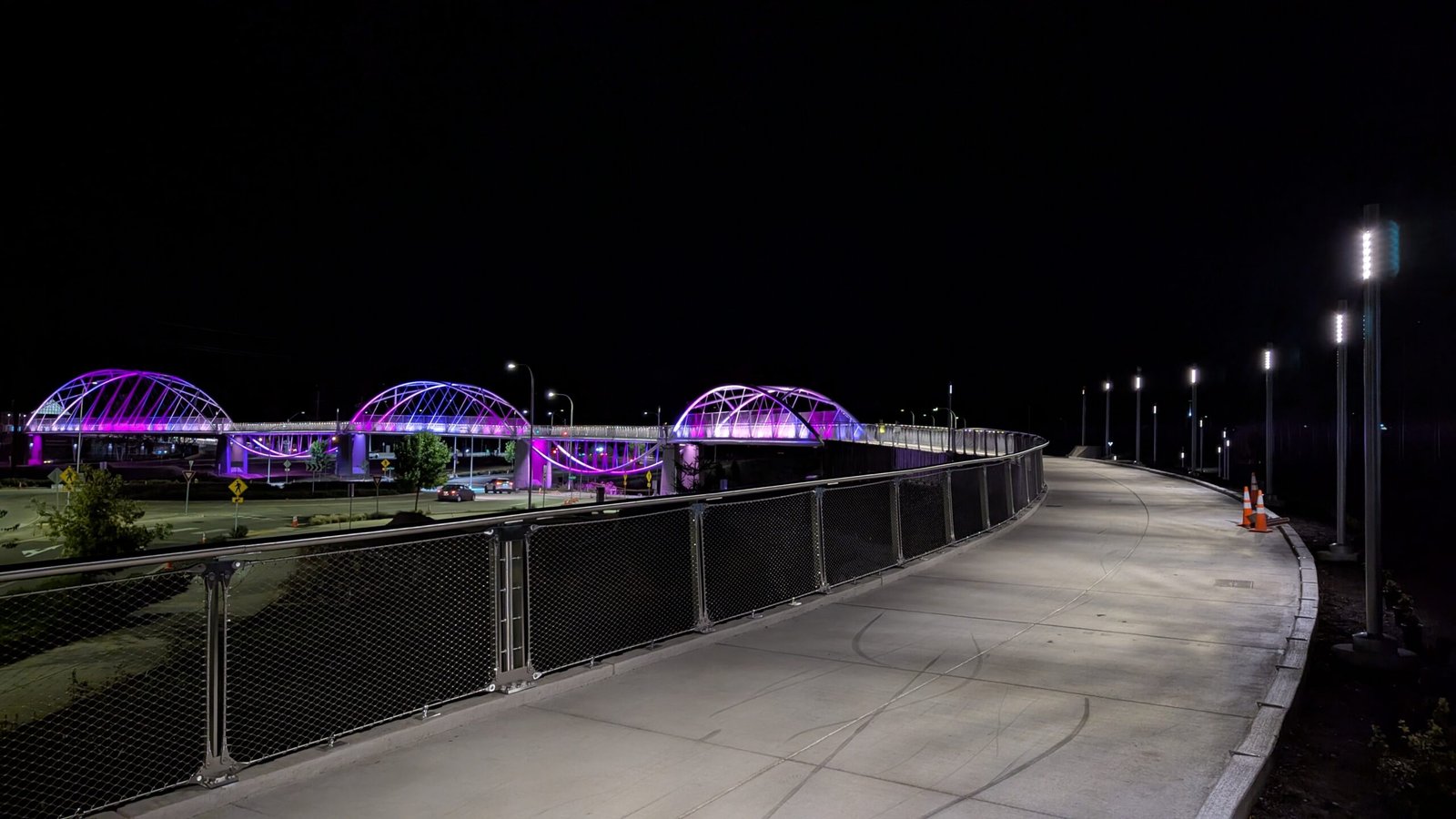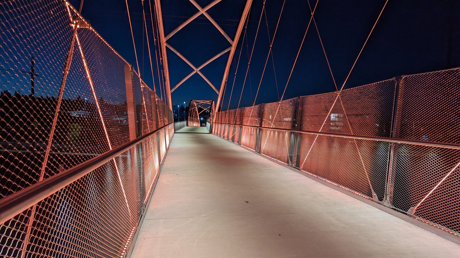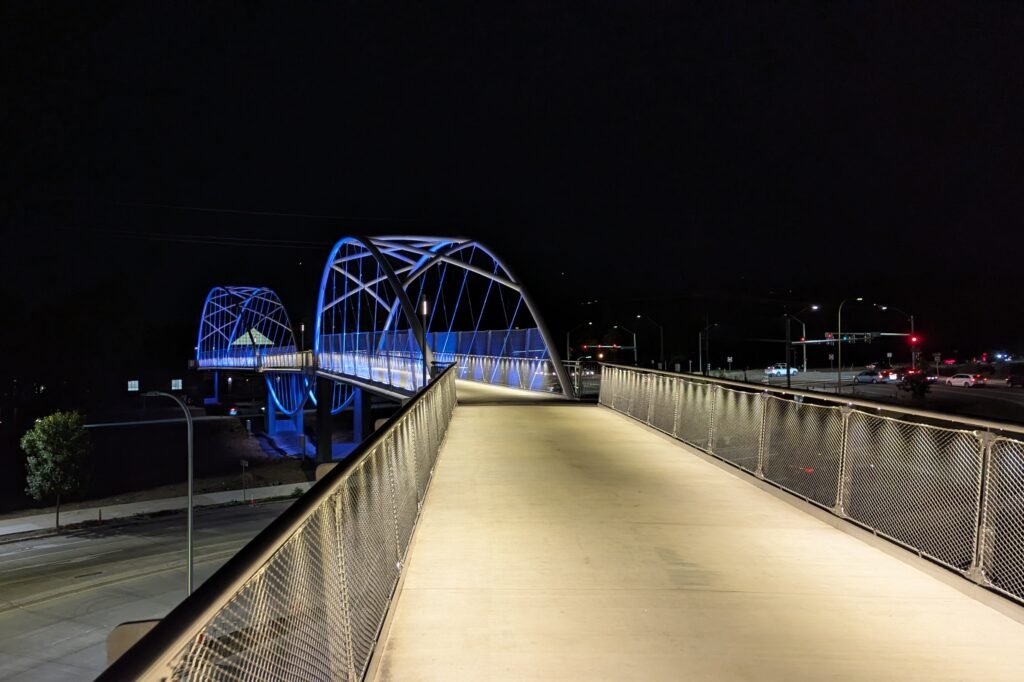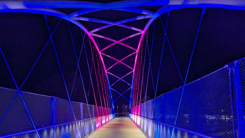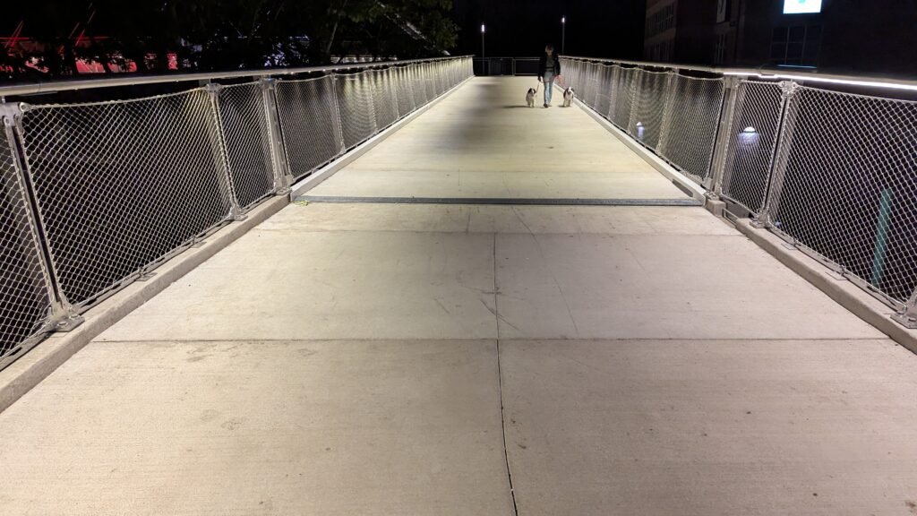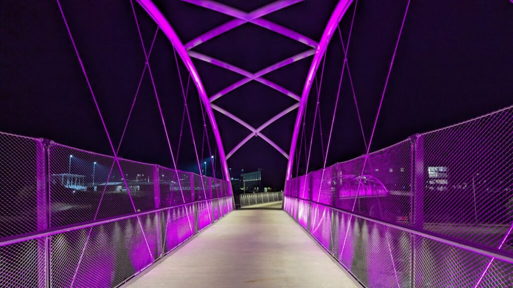 As Sherwood’s new bicycle and pedestrian bridge opened this fall, the city gained not only a major link in the multimodal transportation network but also an iconic landmark. After dark, the sculptural structure comes to life with color changing architectural lights. The lighting system includes 214 fixtures enabling immense possibilities for future programming. Initially, the bridge will feature twenty scenes on a calendar schedule to debut throughout 2025 and 2026. This post captures the bridge in a range of colors and patterns from several viewpoints, taken during the multi-night testing and programming process in August and September 2025.