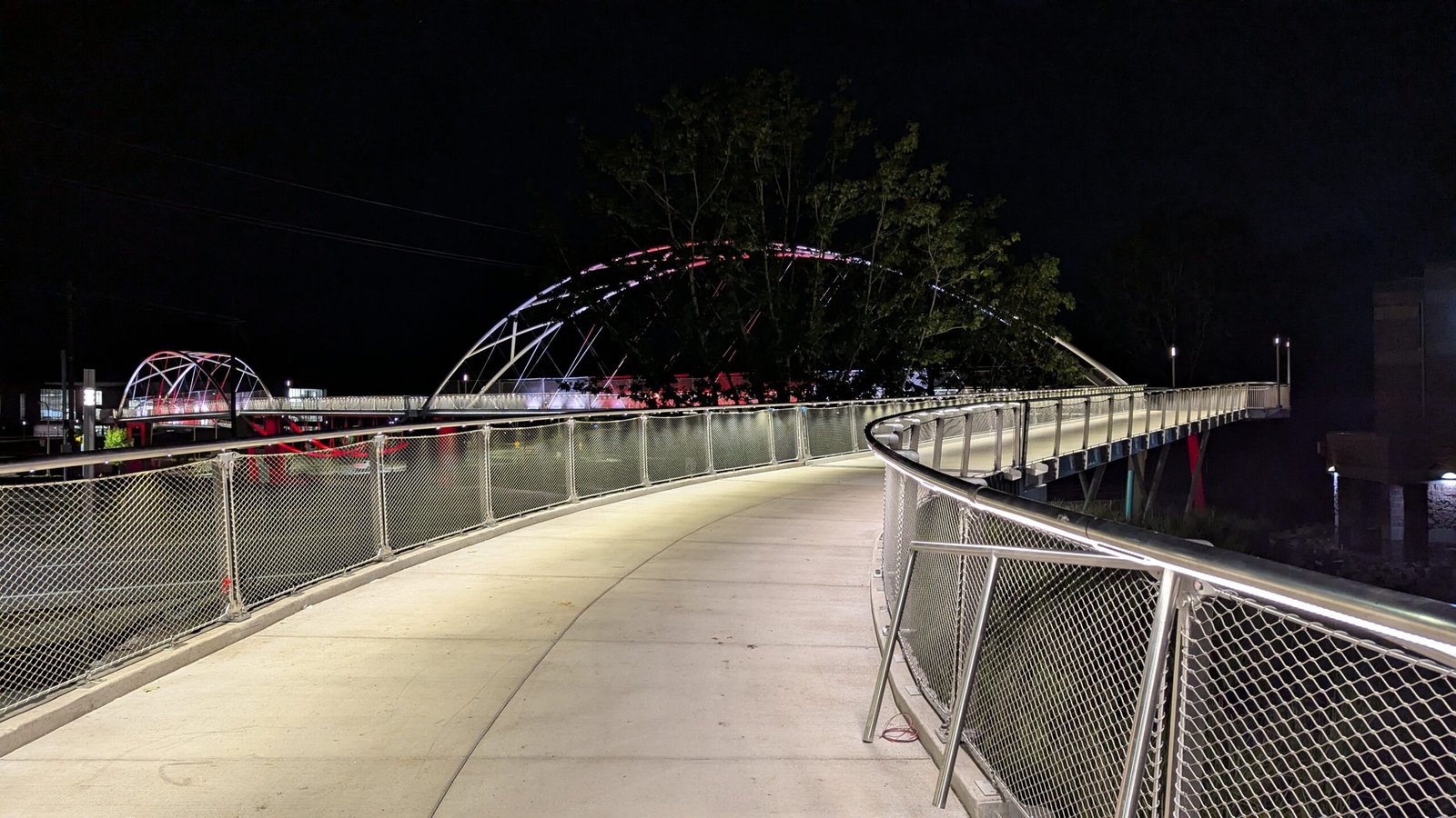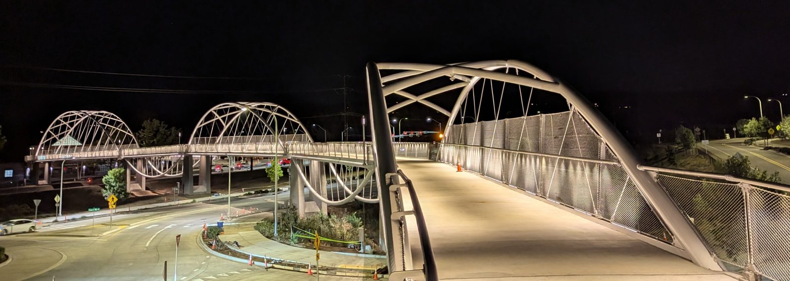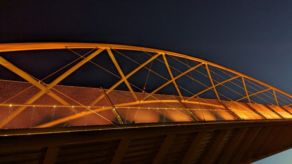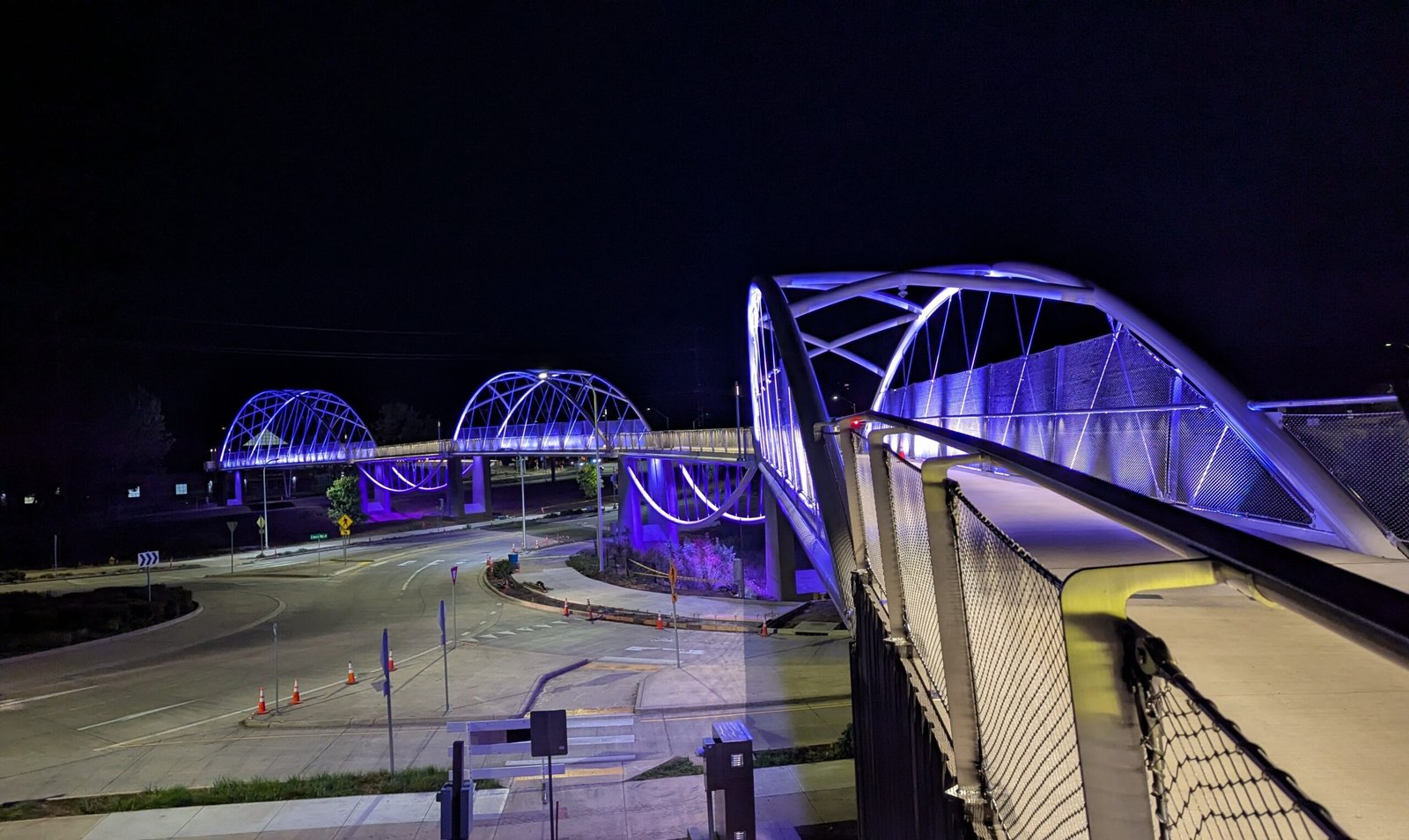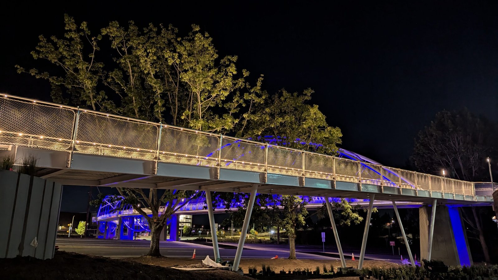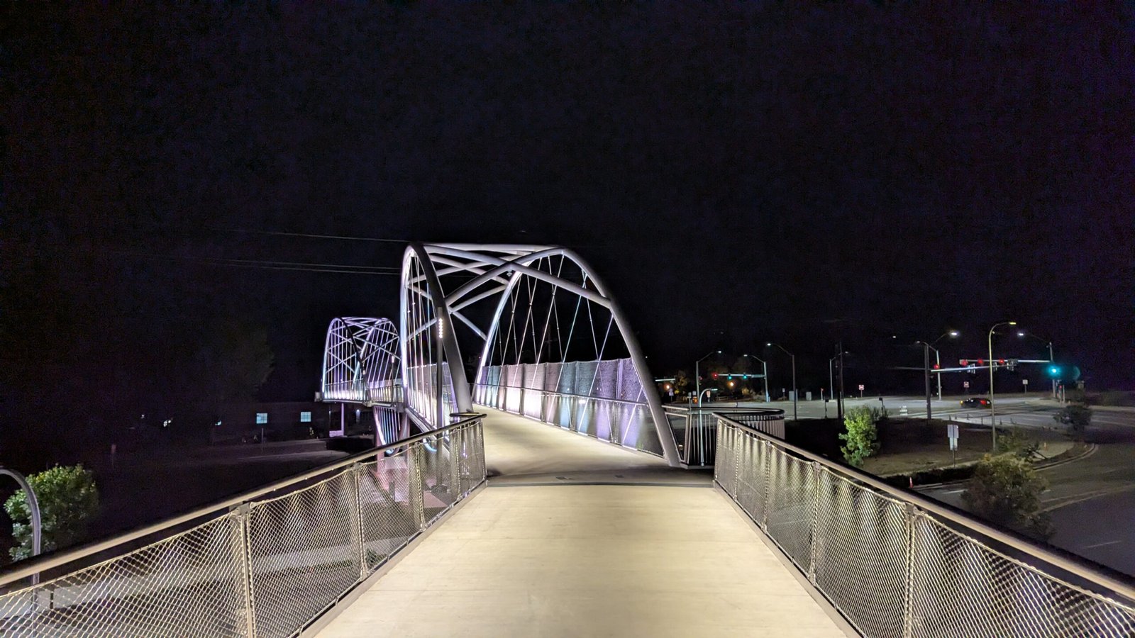 As Sherwood’s new bicycle and pedestrian bridge opened this fall, the city gained not only a major link in the multimodal transportation network but also an iconic landmark. After dark, the sculptural structure comes to life with color changing architectural lights. The lighting system includes 214 fixtures enabling immense possibilities for future programming. Initially, the bridge will feature twenty scenes on a calendar schedule to debut throughout 2025 and 2026. This post captures the bridge in a range of colors and patterns from several viewpoints, taken during the multi-night testing and programming process in August and September 2025.