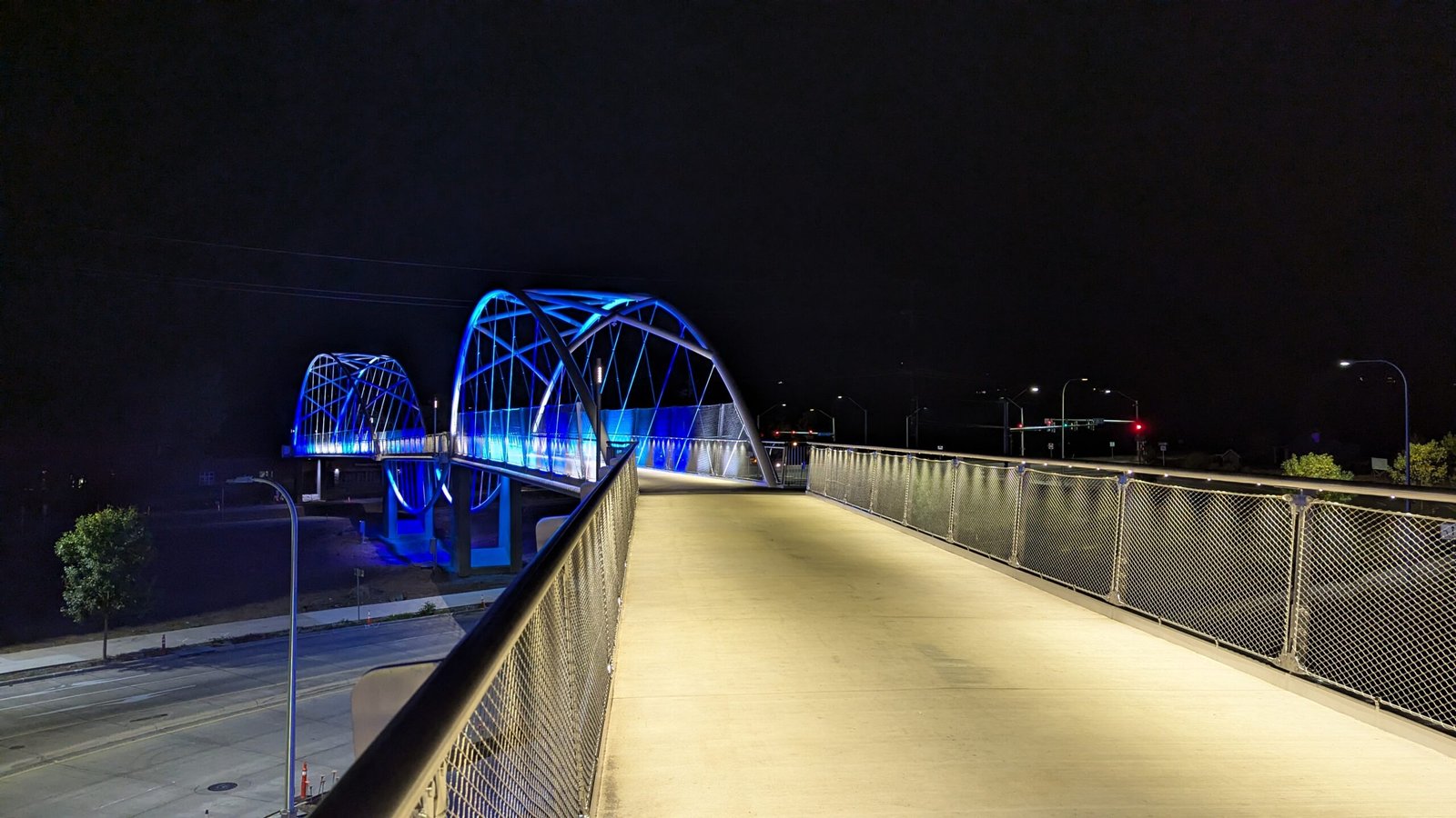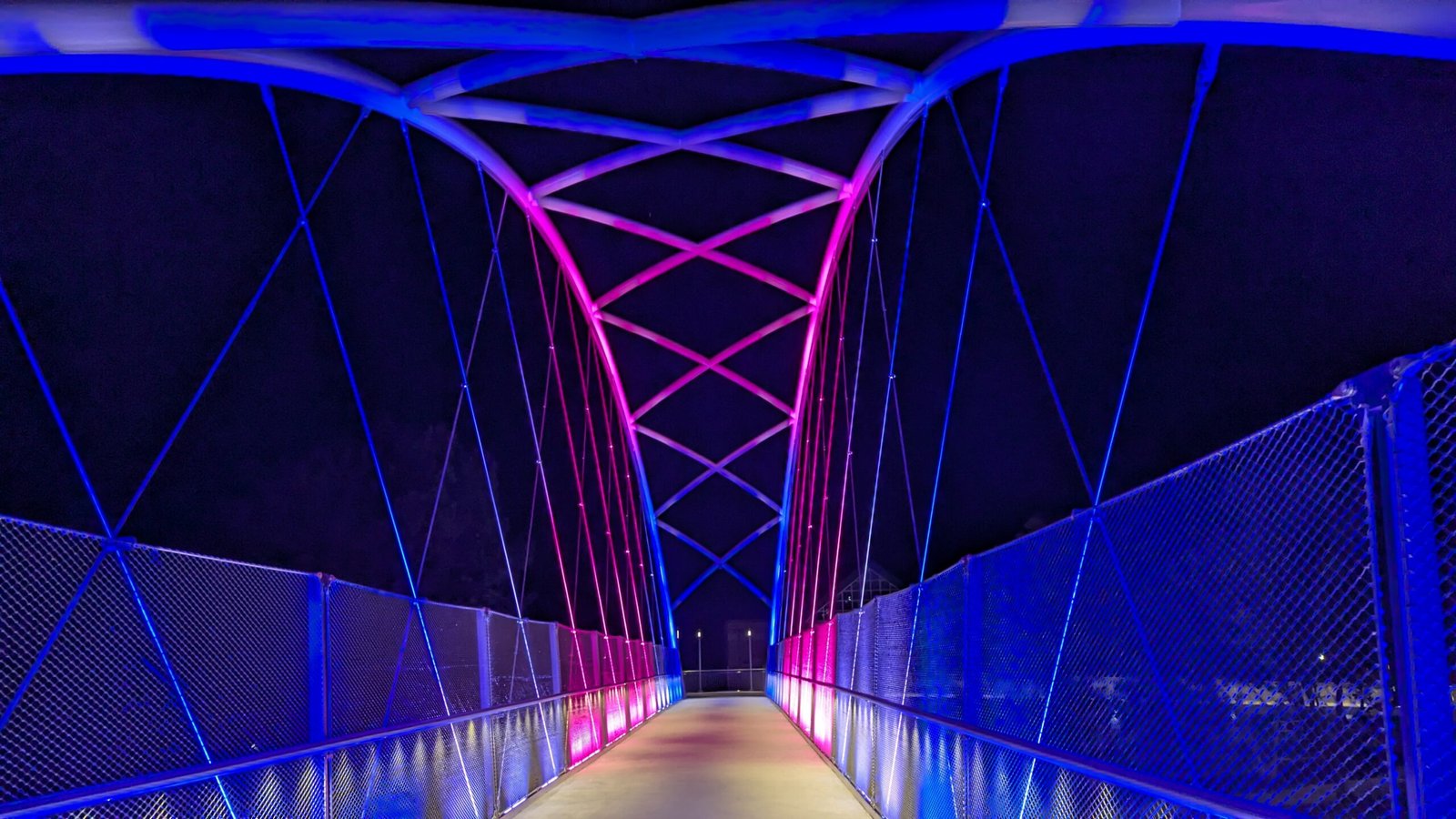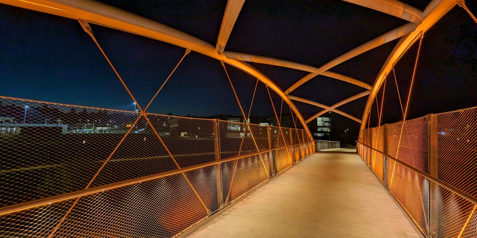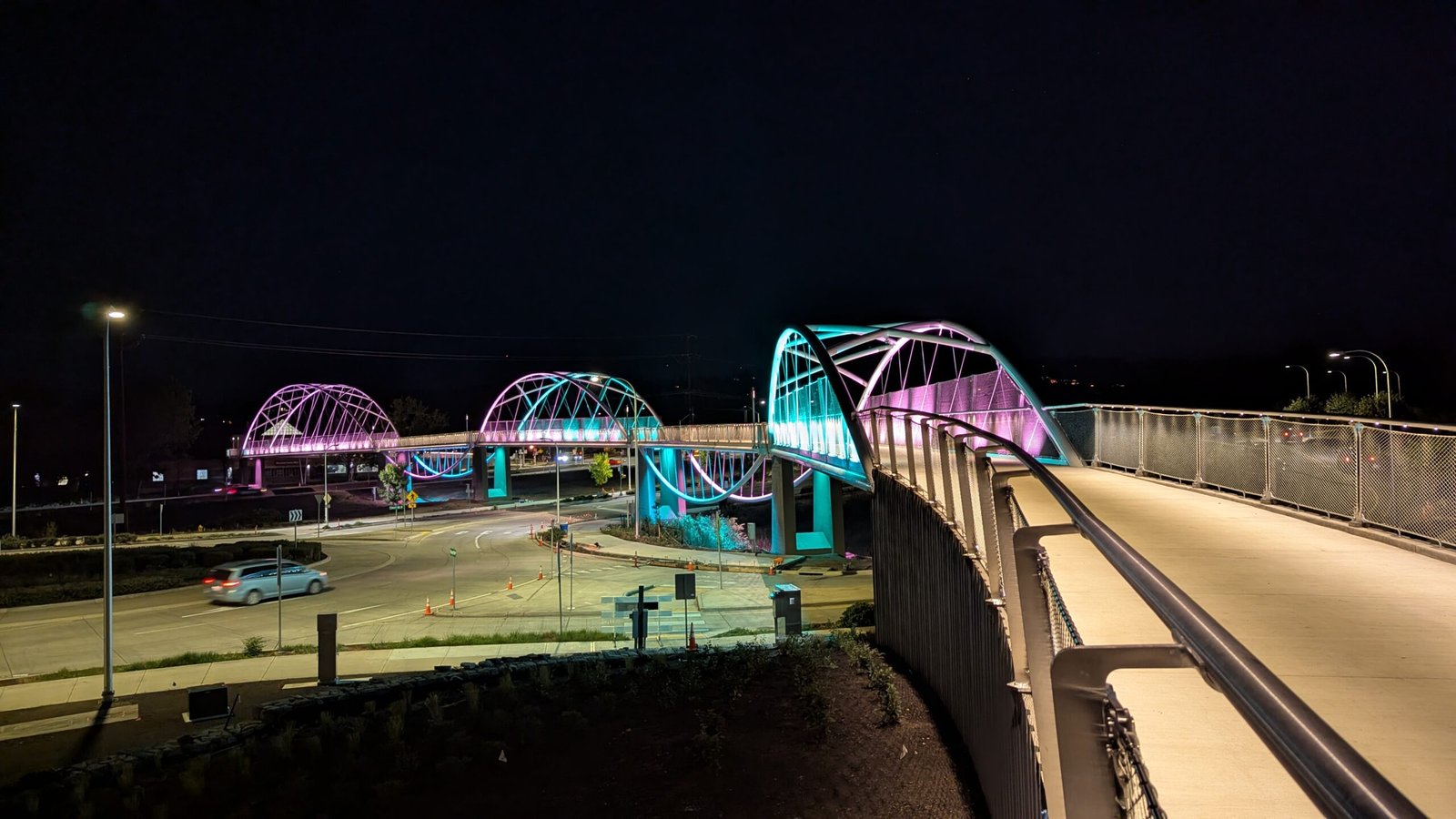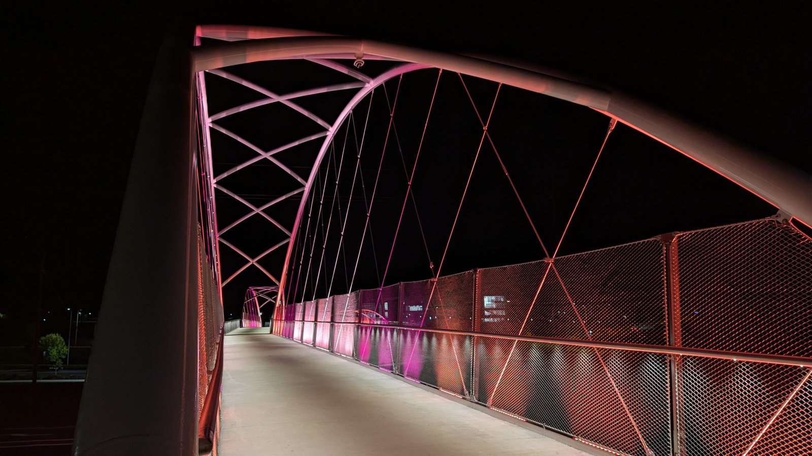 As Sherwood’s new bicycle and pedestrian bridge opened this fall, the city gained not only a major link in the multimodal transportation network but also an iconic landmark. After dark, the sculptural structure comes to life with color changing architectural lights. The lighting system includes 214 fixtures enabling immense possibilities for future programming. Initially, the bridge will feature twenty scenes on a calendar schedule to debut throughout 2025 and 2026. This post captures the bridge in a range of colors and patterns from several viewpoints, taken during the multi-night testing and programming process in August and September 2025.