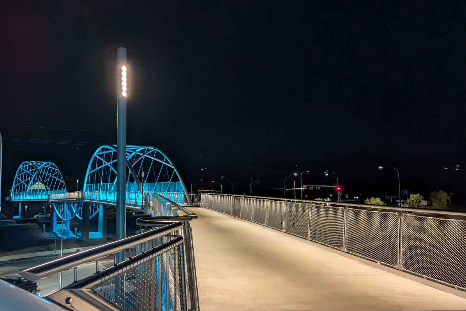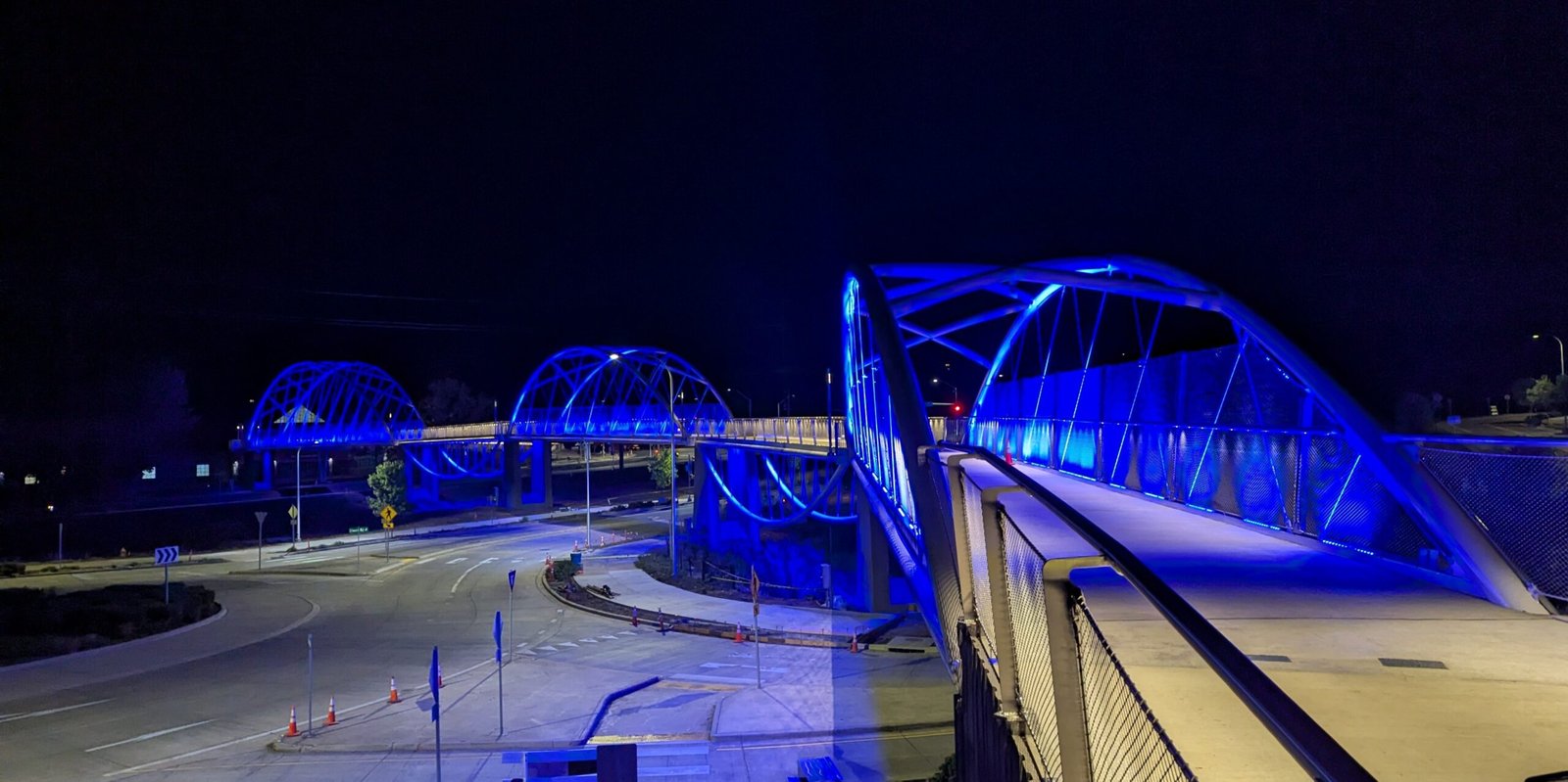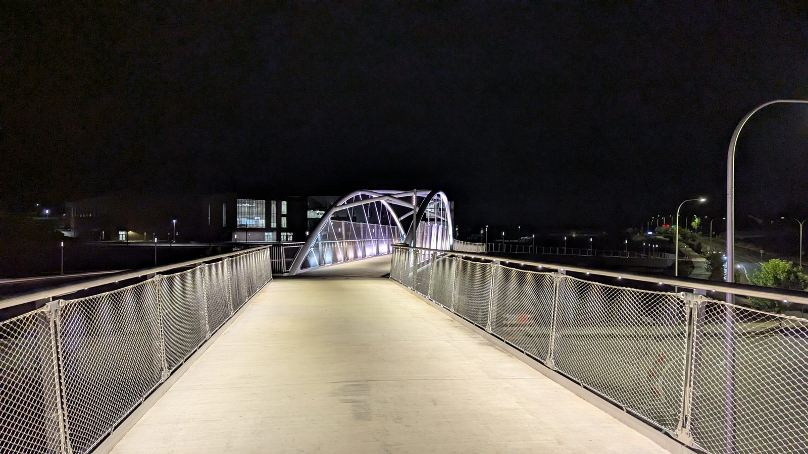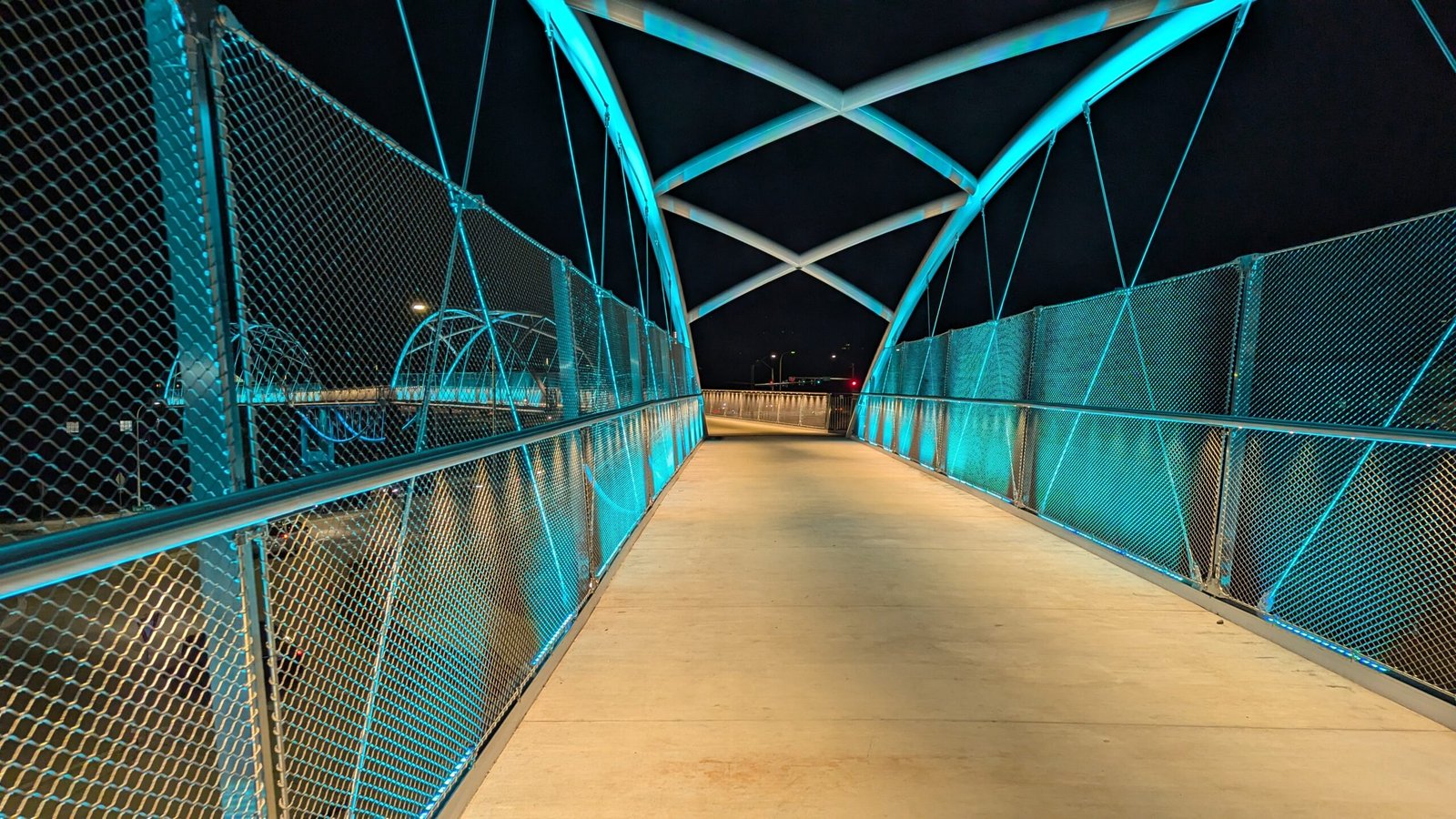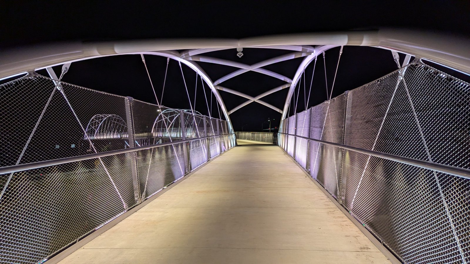 As Sherwood’s new bicycle and pedestrian bridge opened this fall, the city gained not only a major link in the multimodal transportation network but also an iconic landmark. After dark, the sculptural structure comes to life with color changing architectural lights. The lighting system includes 214 fixtures enabling immense possibilities for future programming. Initially, the bridge will feature twenty scenes on a calendar schedule to debut throughout 2025 and 2026. This post captures the bridge in a range of colors and patterns from several viewpoints, taken during the multi-night testing and programming process in August and September 2025.