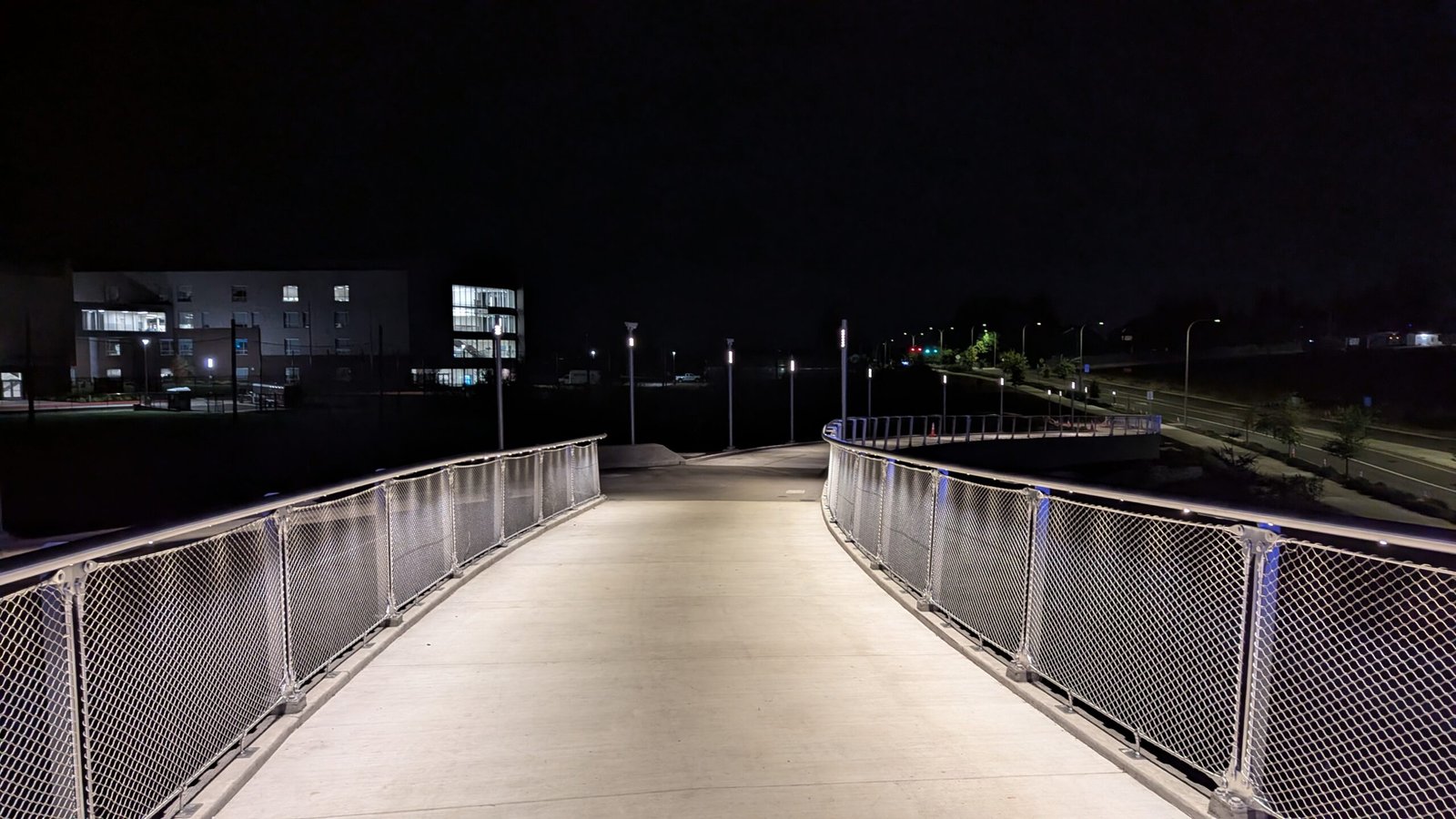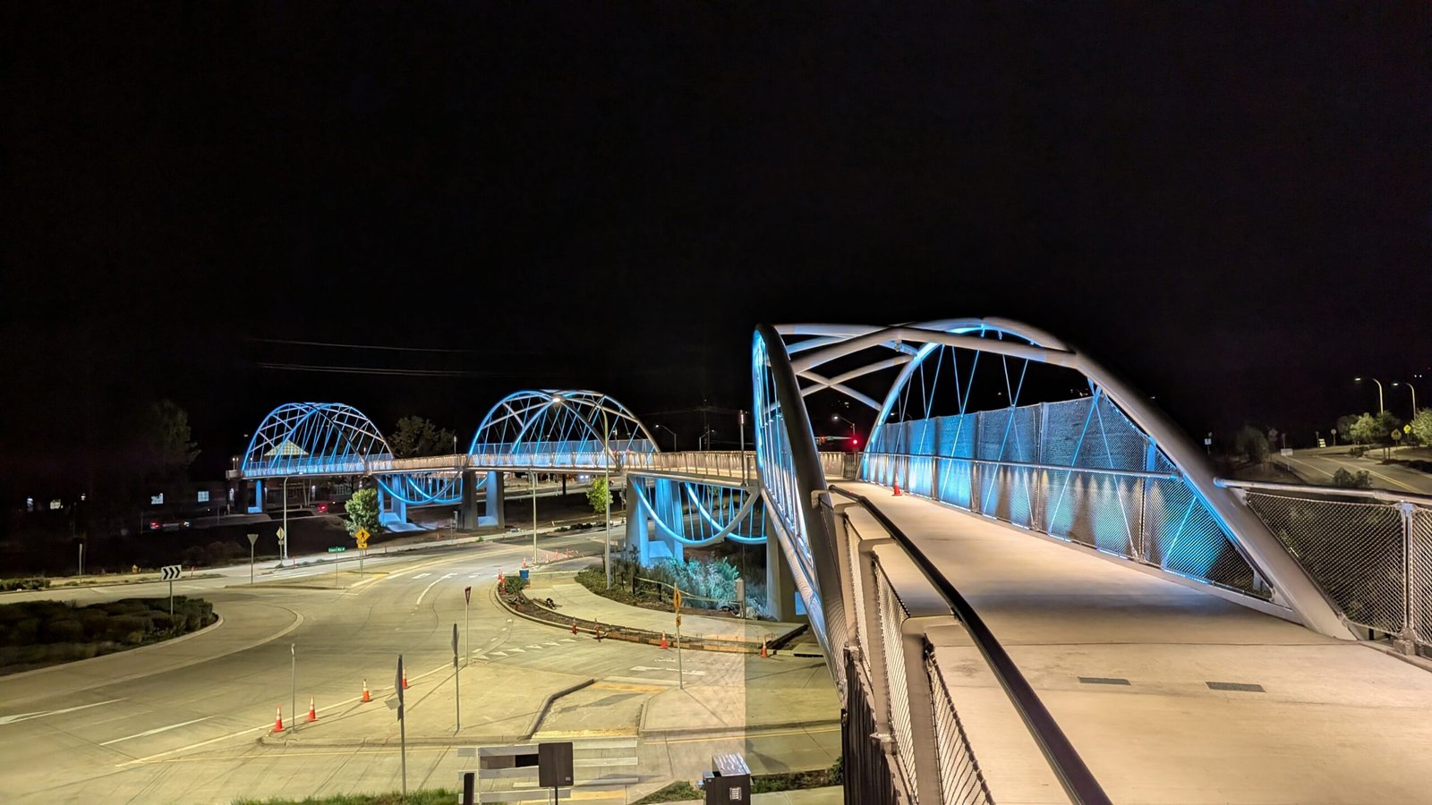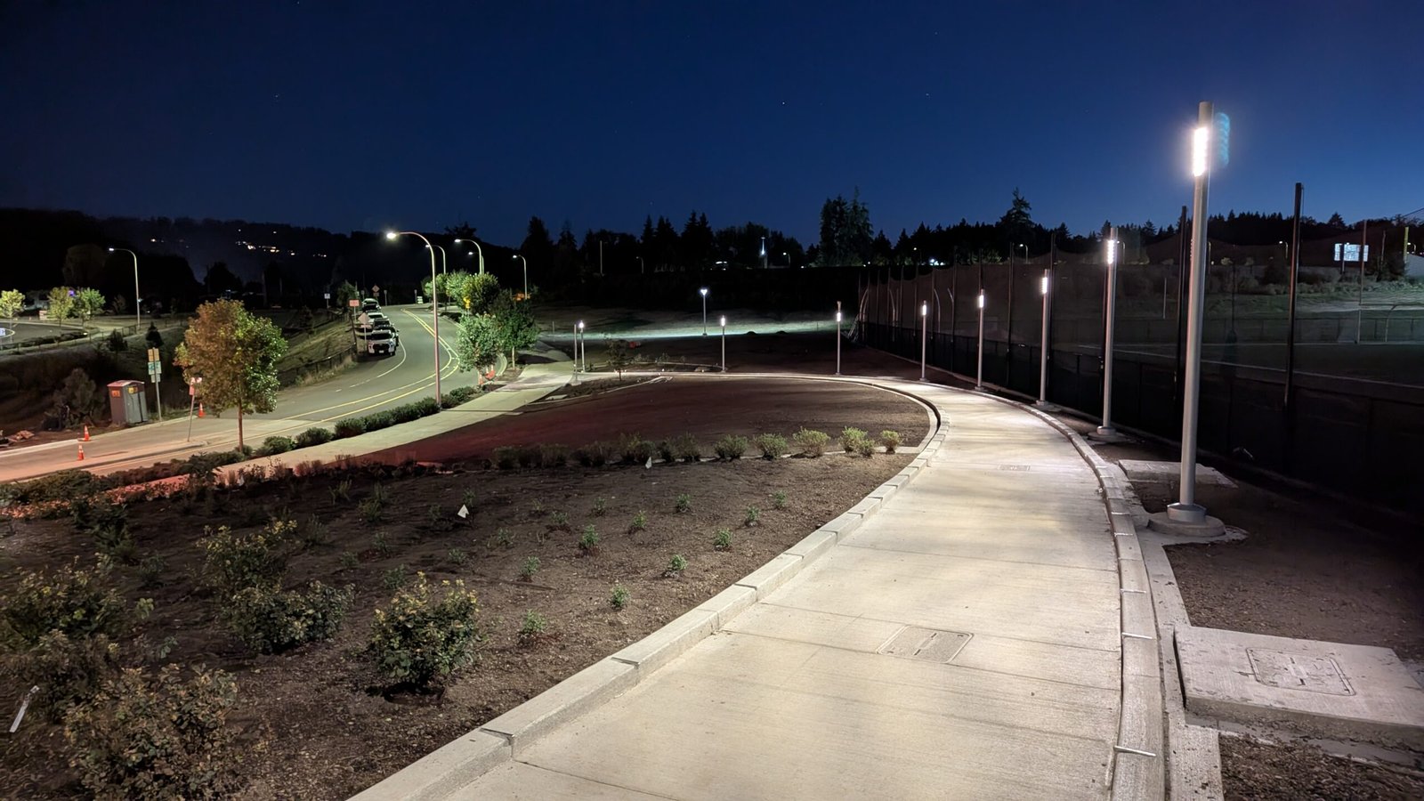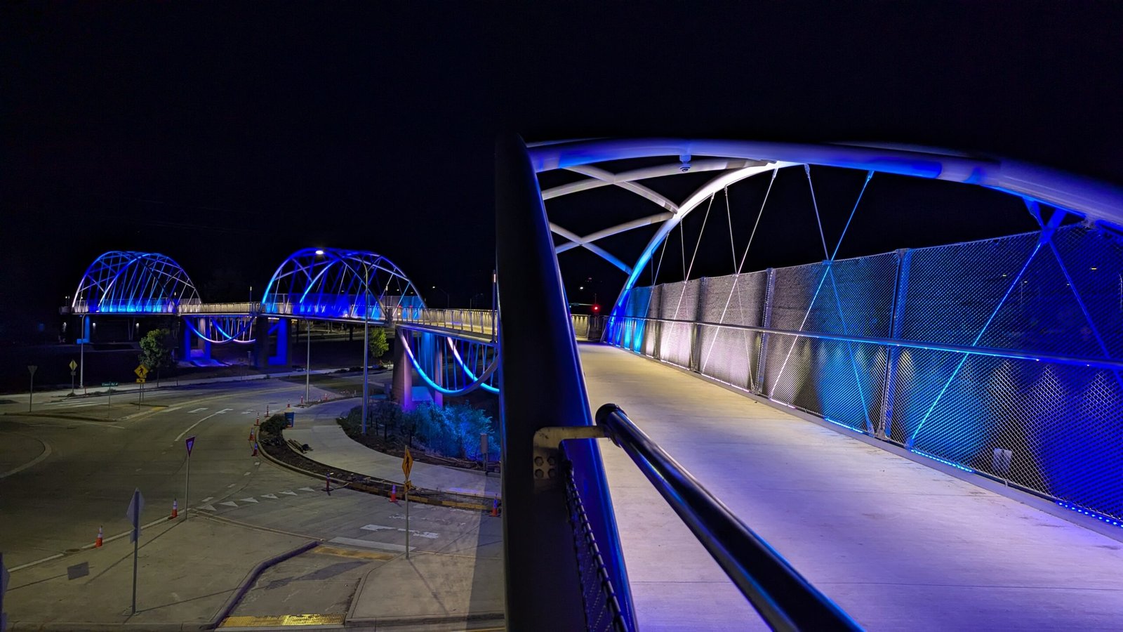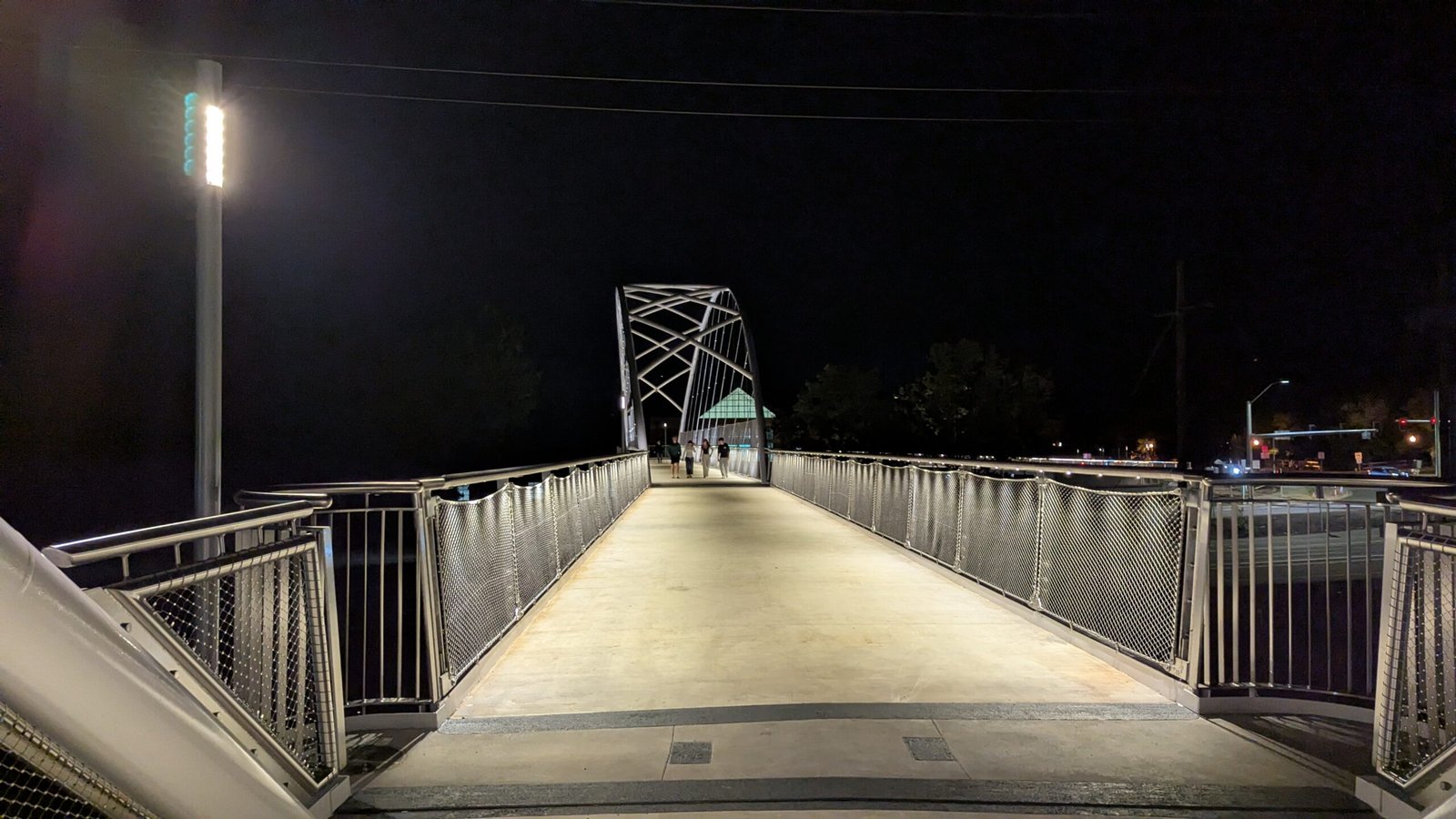 As Sherwood’s new bicycle and pedestrian bridge opened this fall, the city gained not only a major link in the multimodal transportation network but also an iconic landmark. After dark, the sculptural structure comes to life with color changing architectural lights. The lighting system includes 214 fixtures enabling immense possibilities for future programming. Initially, the bridge will feature twenty scenes on a calendar schedule to debut throughout 2025 and 2026. This post captures the bridge in a range of colors and patterns from several viewpoints, taken during the multi-night testing and programming process in August and September 2025.