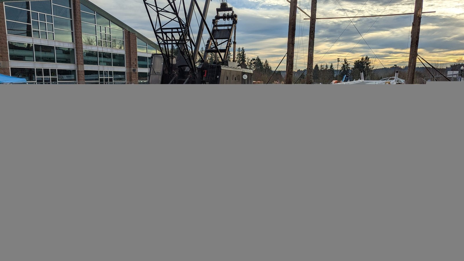 The first arch is welded together outside of the YMCA pool. Steel framing for the span 5 bridge deck is assembled along Sunset Blvd. The first arch for span 5 is lifted into place on a temporary shoring tower. The steel deck edge assembly features a smooth exterior fascia articulated by alternating diagonal connection plates…