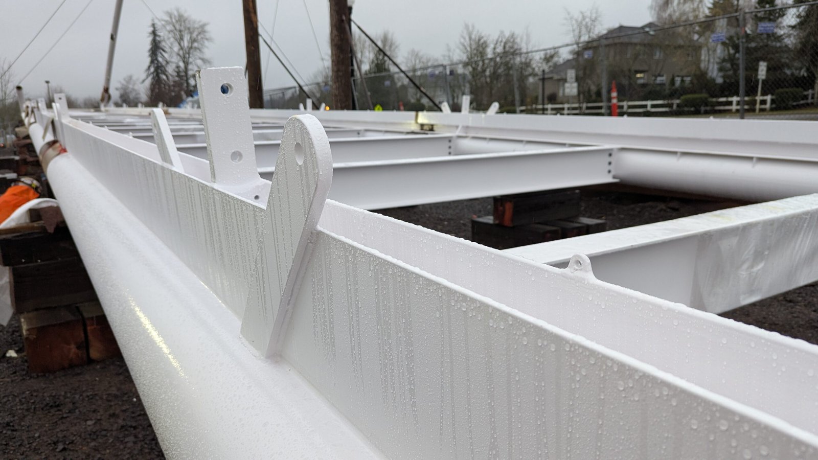 Each of the five bridge spans is simply supported. This means that they are structurally independent and self-supporting. The upright tied arches and inverted arch trusses are all biaxially symmetrical and can be lifted from four symmetrically located points. These trusses were assembled on site and in the Thompson Metal Fab shop in Vancouver, WA prior to erection to minimize road closures and traffic impacts.